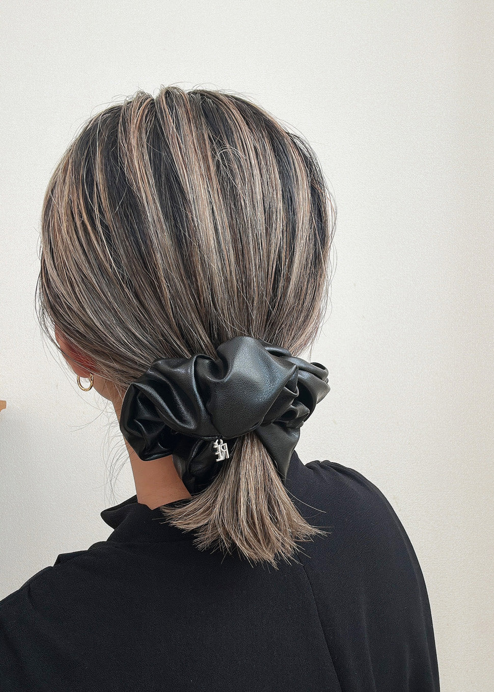 シーンや人を選ばず使えるシュシュですが、ハイトーンヘアと合わせるとコントラストが楽しめて◎