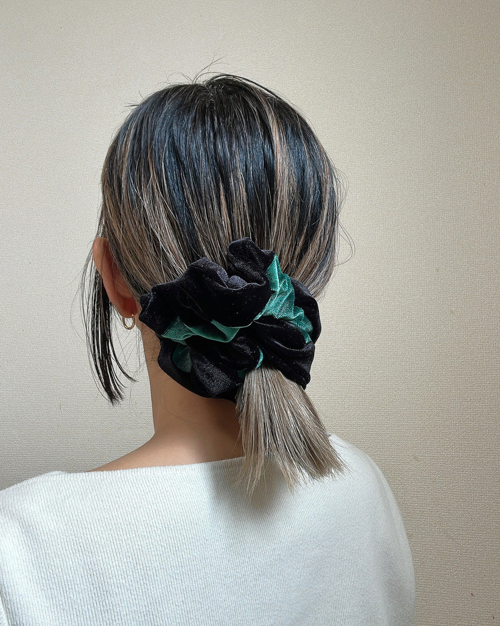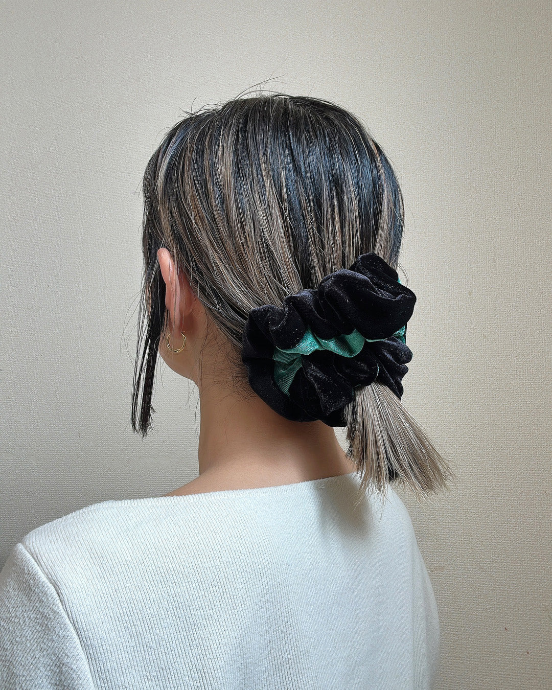 ボリュームたっぷりのシュシュは絶壁カバーにもおすすめ。