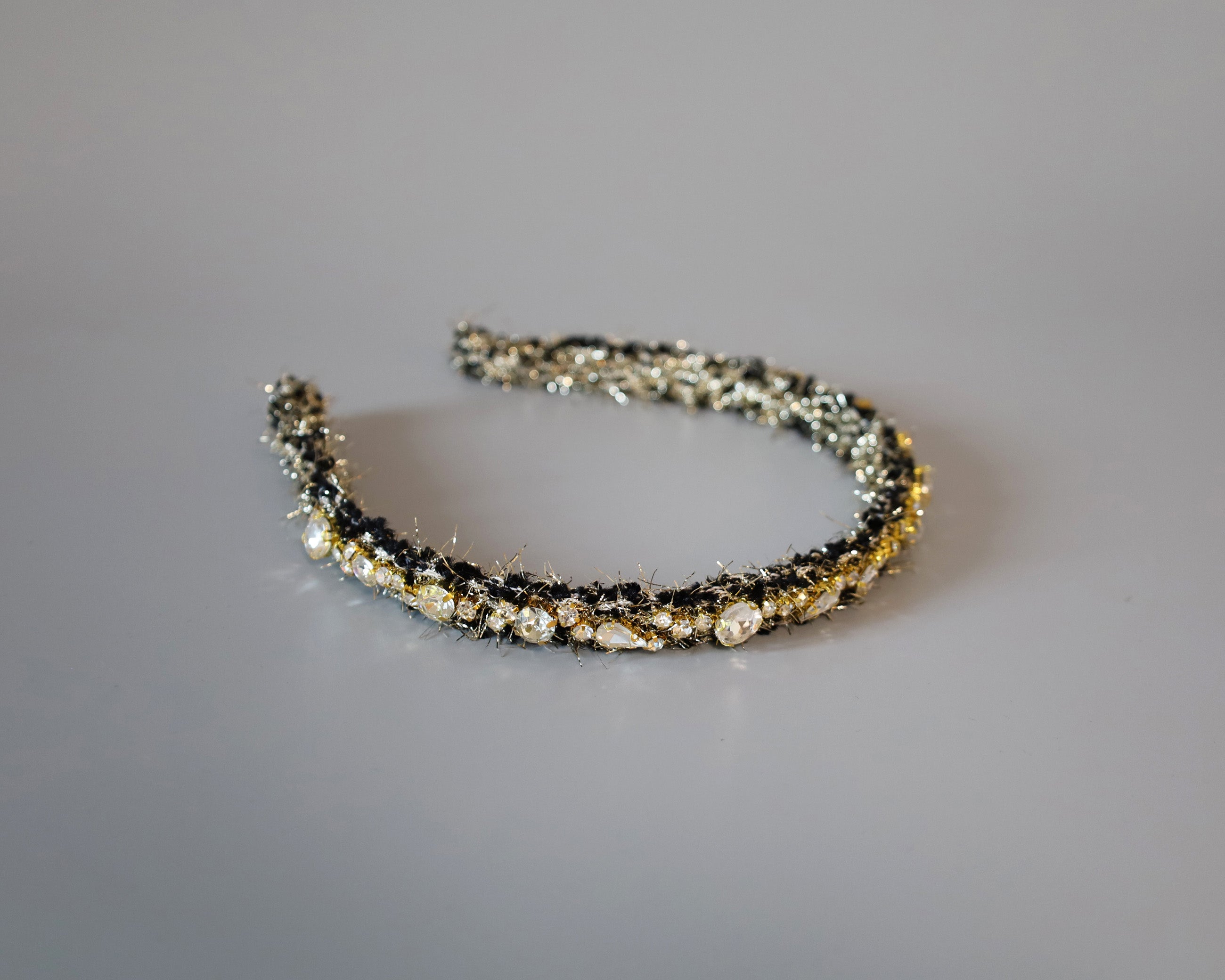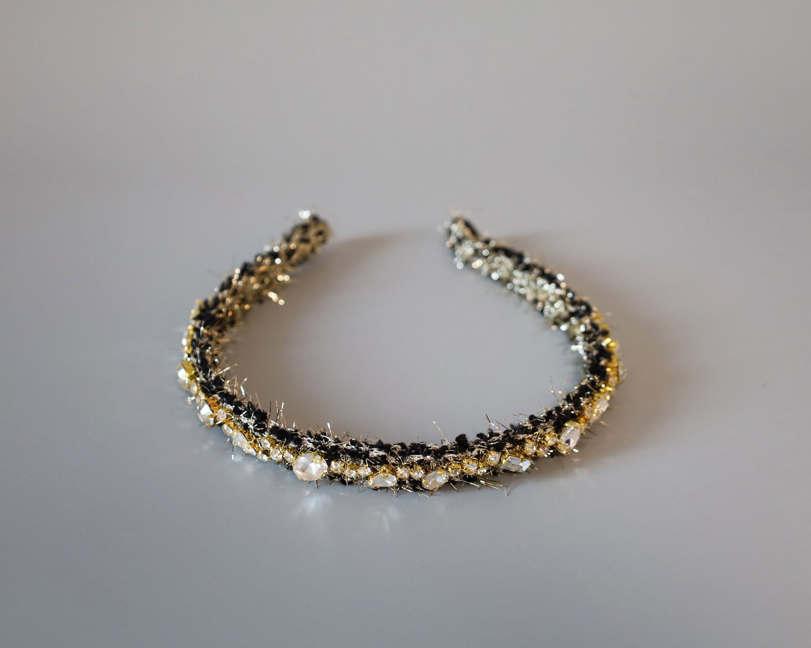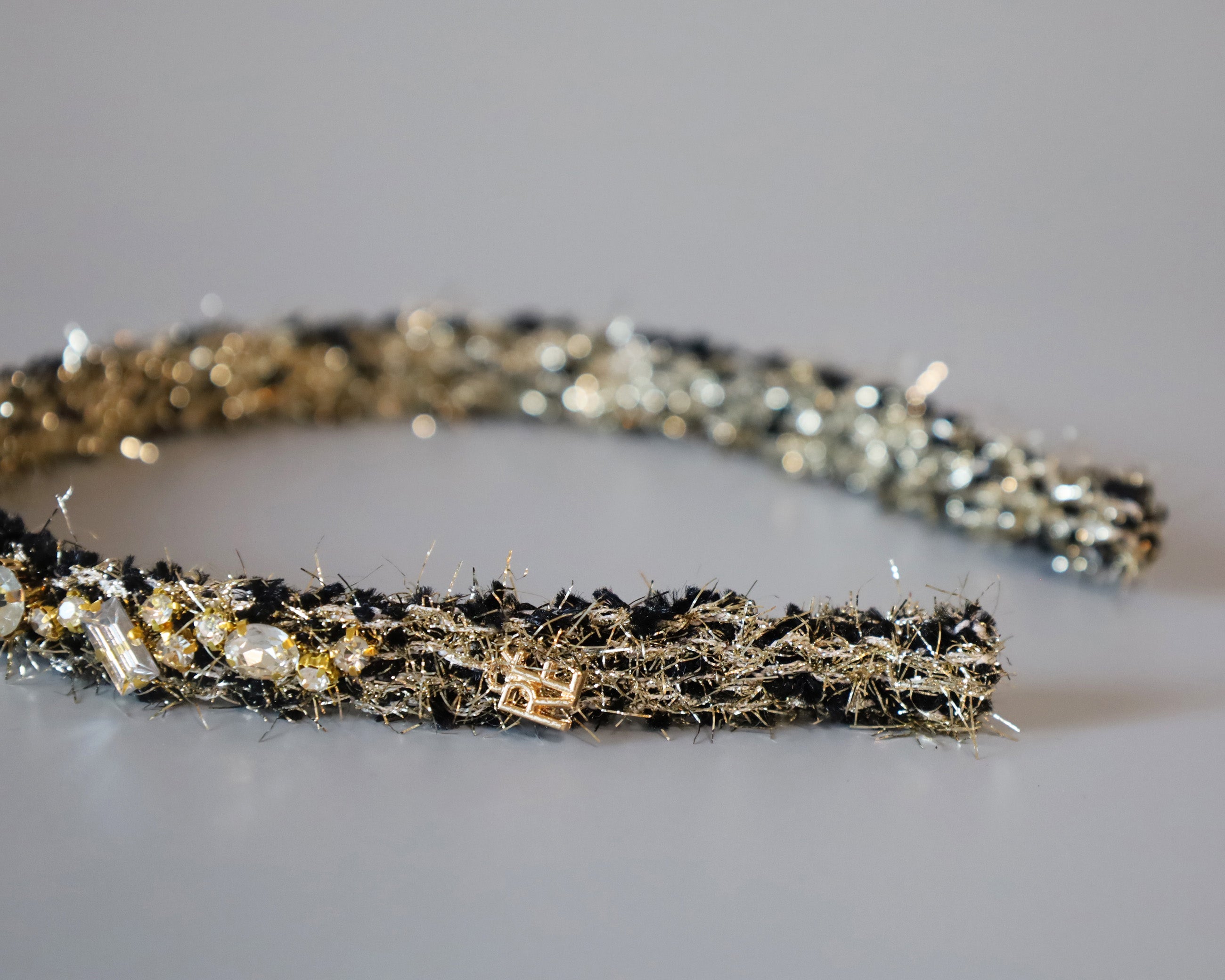 ブラック×ゴールドが大人っぽい、手足長めの質感が華やかなツイードカチューシャ。