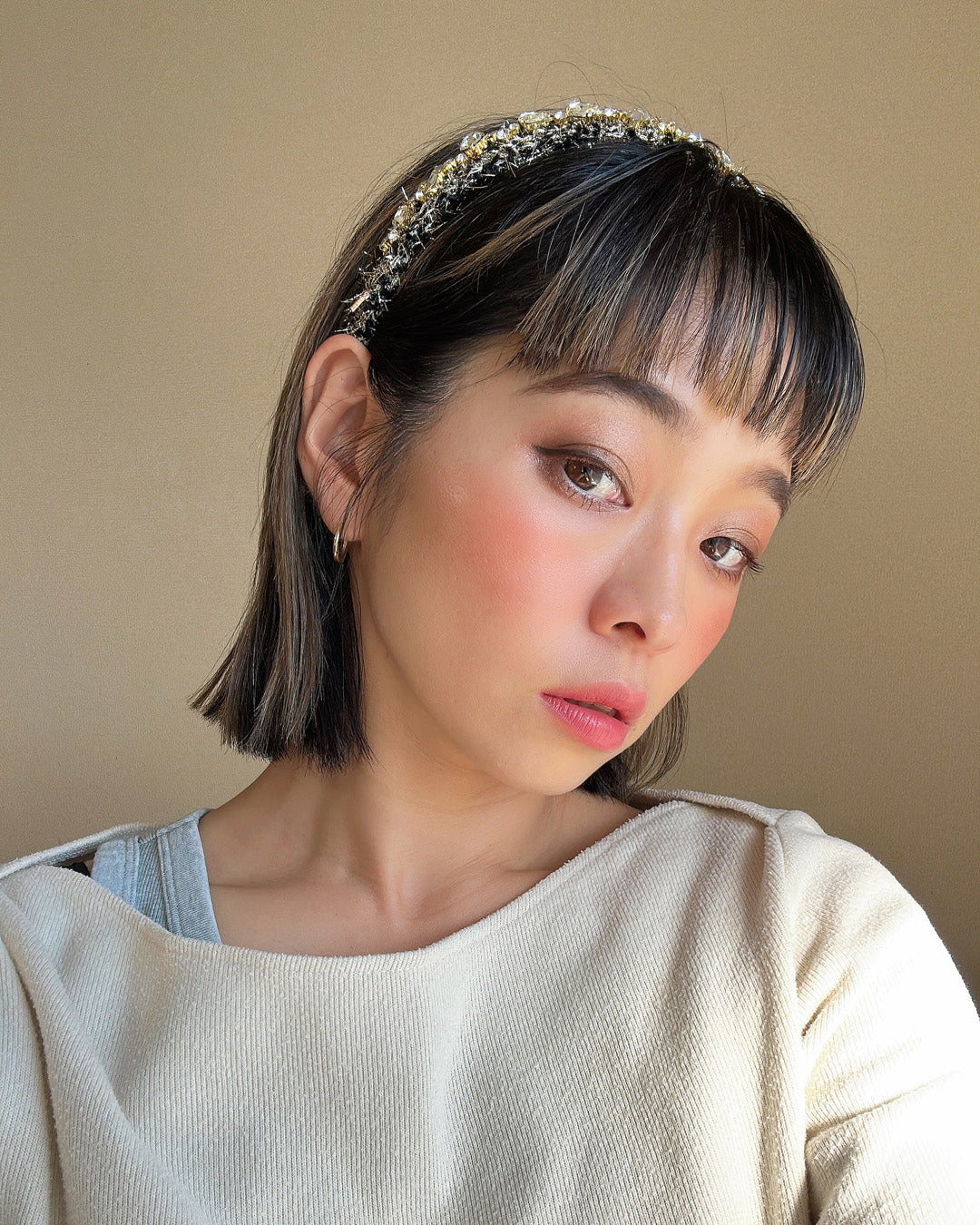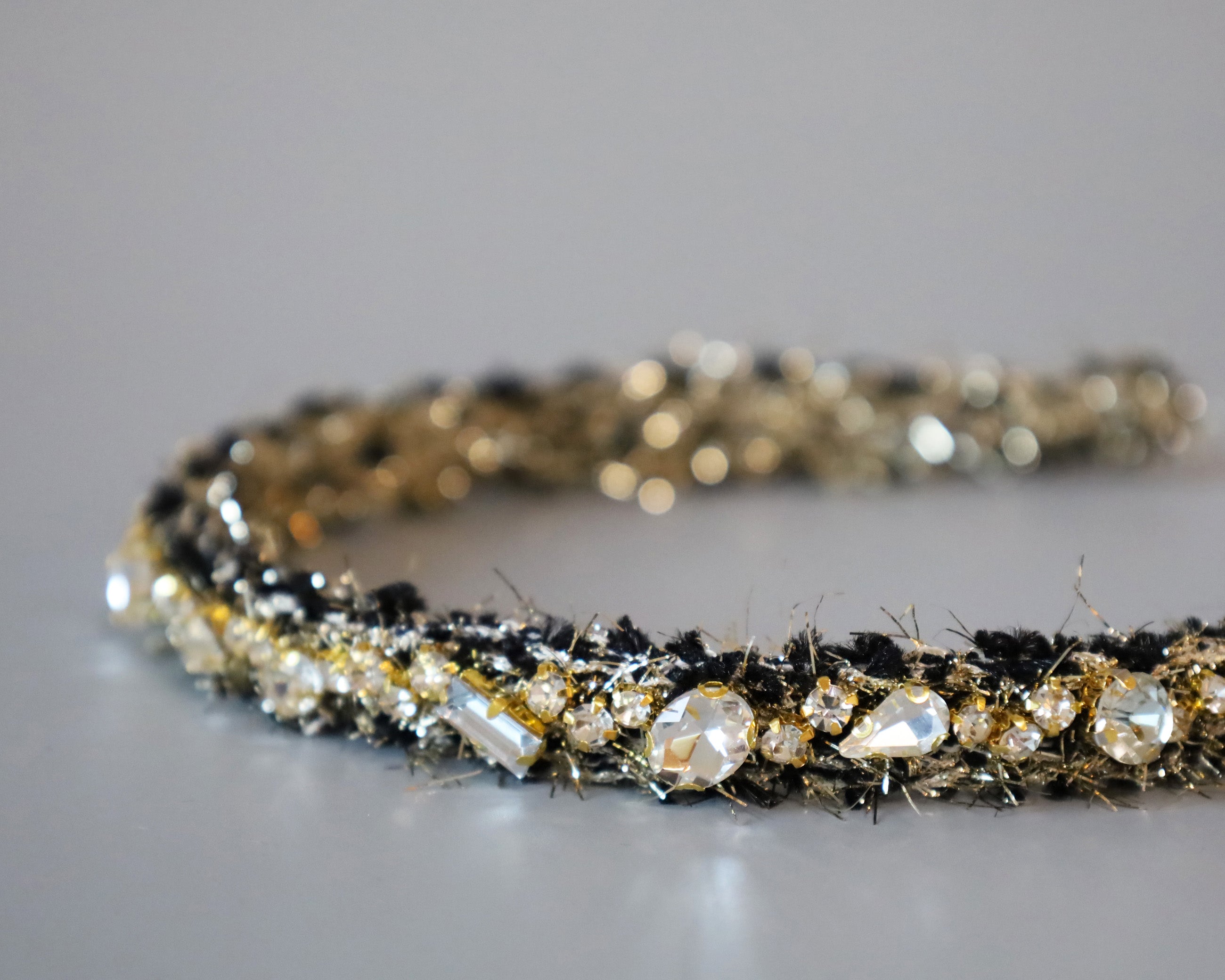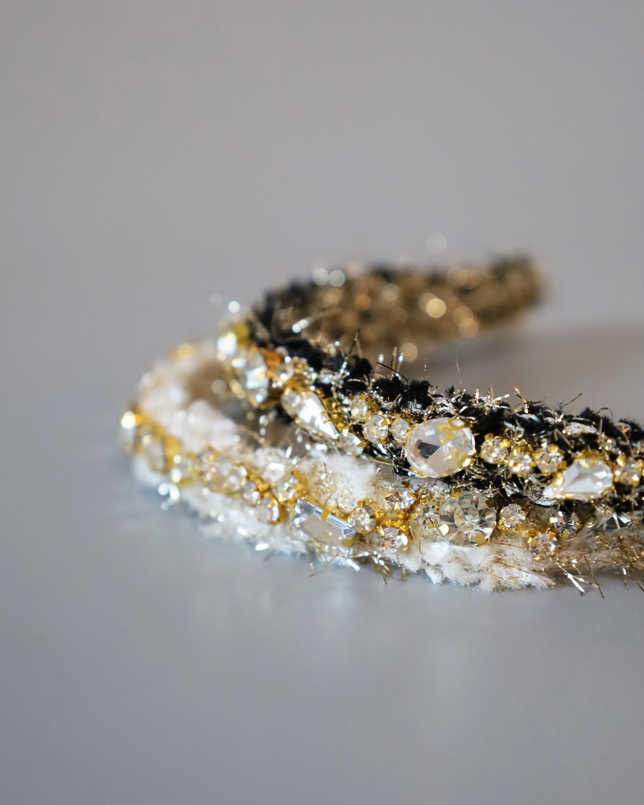 ブラック×ゴールドが大人っぽい、手足長めの質感が華やかなツイードカチューシャ。