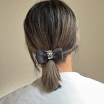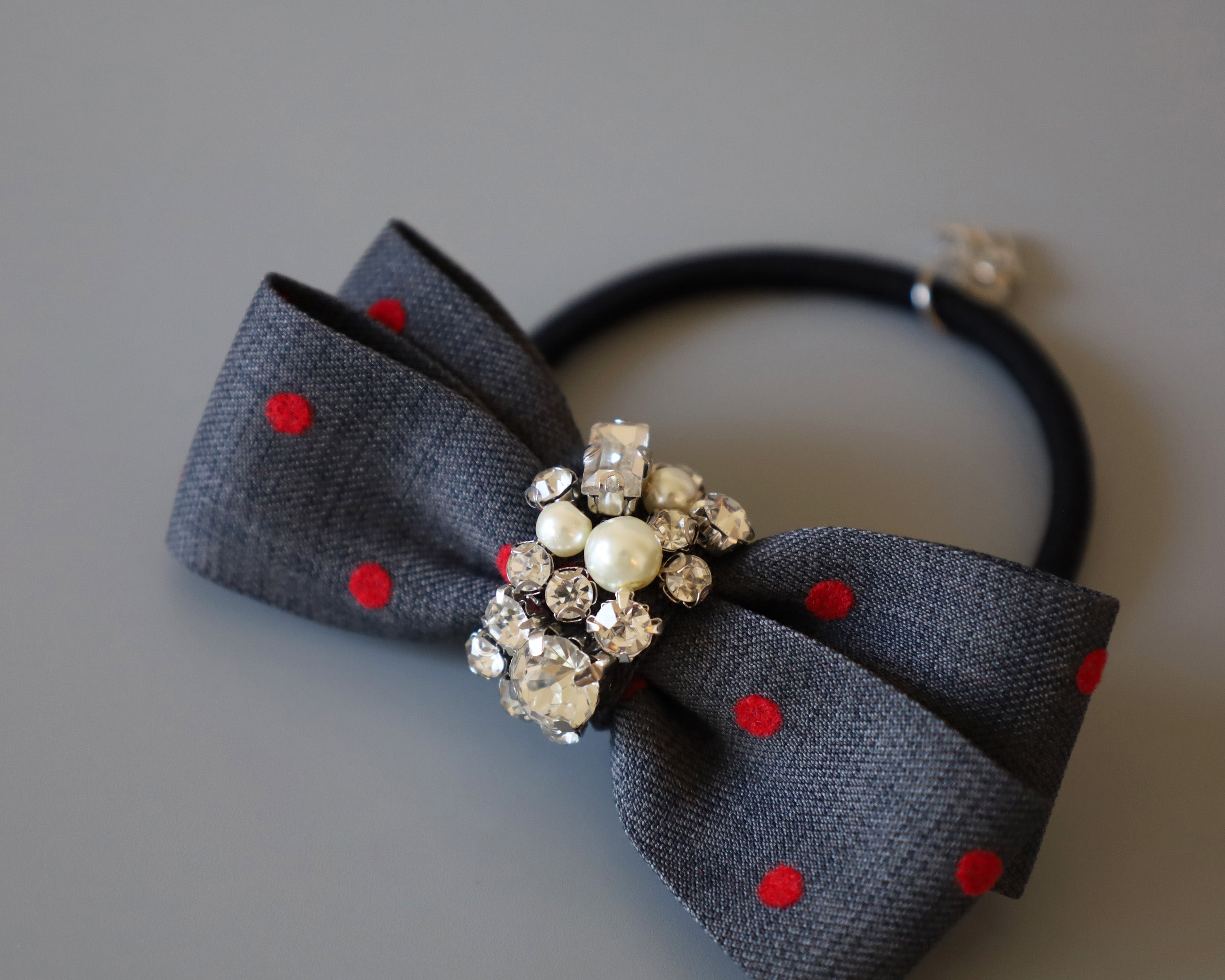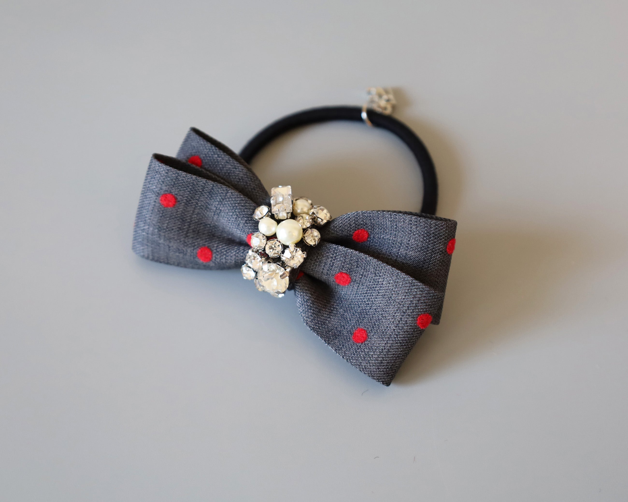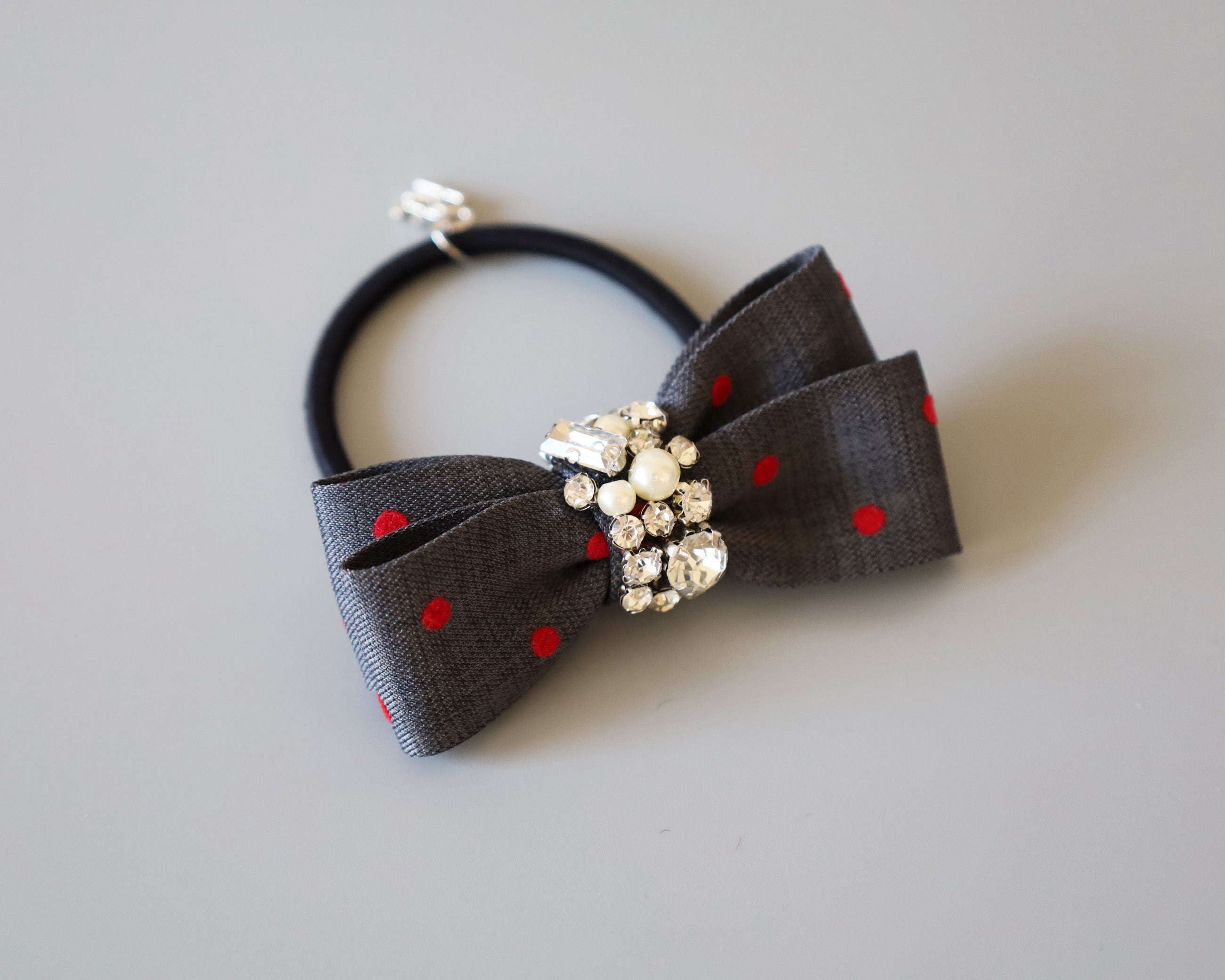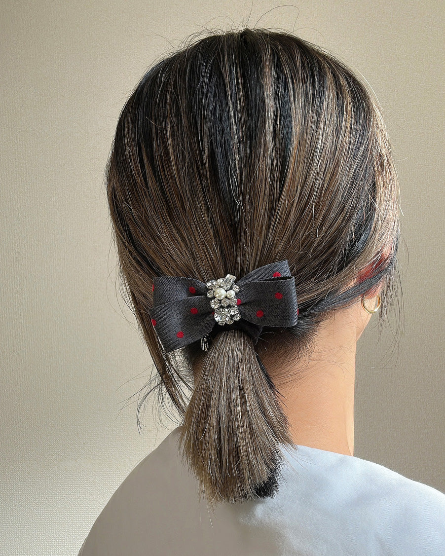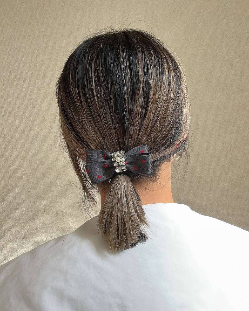 グレーの生地に赤のドットが映えるリボンポニー。