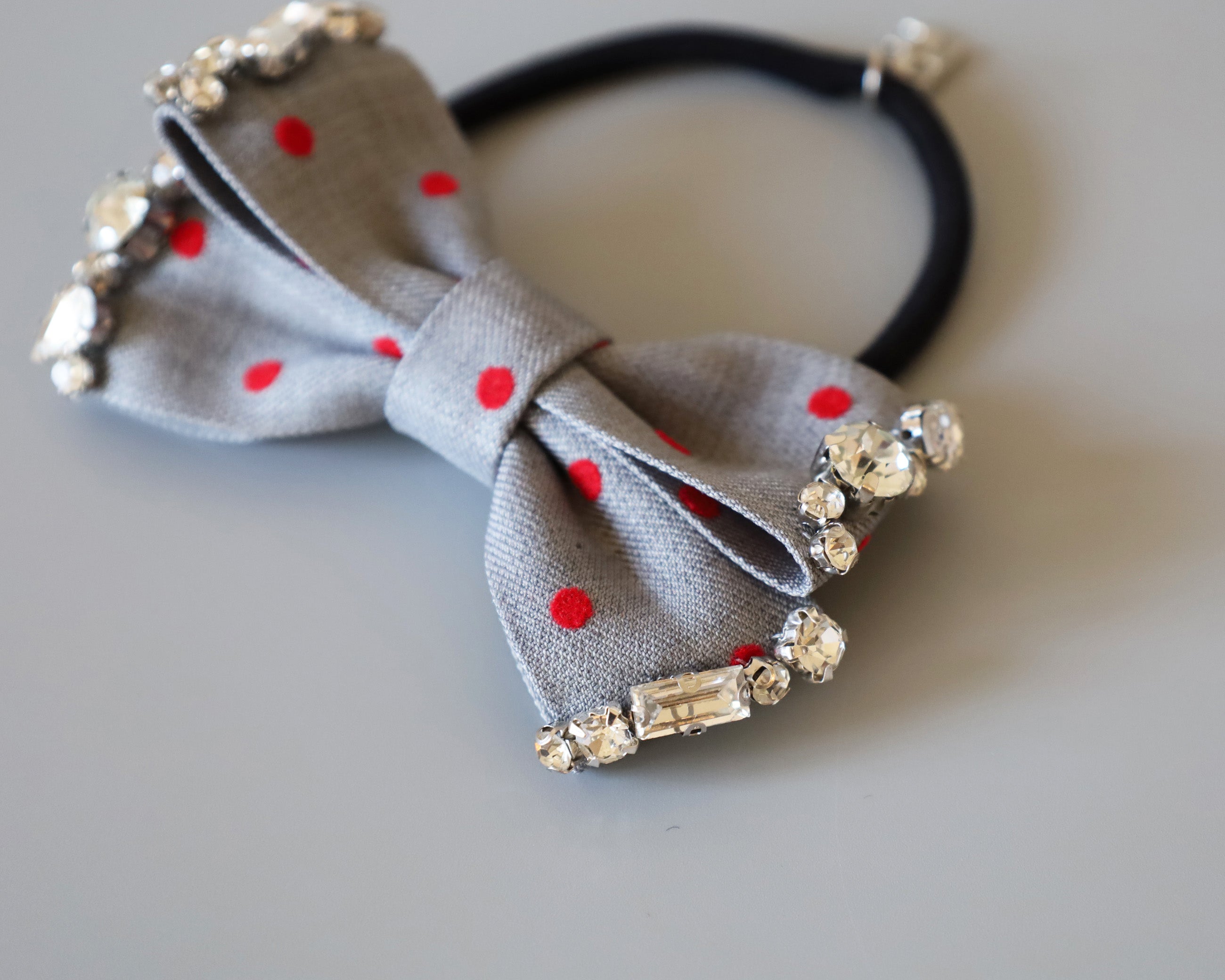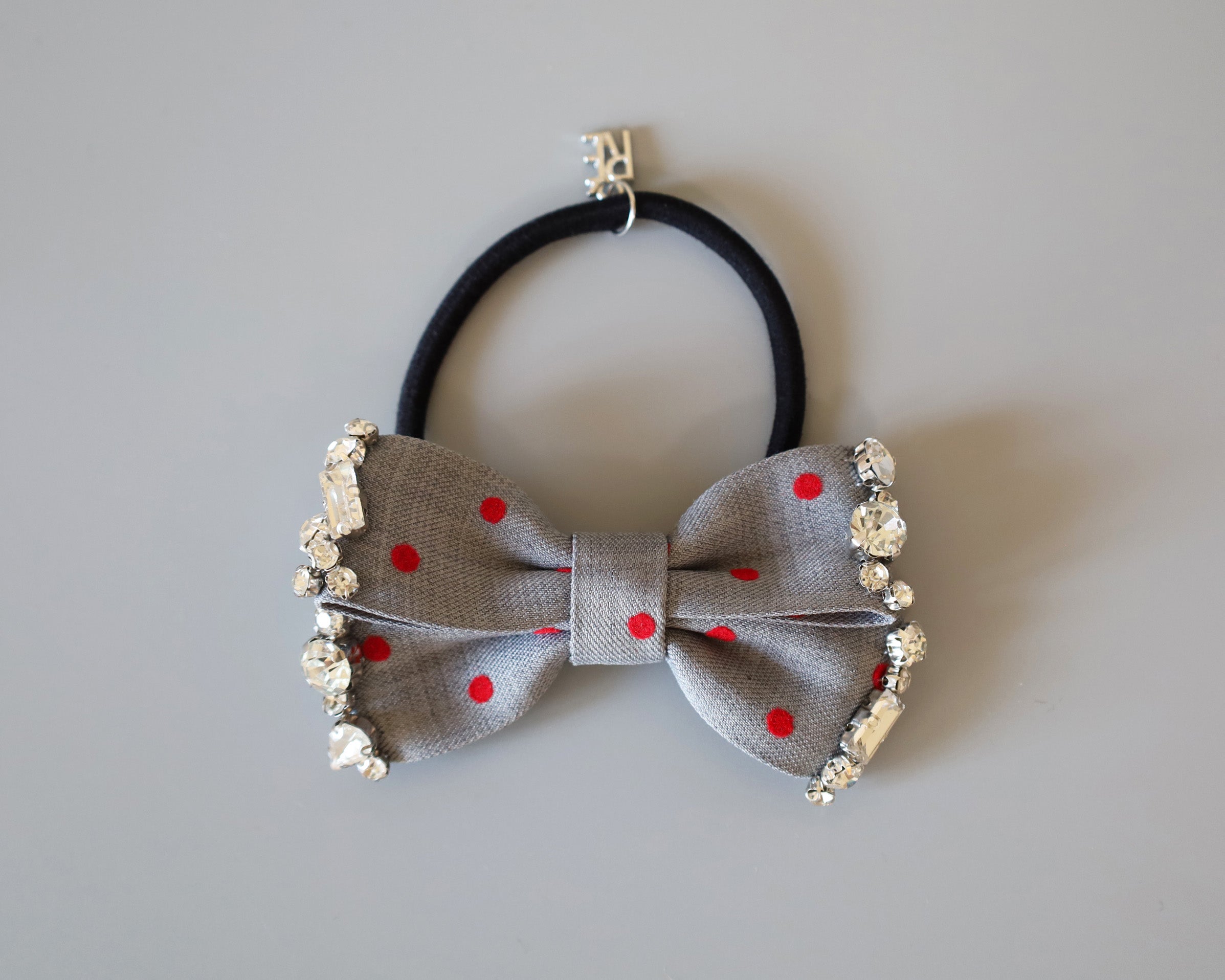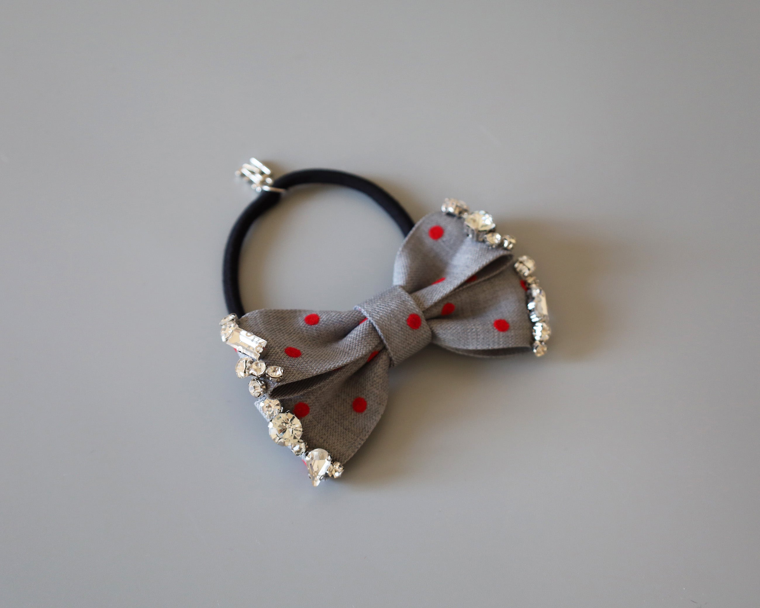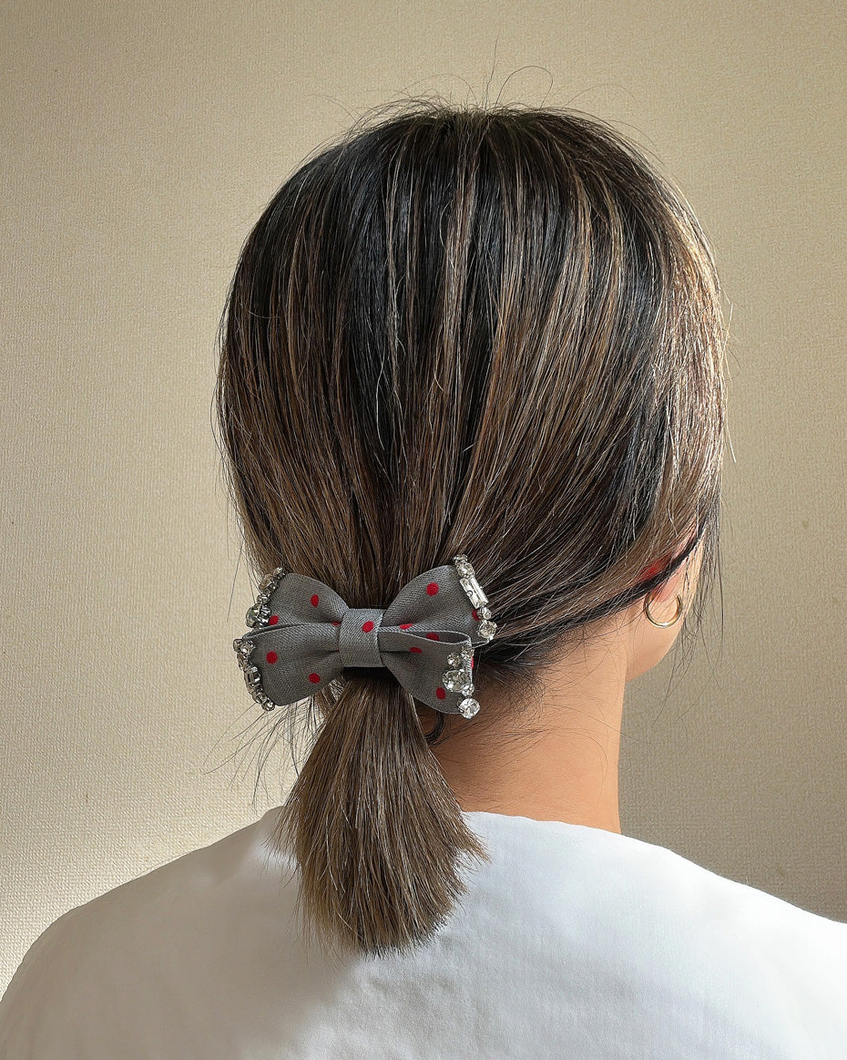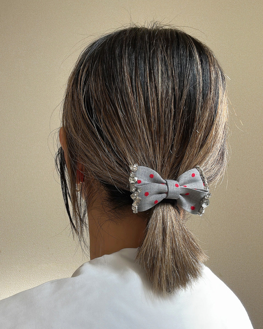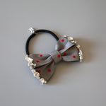 グレーの生地に赤のドットが映えるリボンポニー。