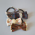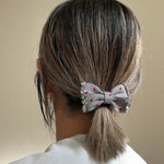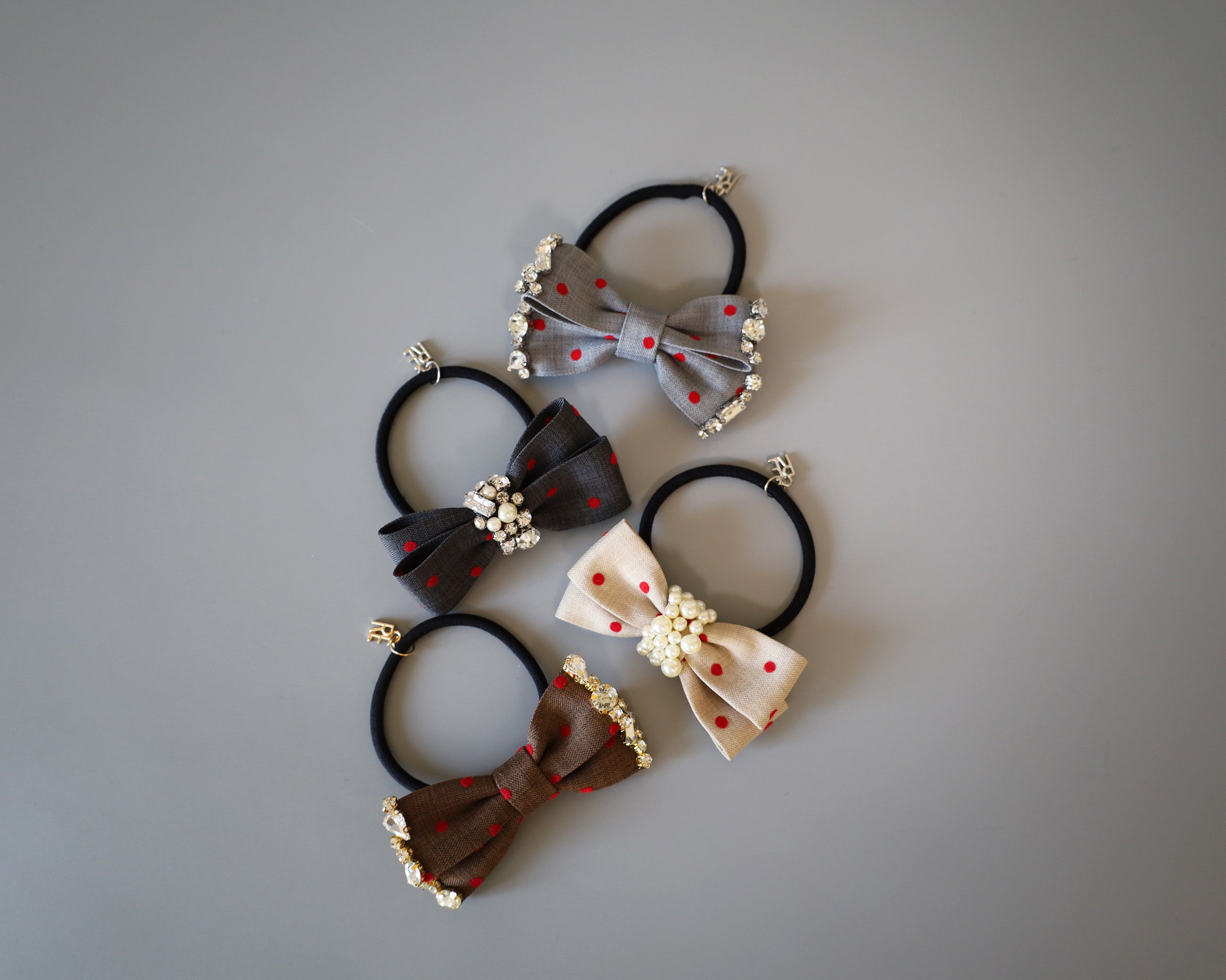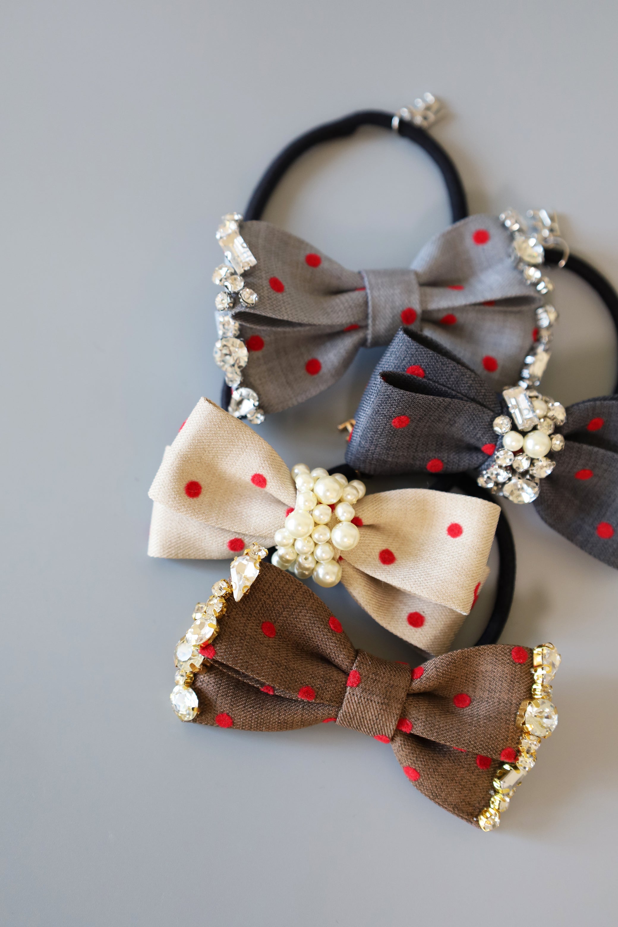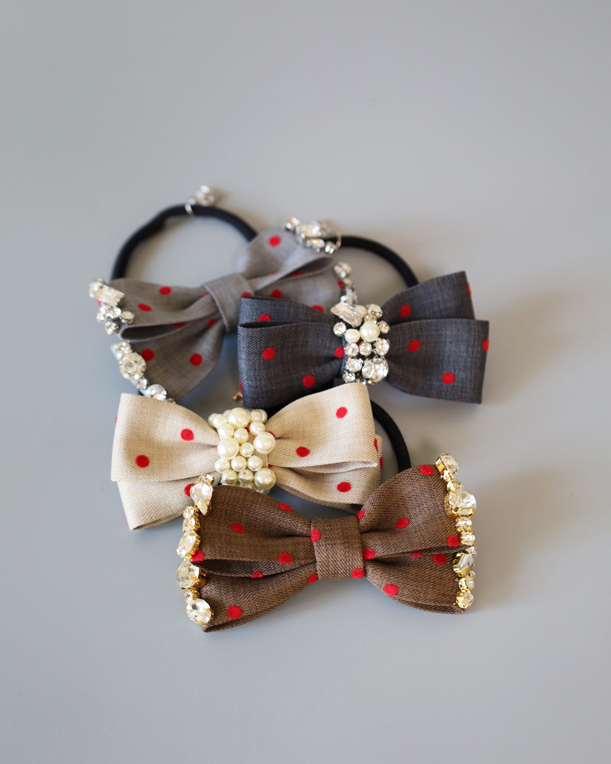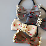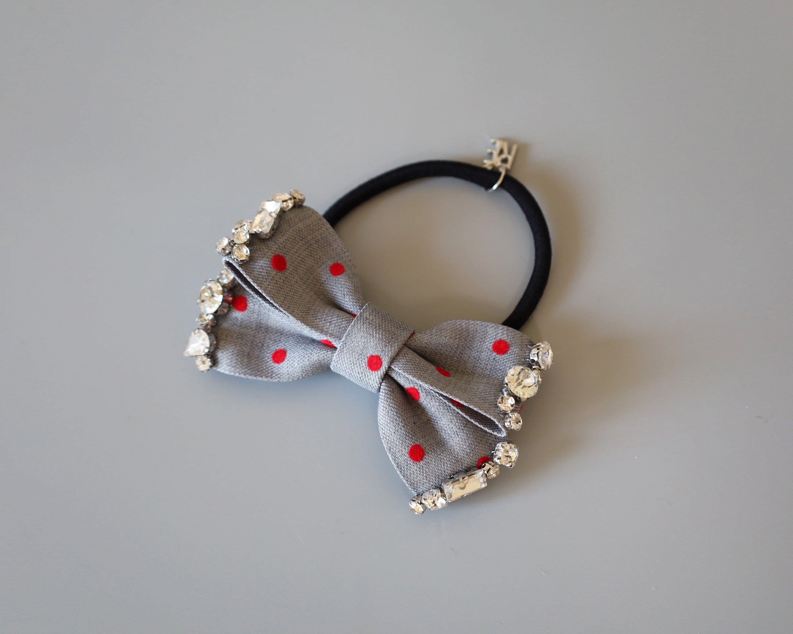 グレーの生地に赤のドットが映えるリボンポニー。