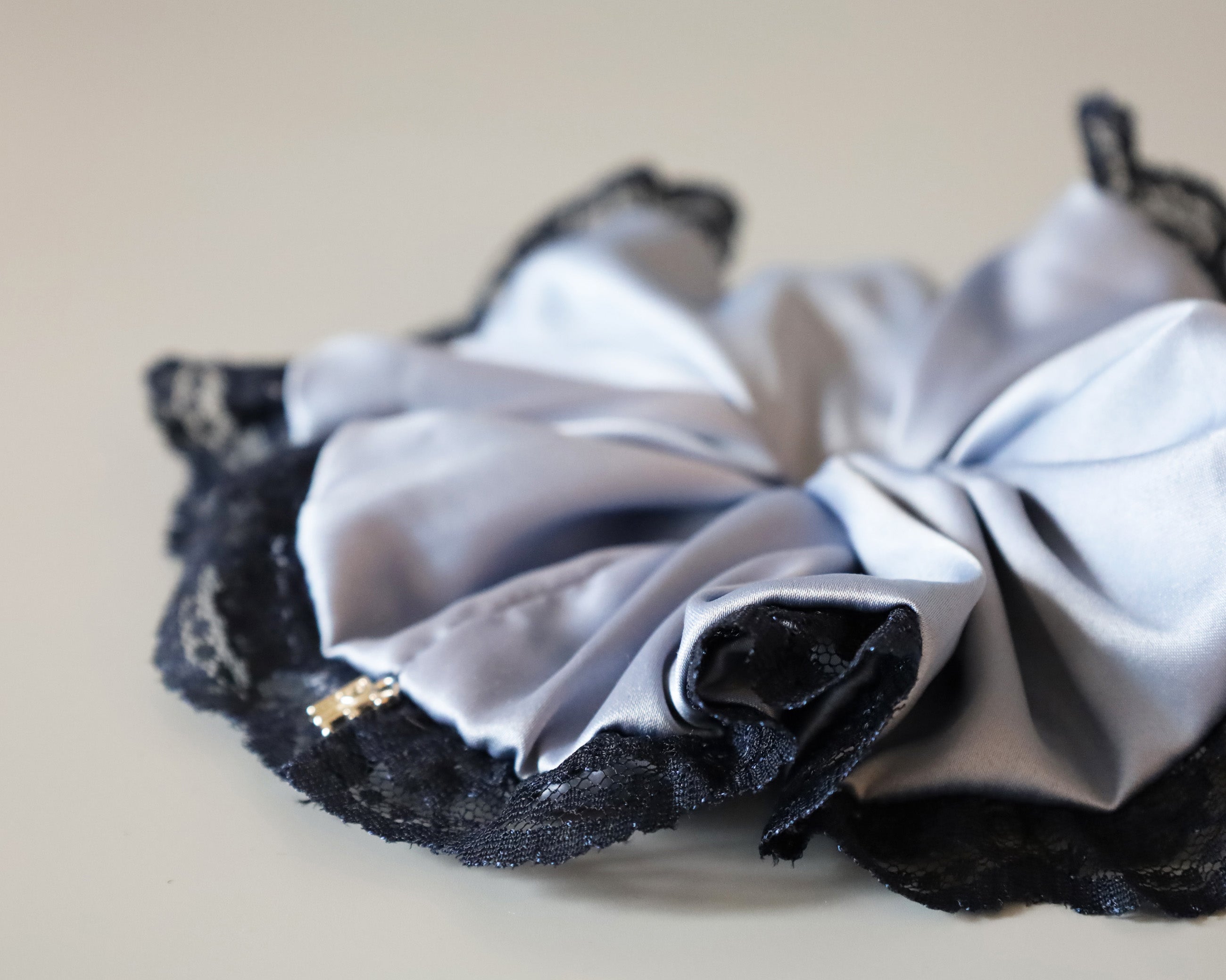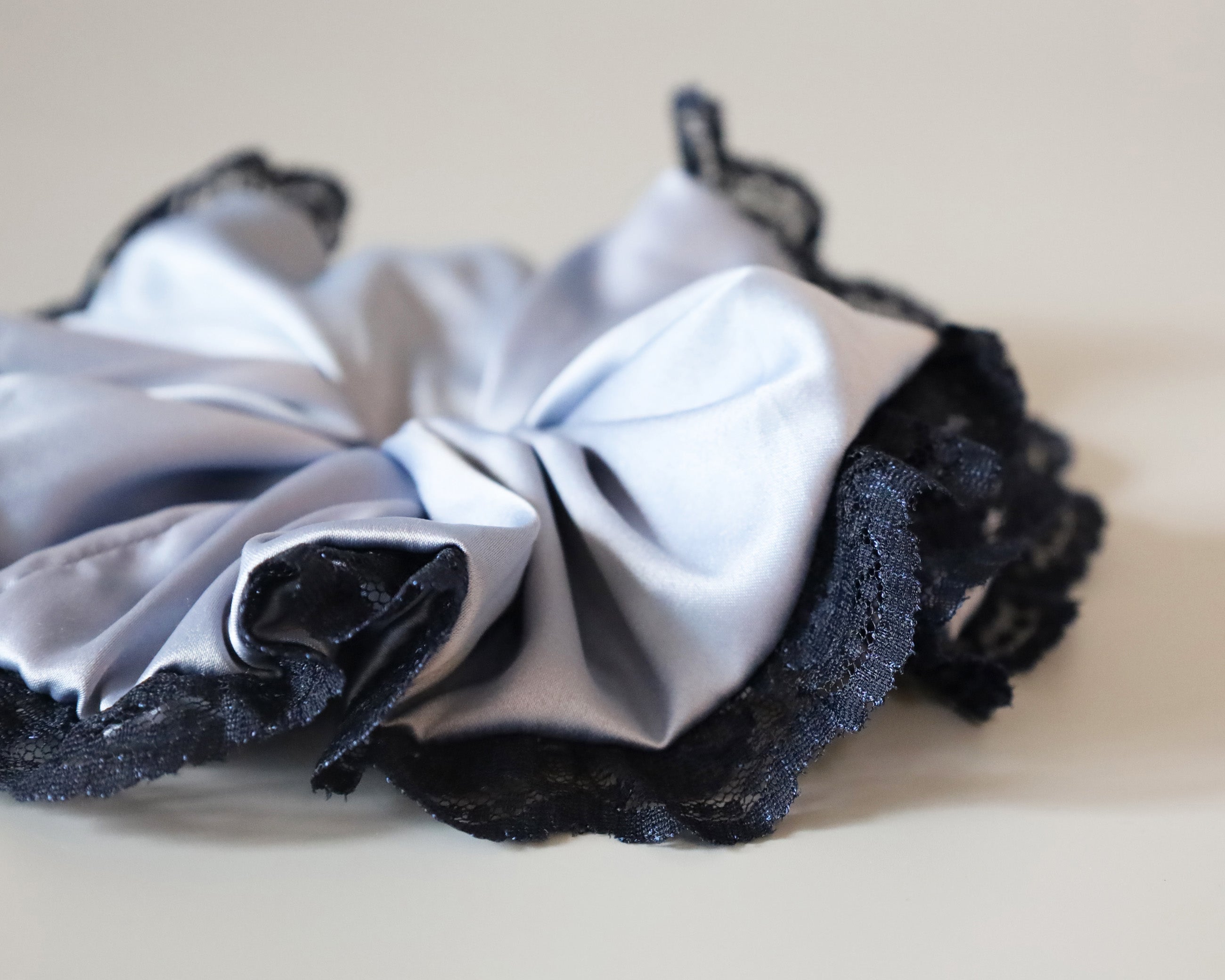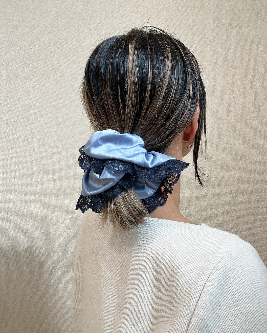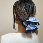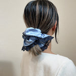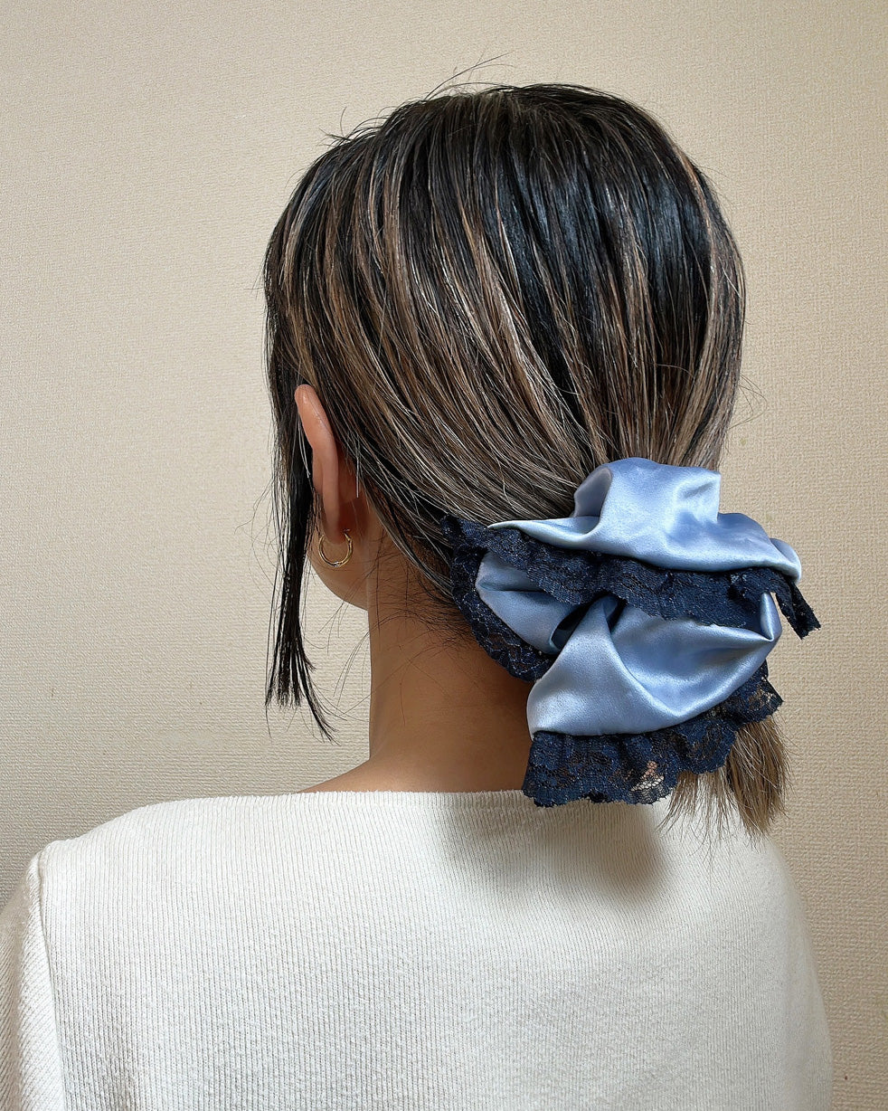 くすみブルー×ネイビーの組み合わせが大人かわいいサテンシュシュ。