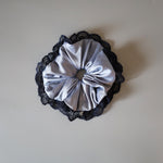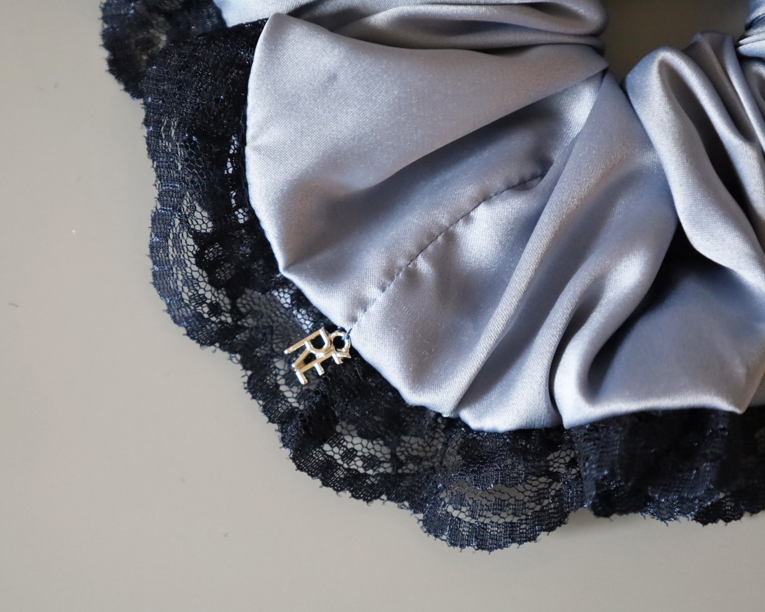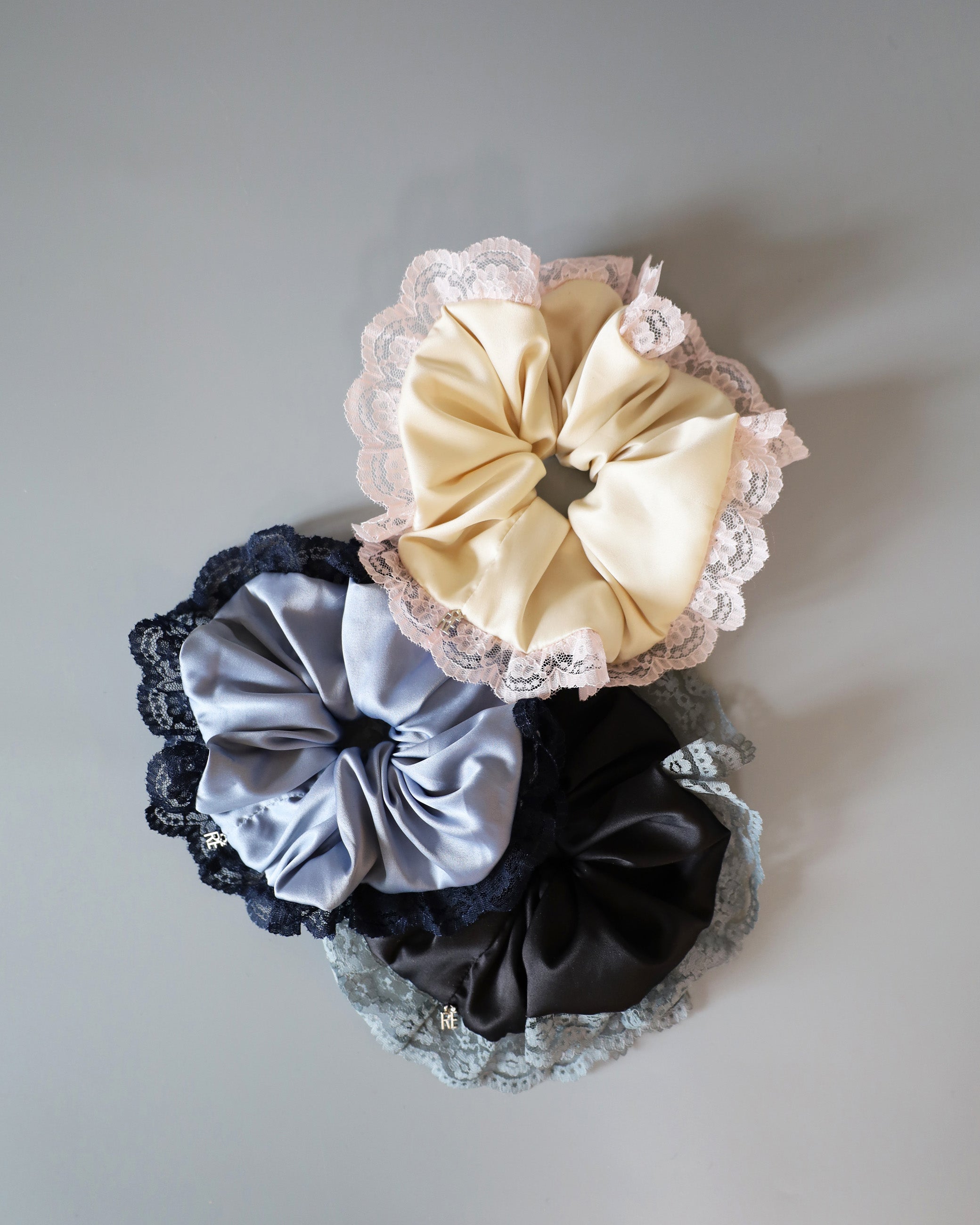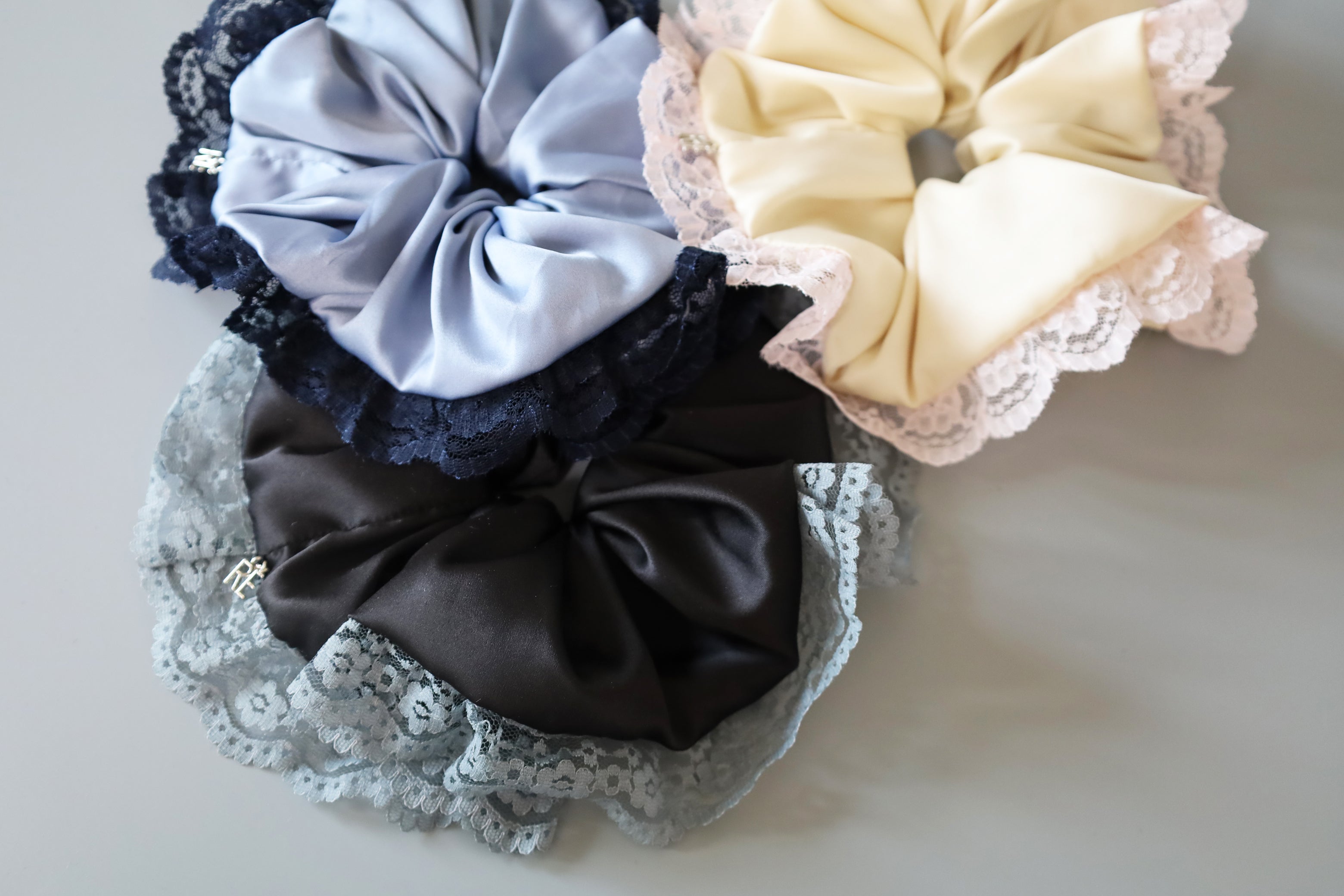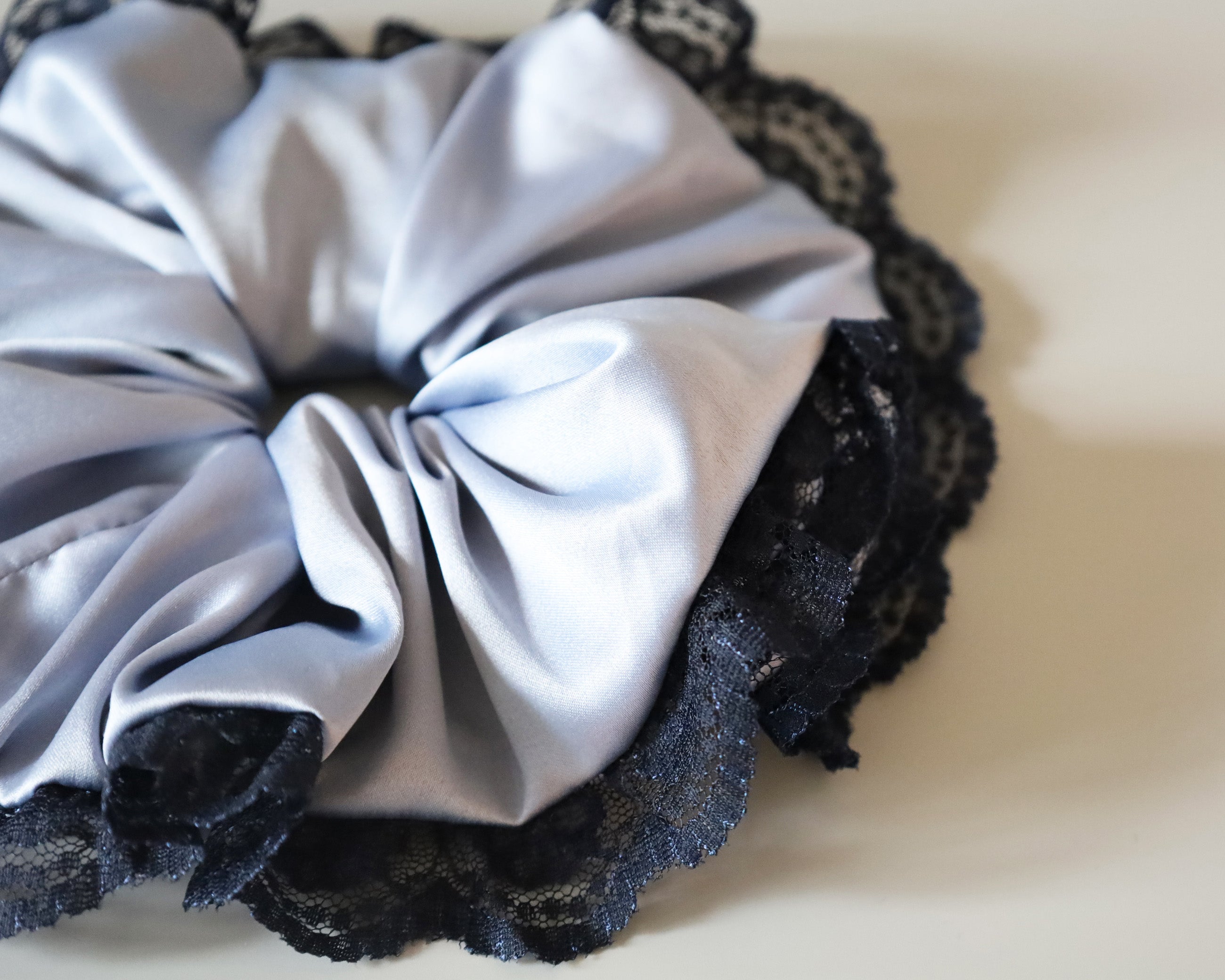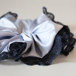 くすみブルー×ネイビーの組み合わせが大人かわいいサテンシュシュ。