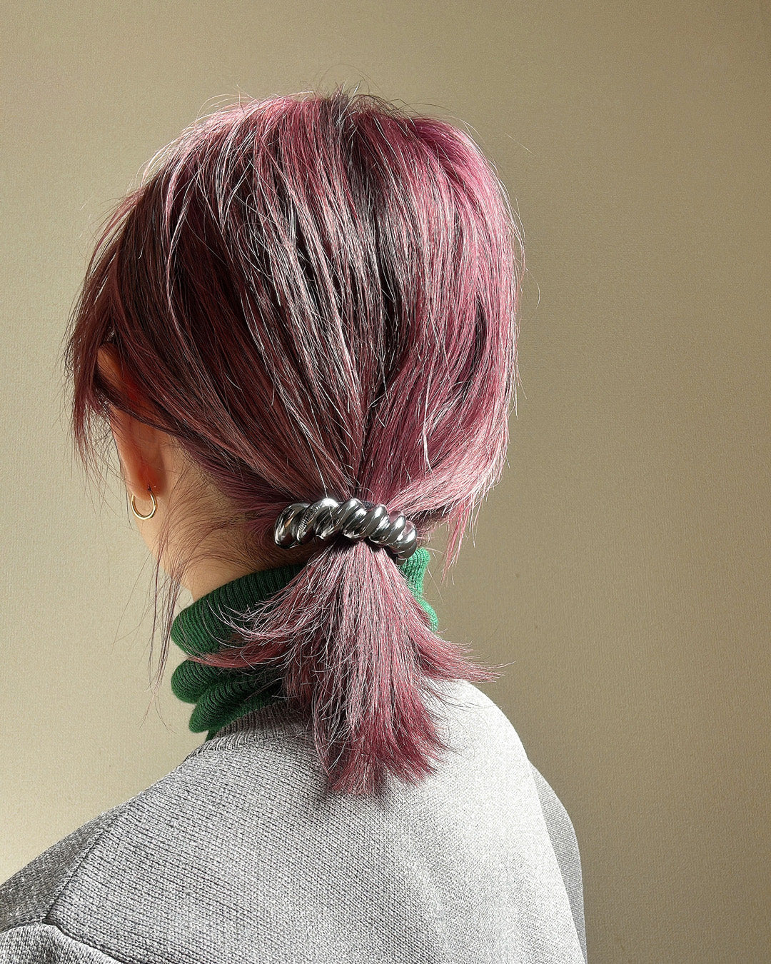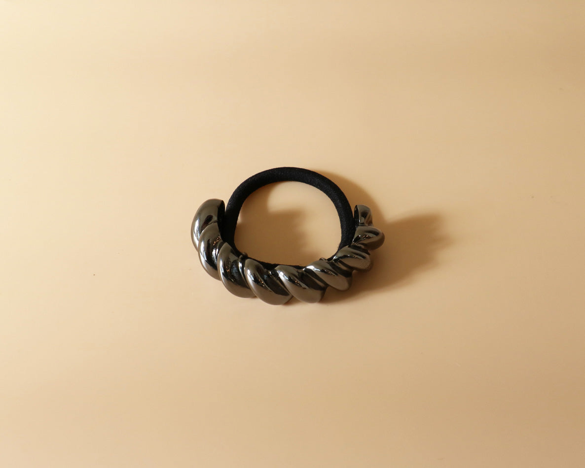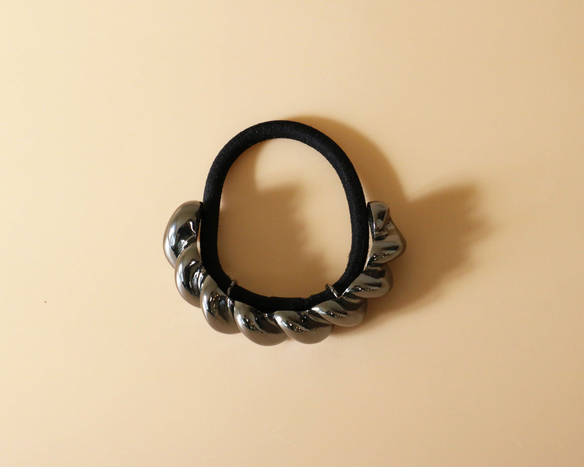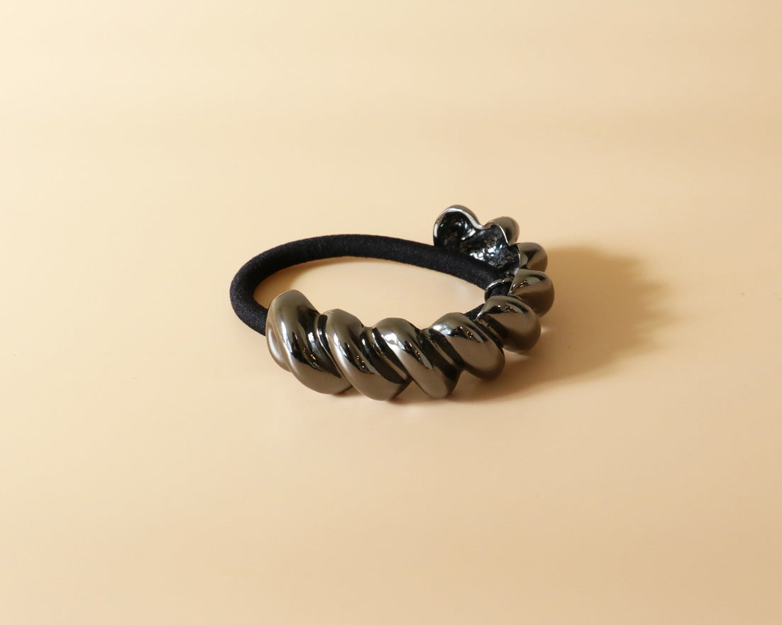 ねじり上げたような立体感とブラックメタルの重厚感がトレンド感たっぷりのヘアゴムです。