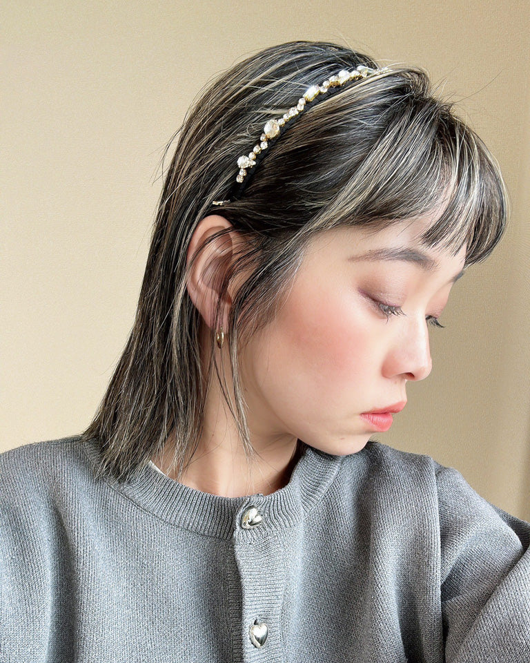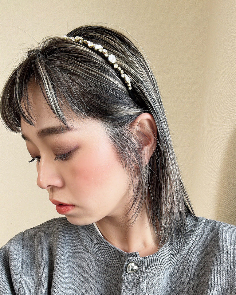 ビジューが際立つ極細カチューシャは、ティアラのような華やかさが魅力的。