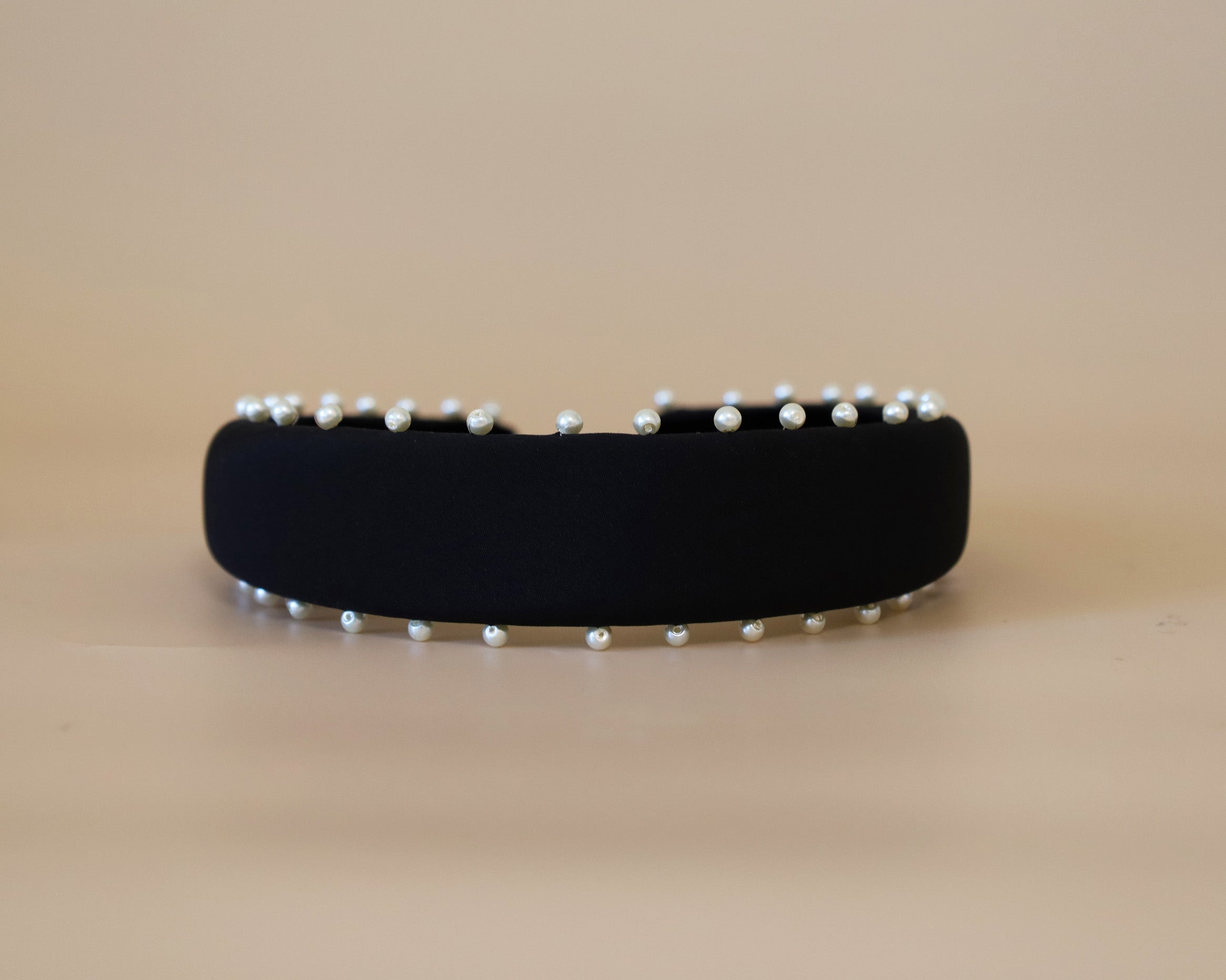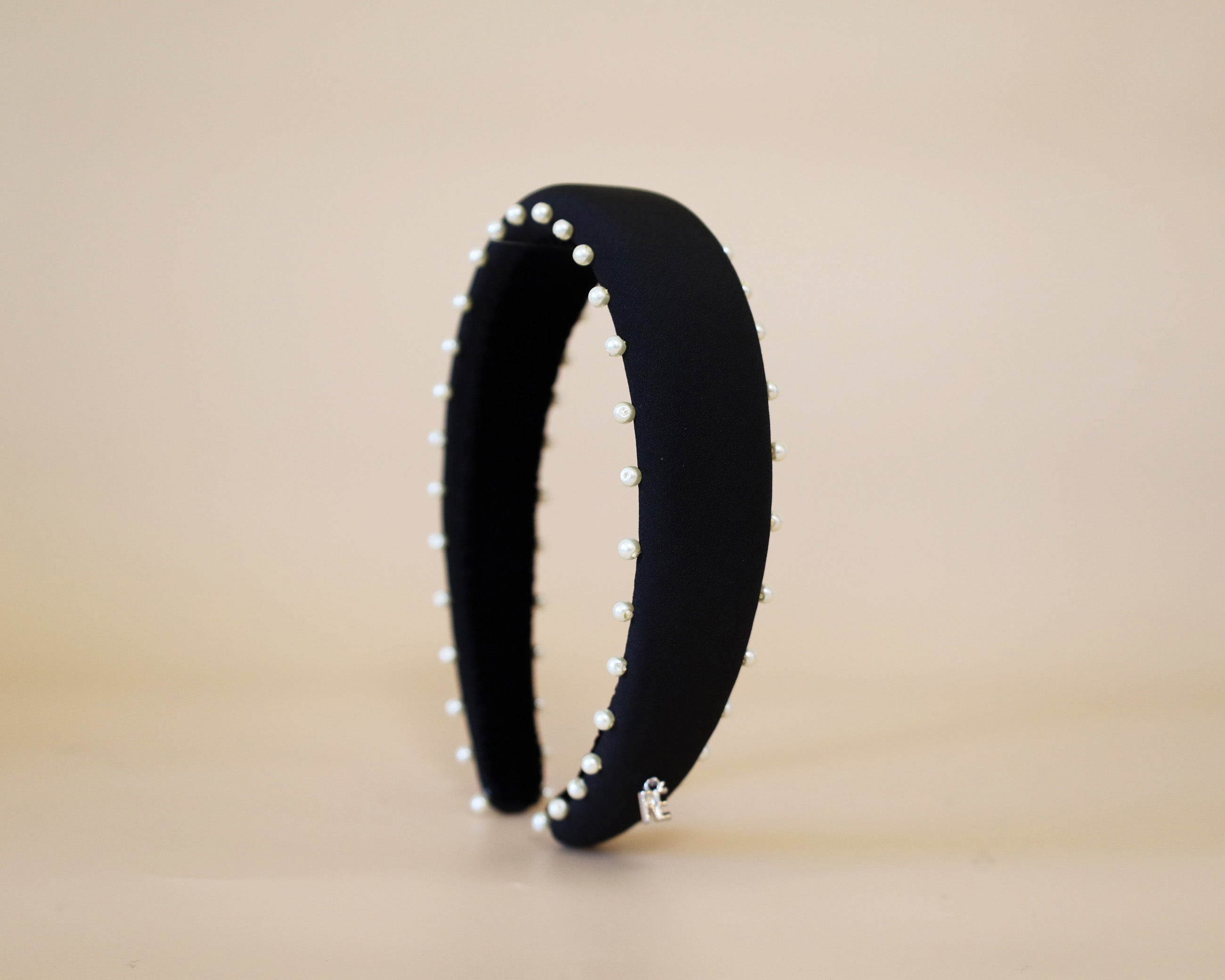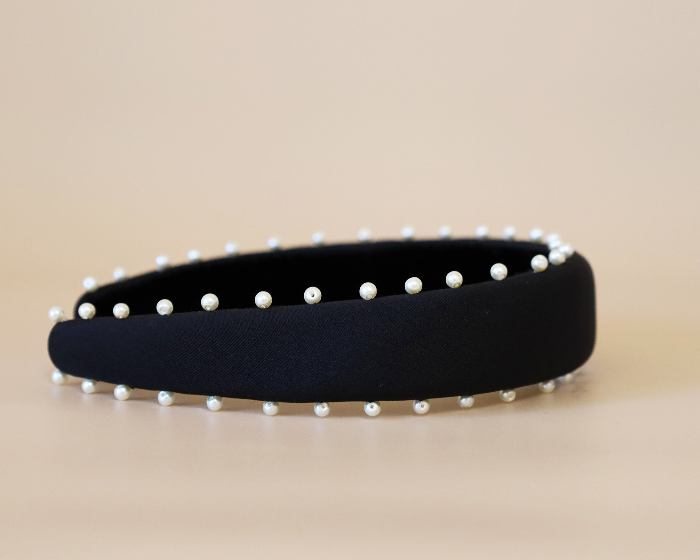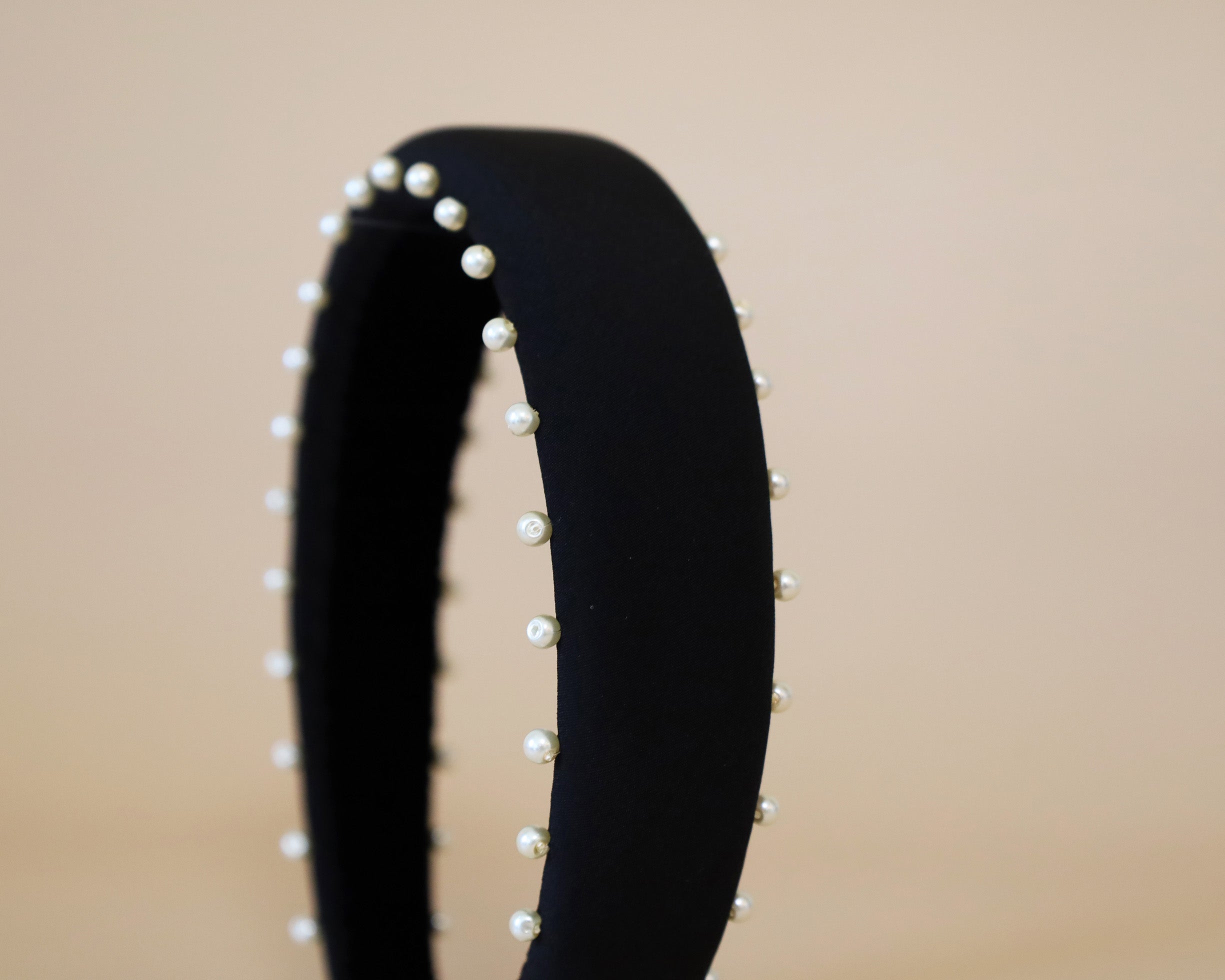 シックなブラックカチューシャにパールビーズで幅広のリム部分を彩るデザイン。