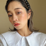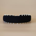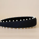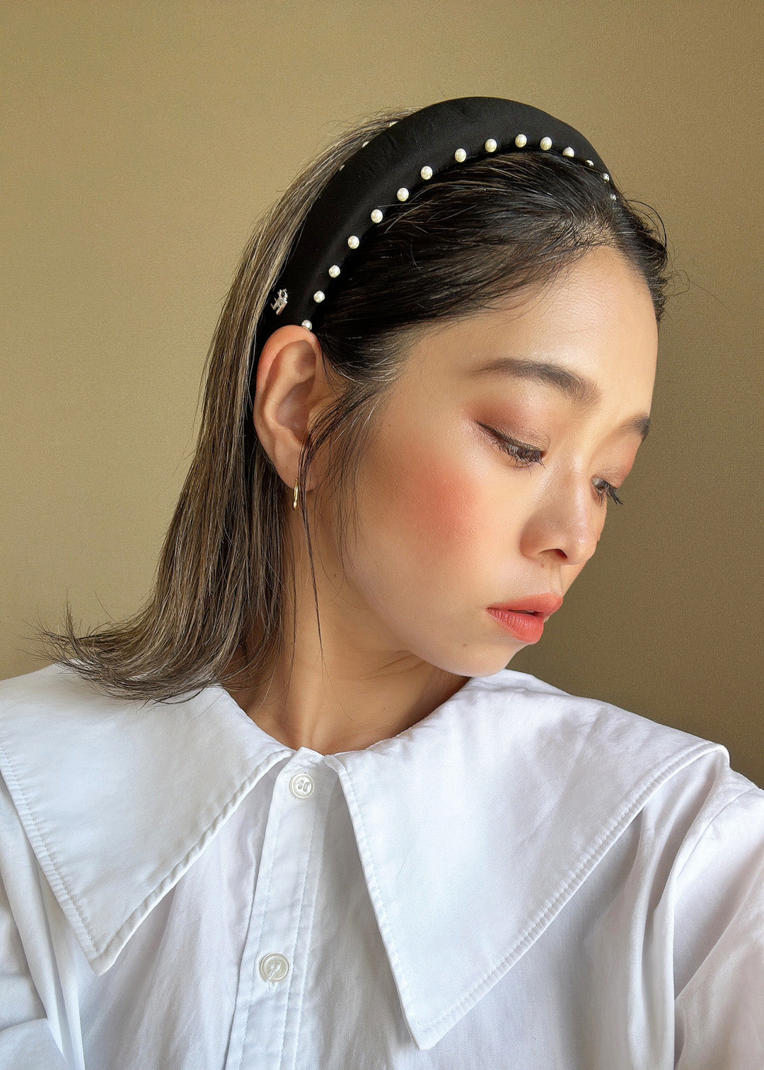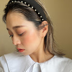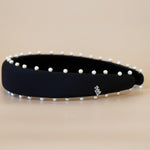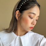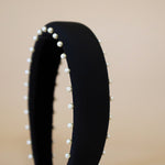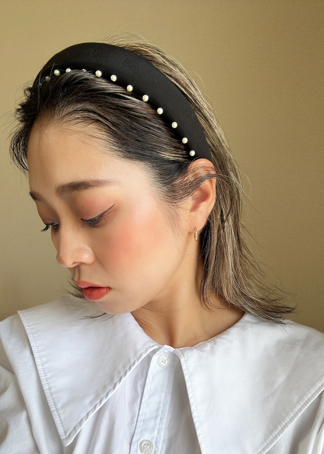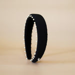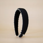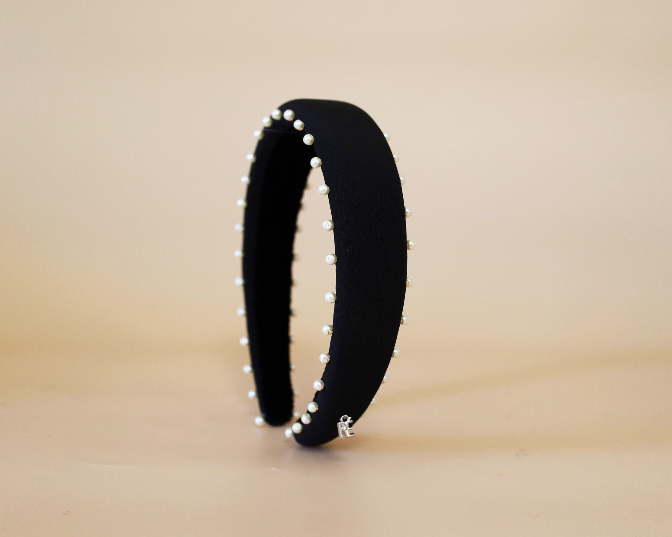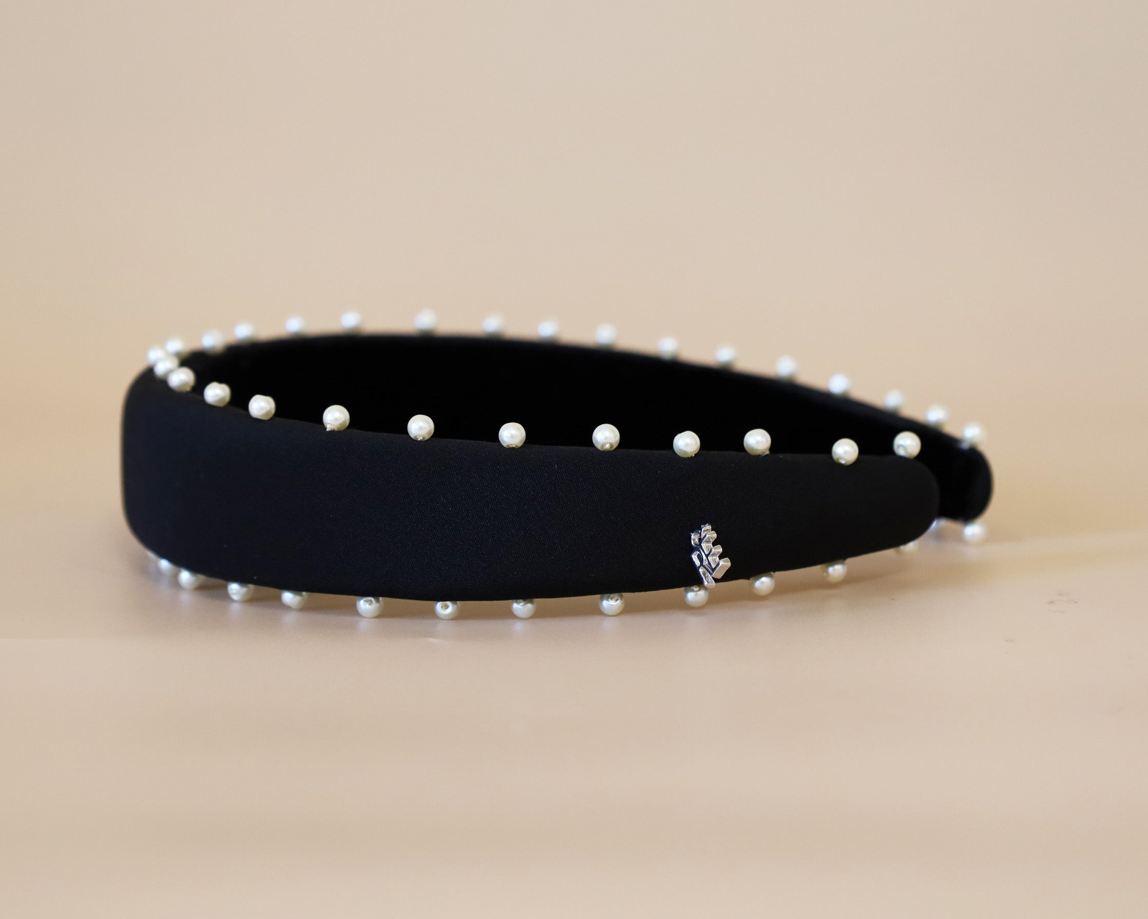 シックなブラックカチューシャにパールビーズで幅広のリム部分を彩るデザイン。
