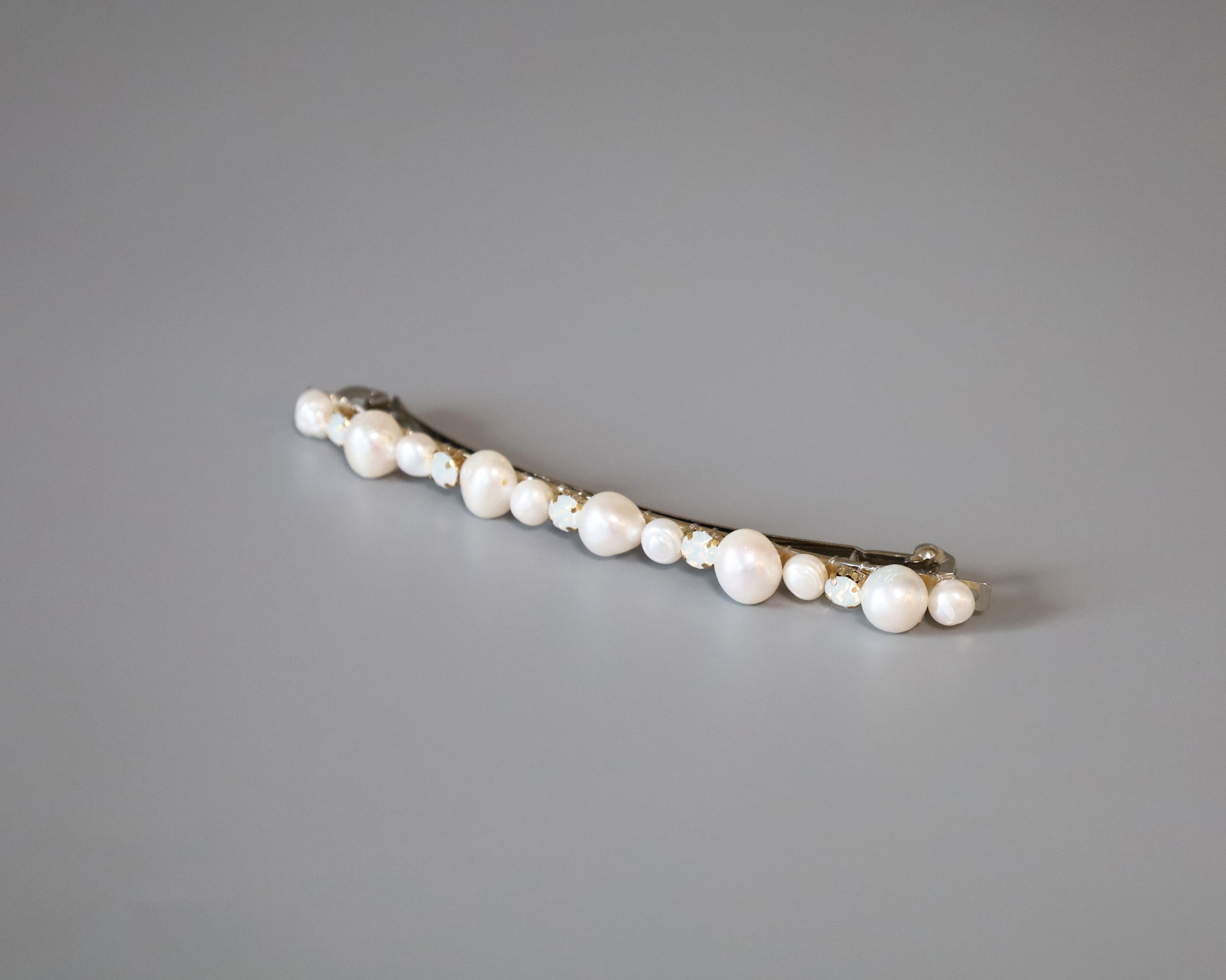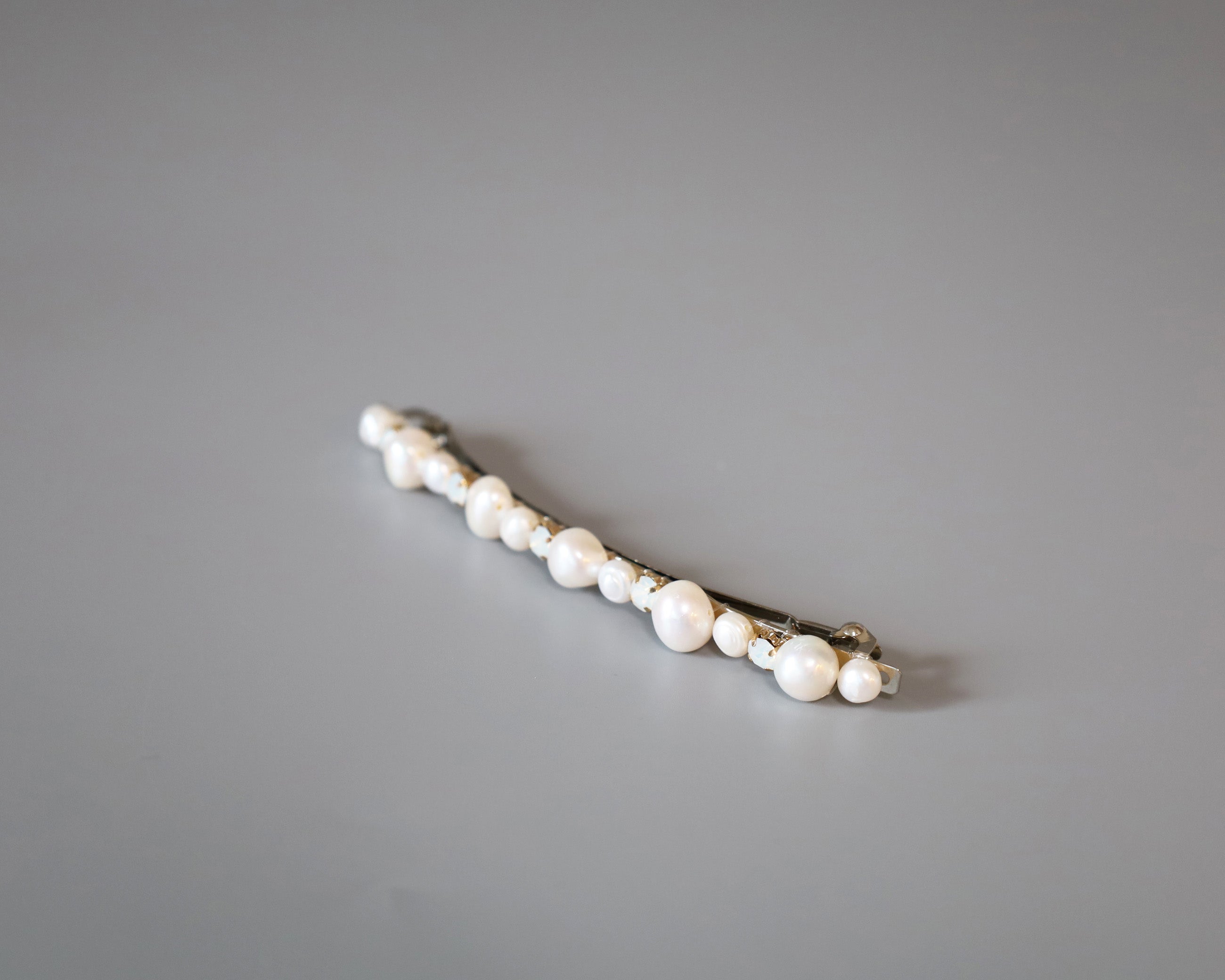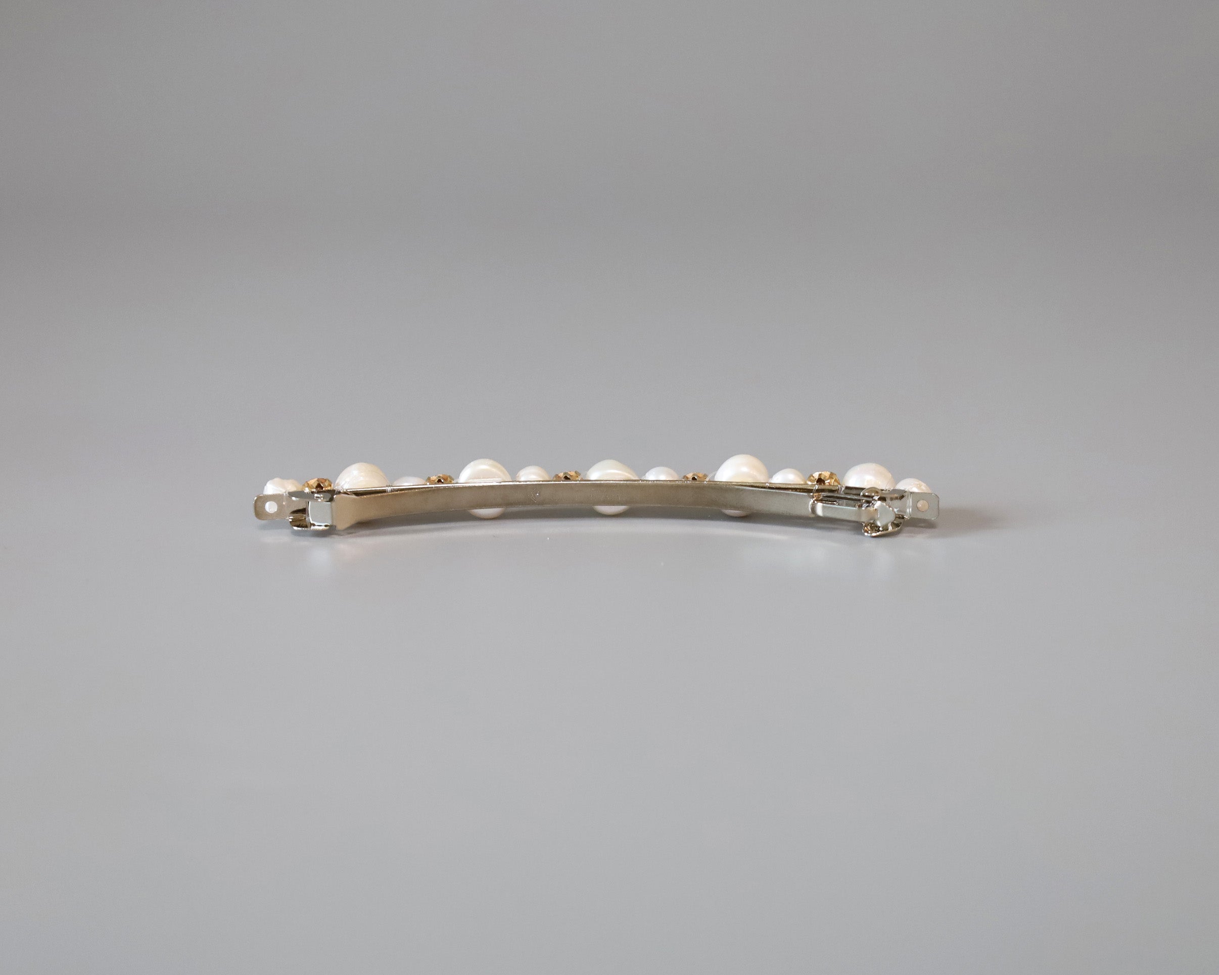 不揃いパールとミルキーカラーのビジューが並ぶリッチなバレッタ。