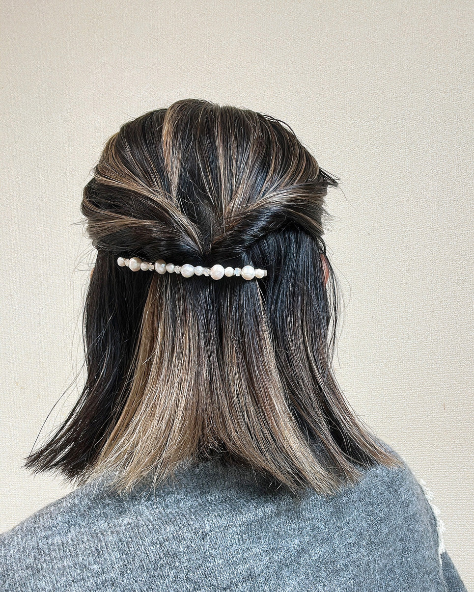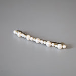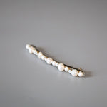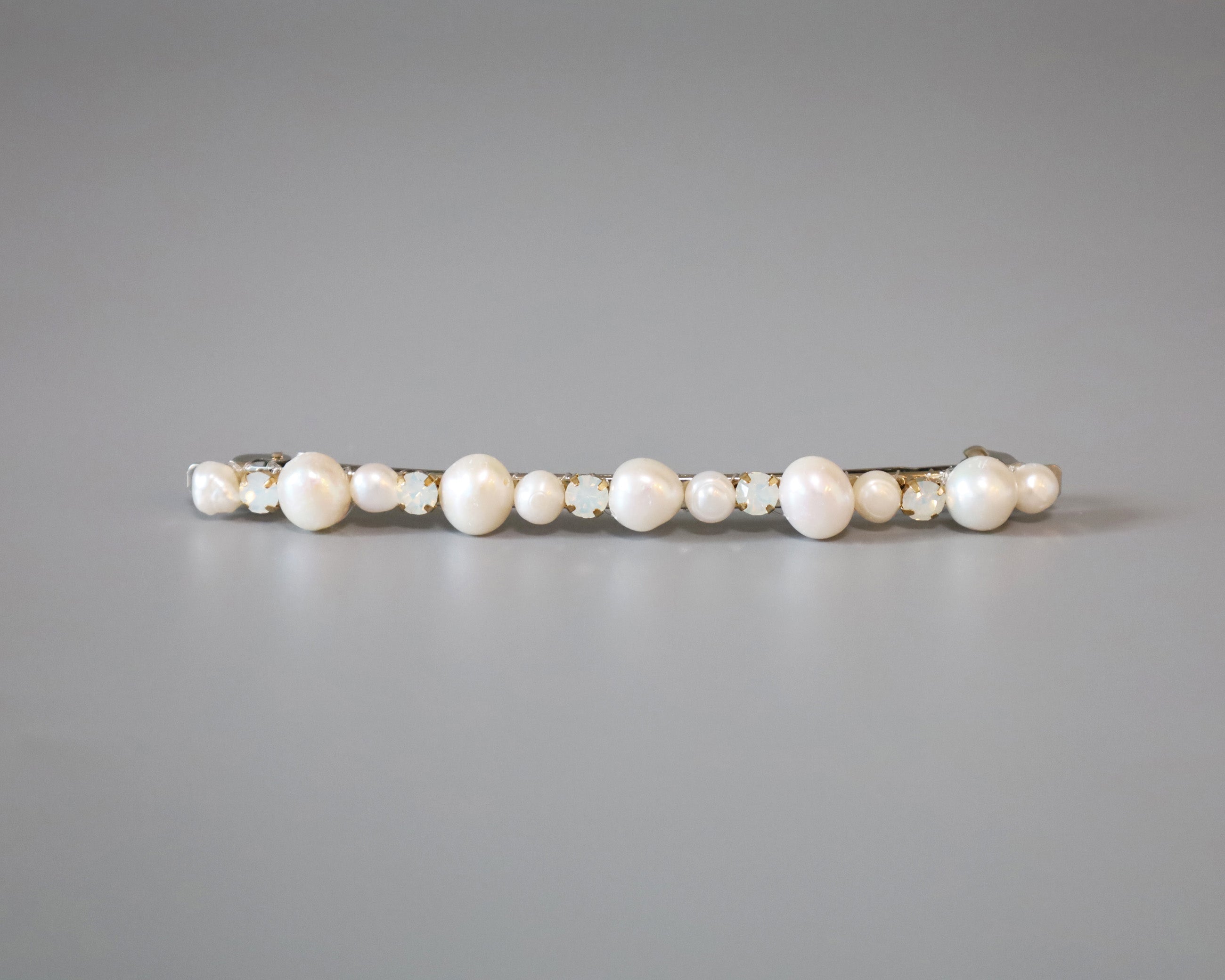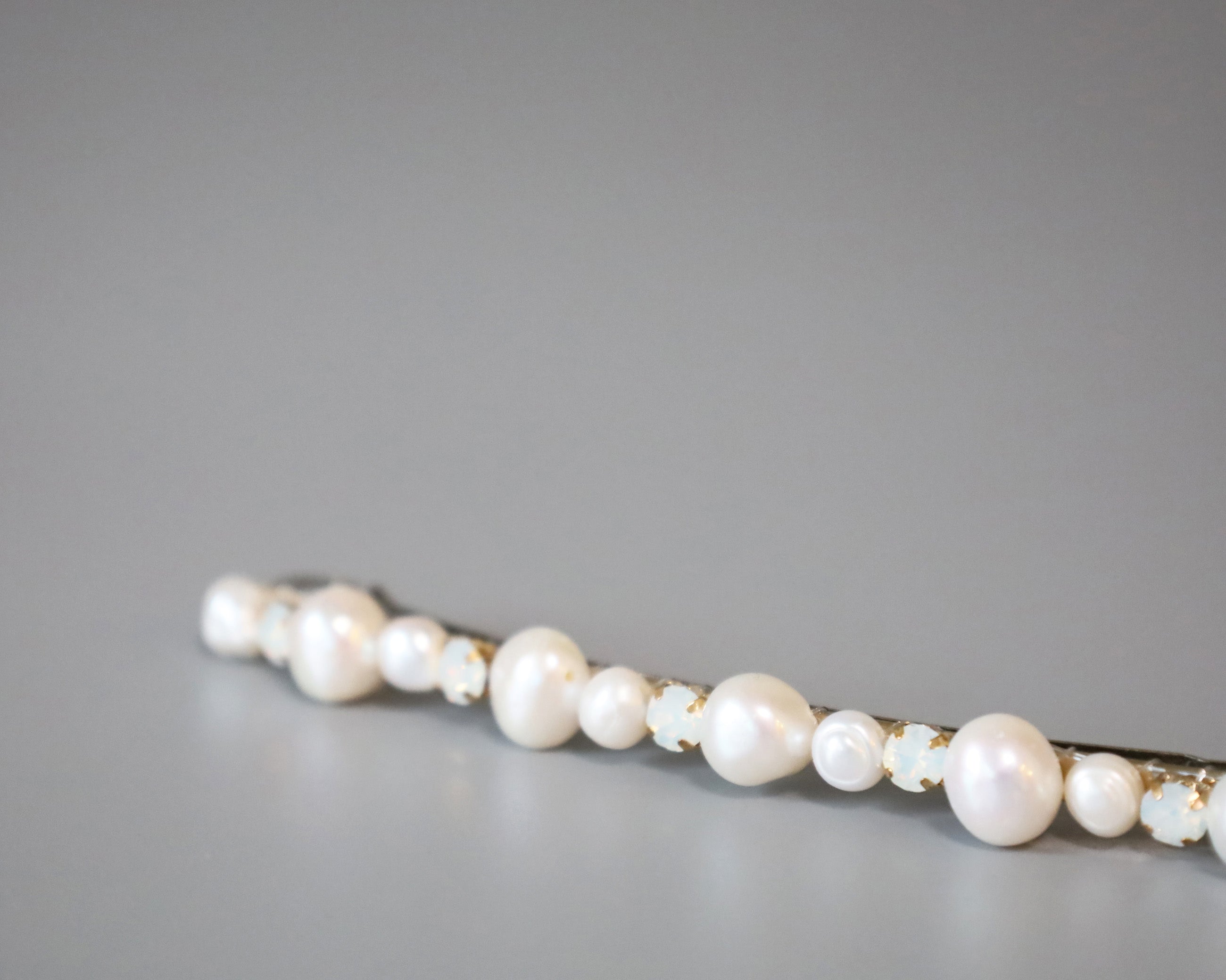 不揃いパールとミルキーカラーのビジューが並ぶリッチなバレッタ。