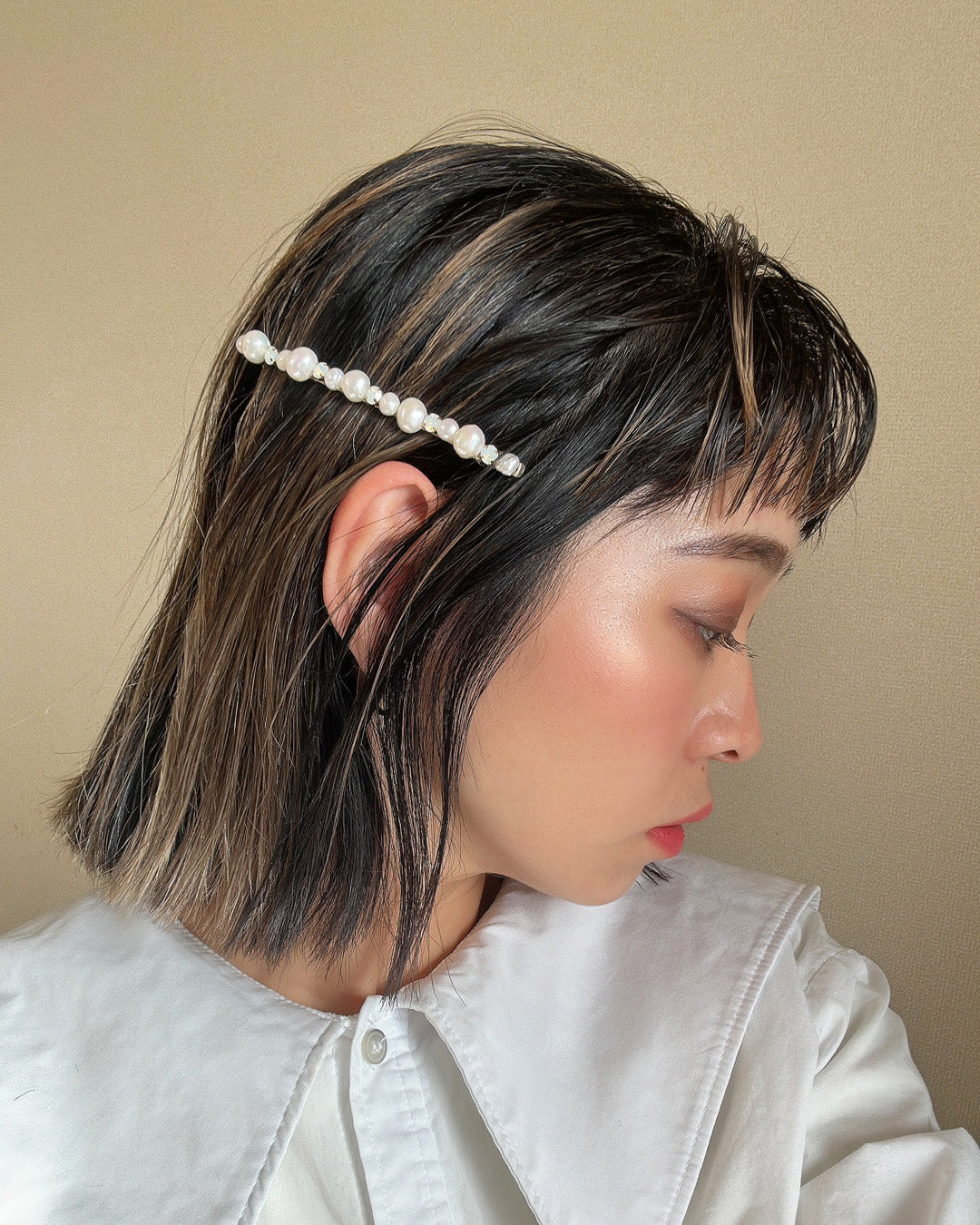 短めヘアには顔まわりをざっくり留めるサイド付けにすれば、横顔が華やいで◎