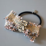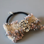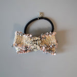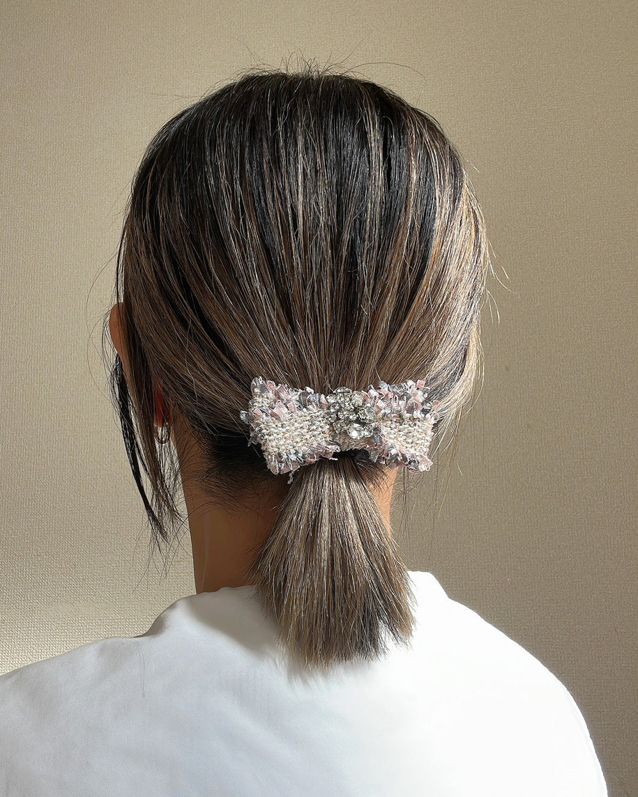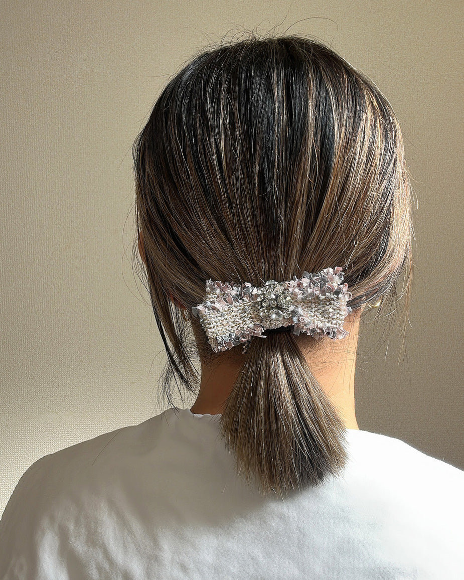 リボンの中心にビジューをたっぷり乗せ、シンプルなヘアや後ろ姿が華やかに仕上がります。