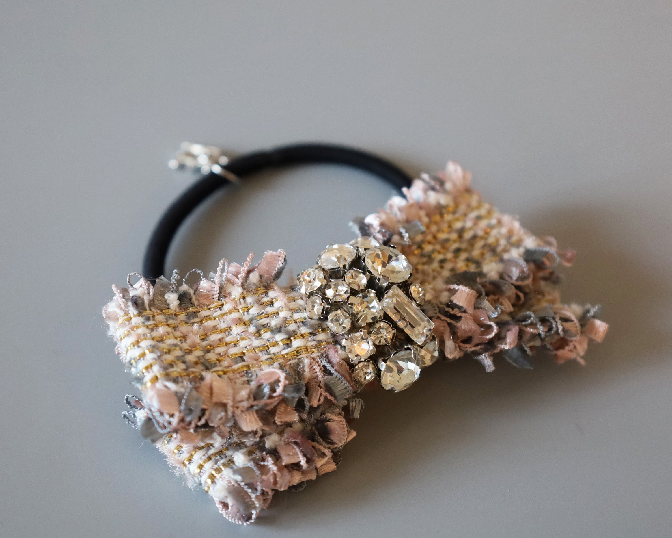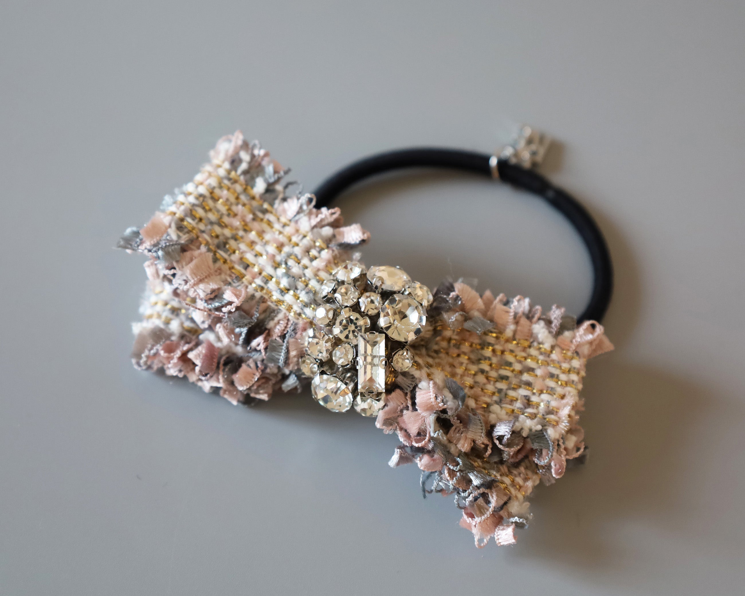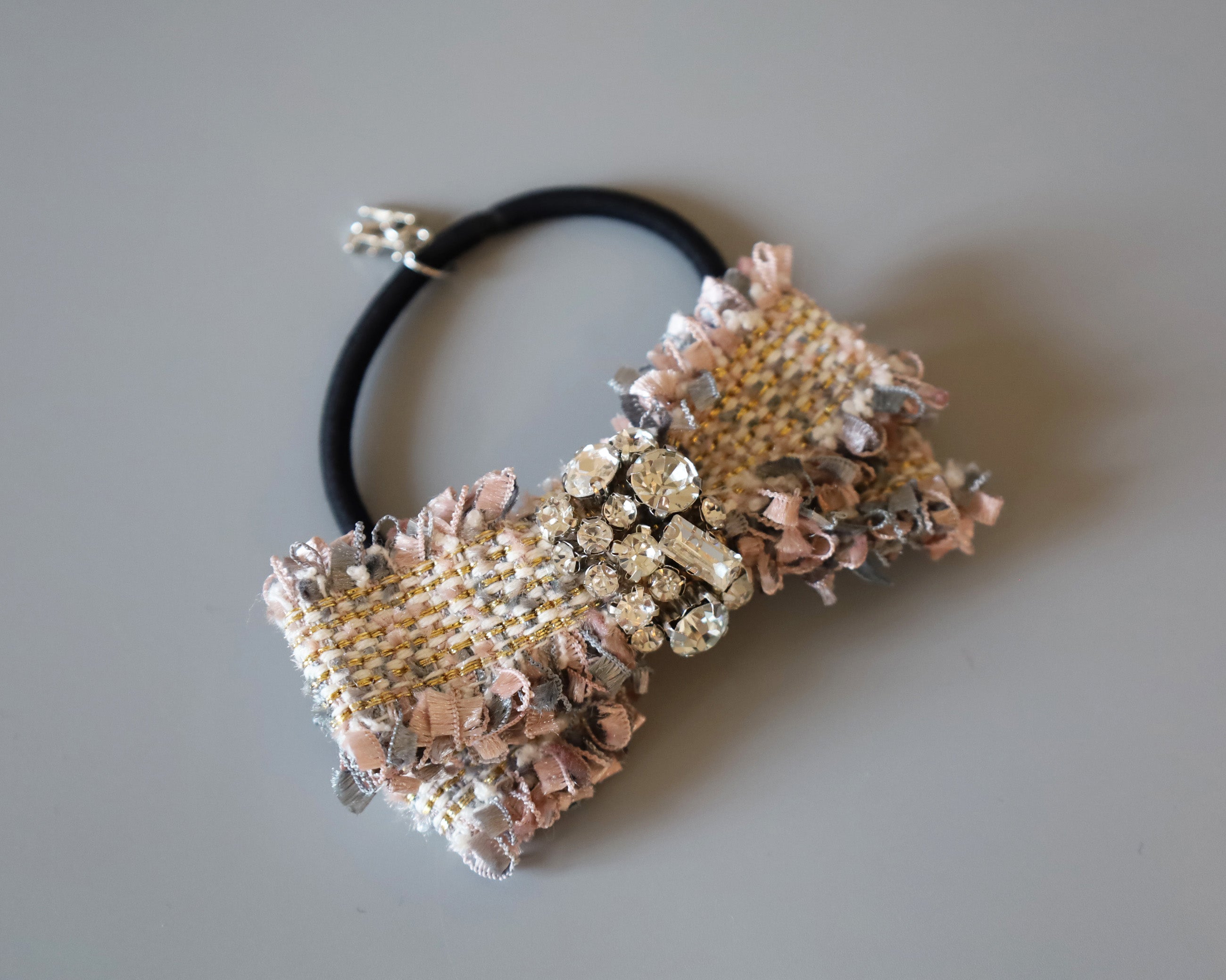ベビーピンクとグレーの細リボンを編み込んだツイード生地で仕立てたリボンポニー。