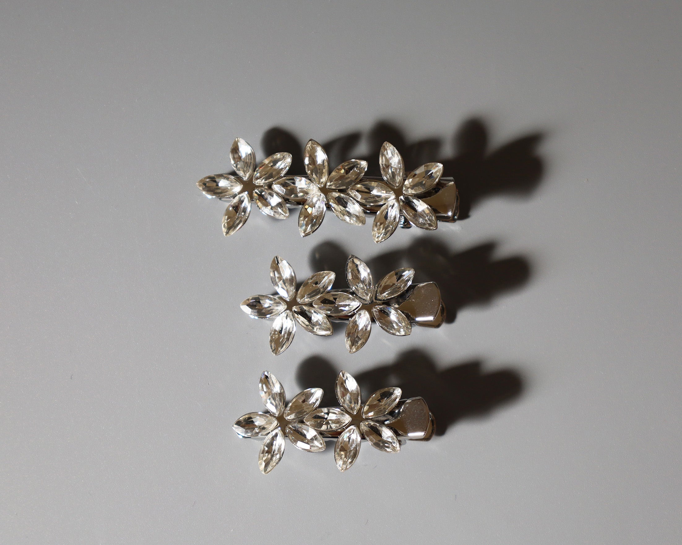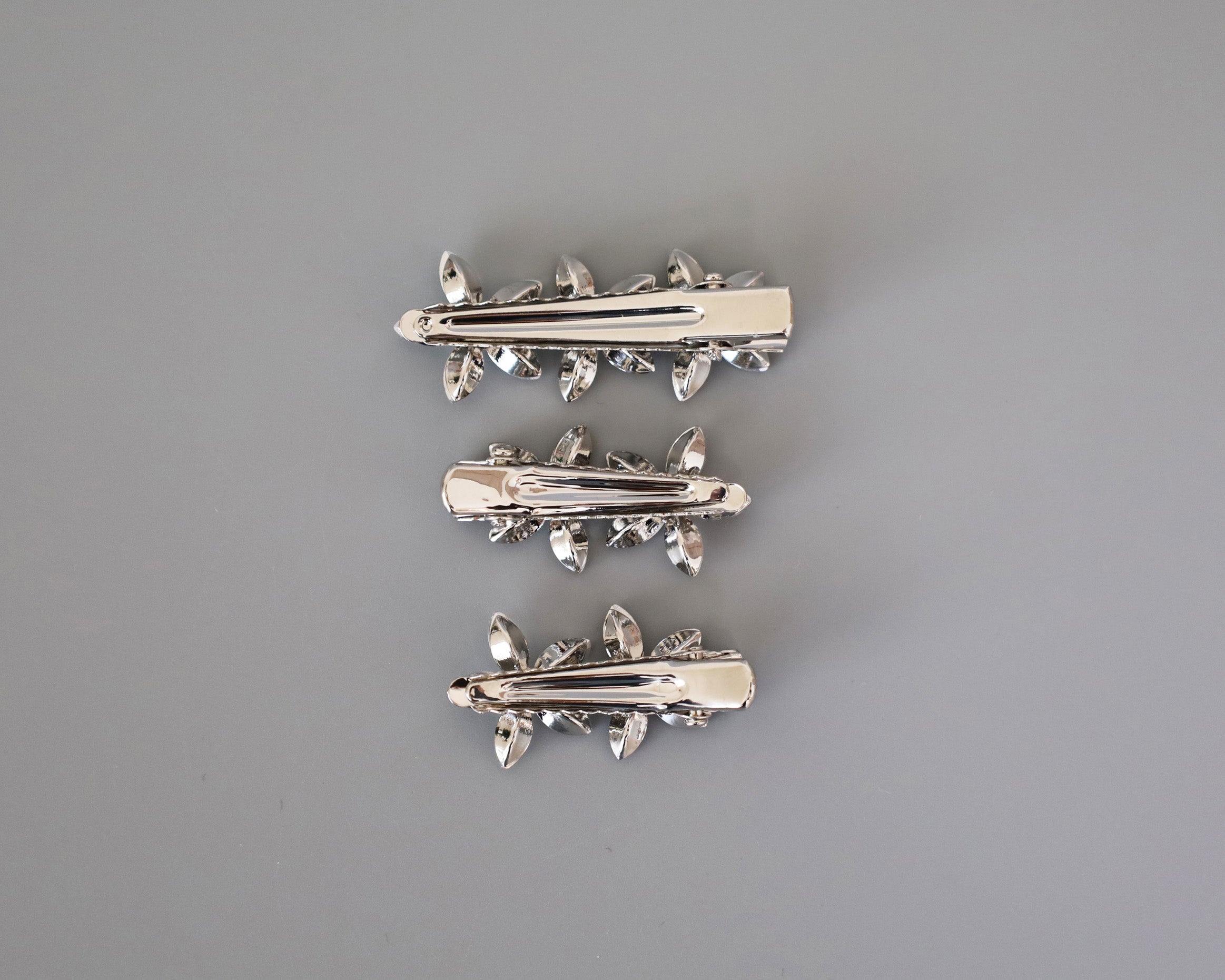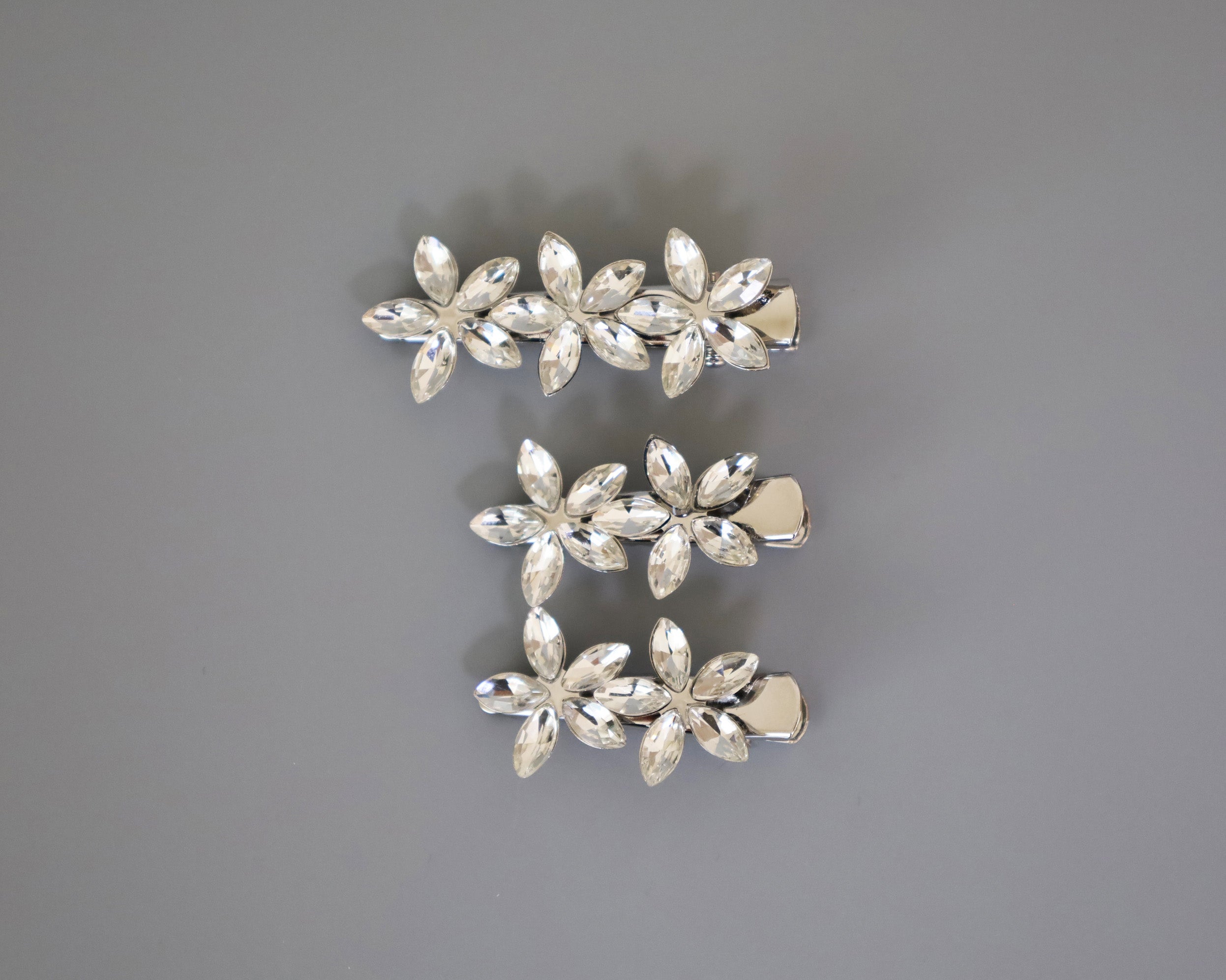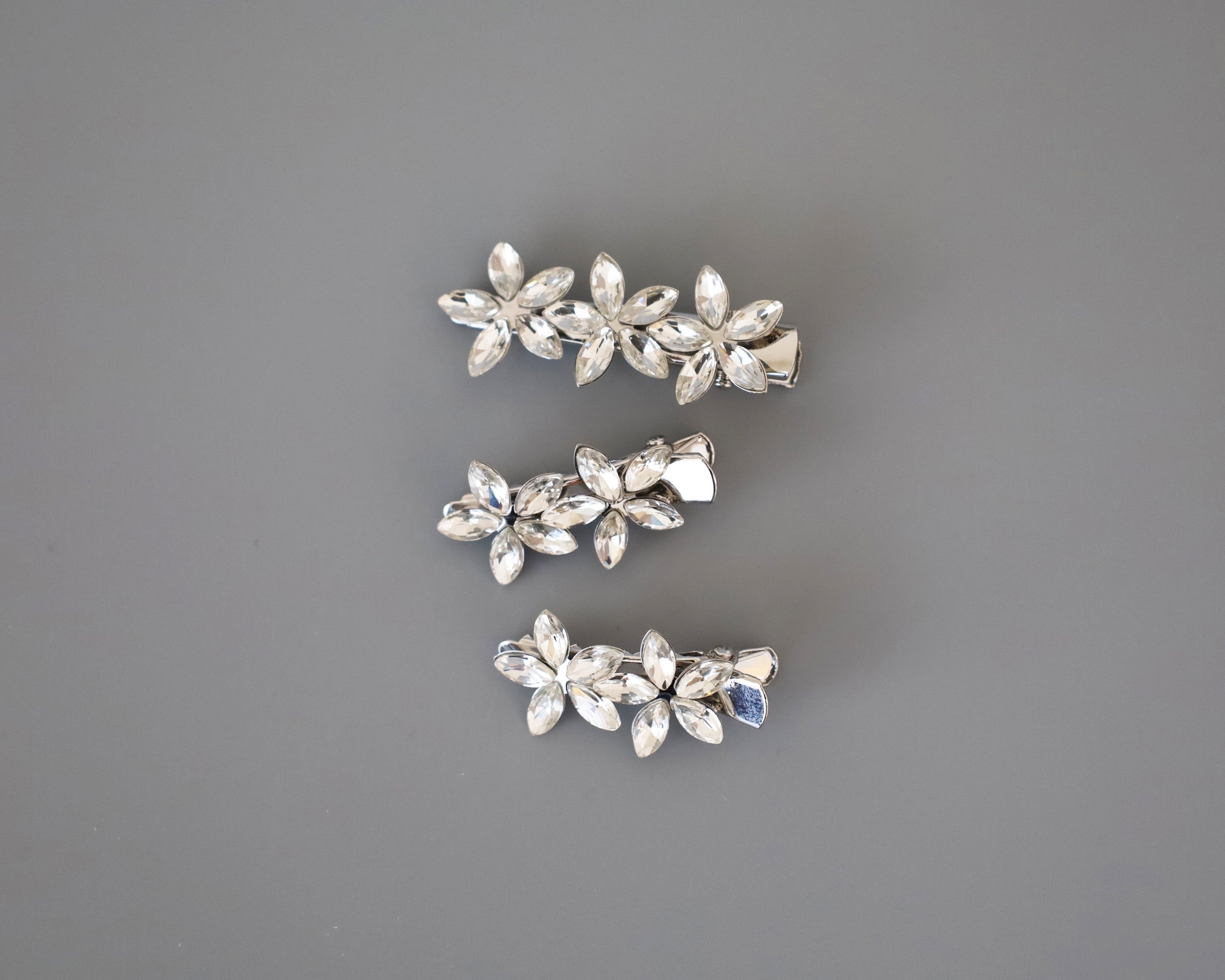 シルバーの土台をベースにフラワーモチーフがそれぞれ3つ、2つ、2つ付いている3つセットです。