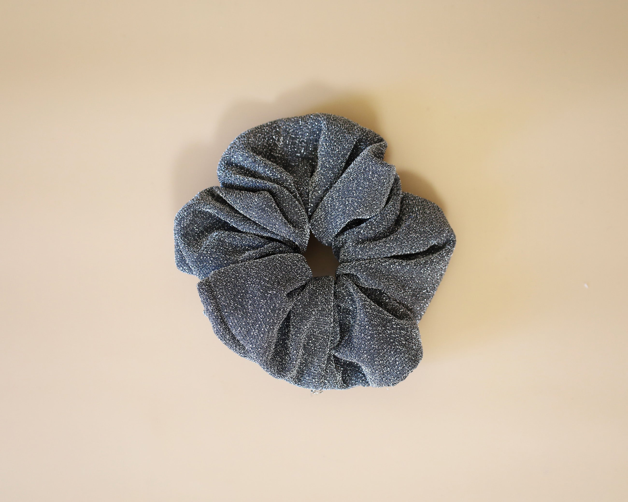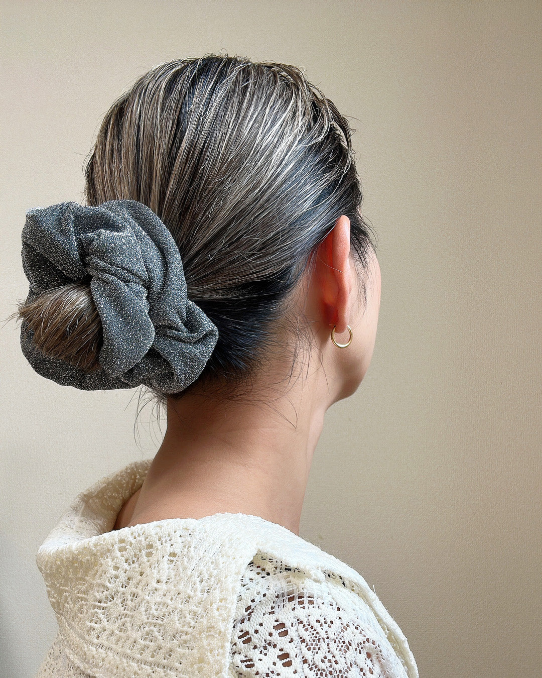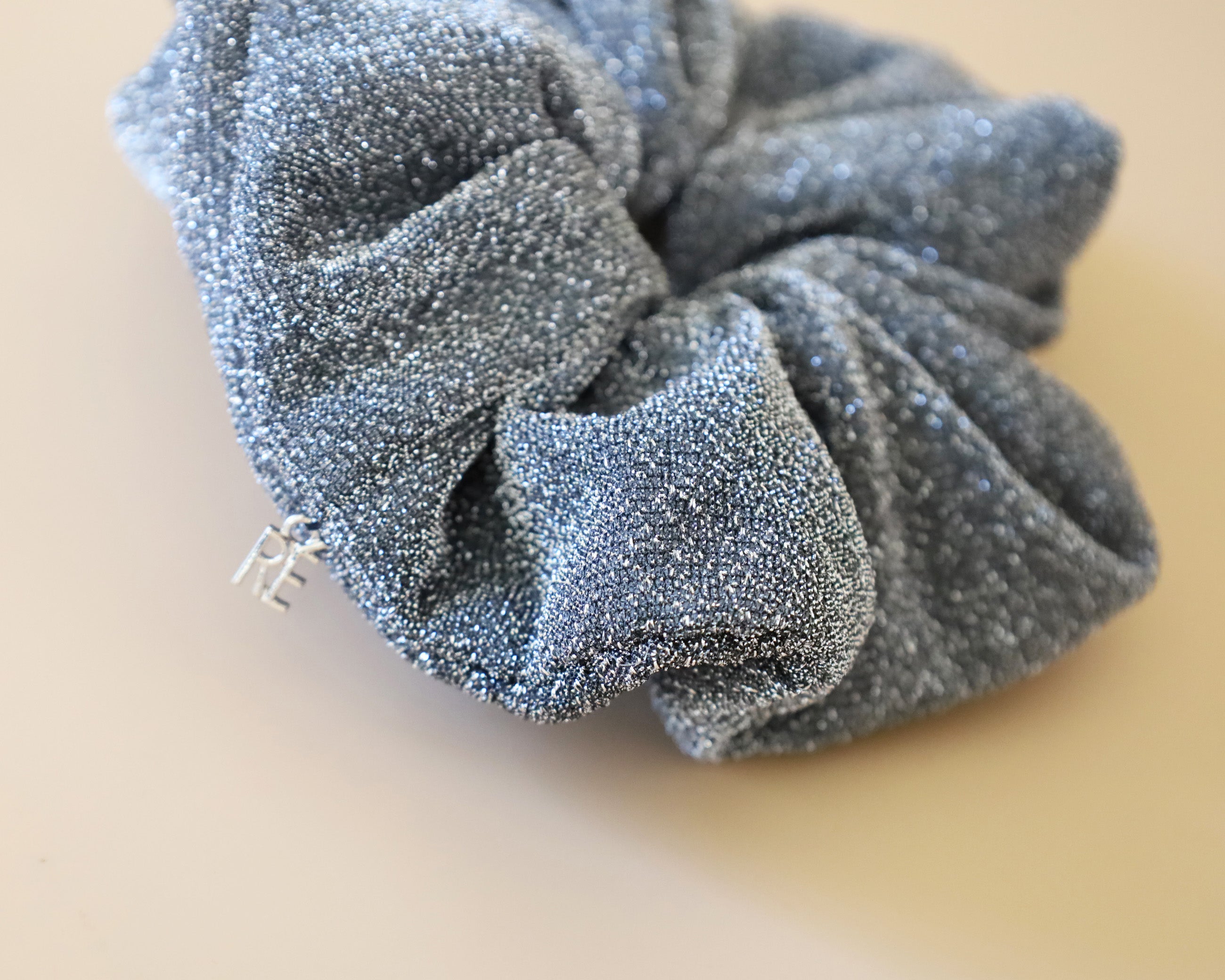 シルバーのキラキラがリッチなラメ生地のシュシュ。