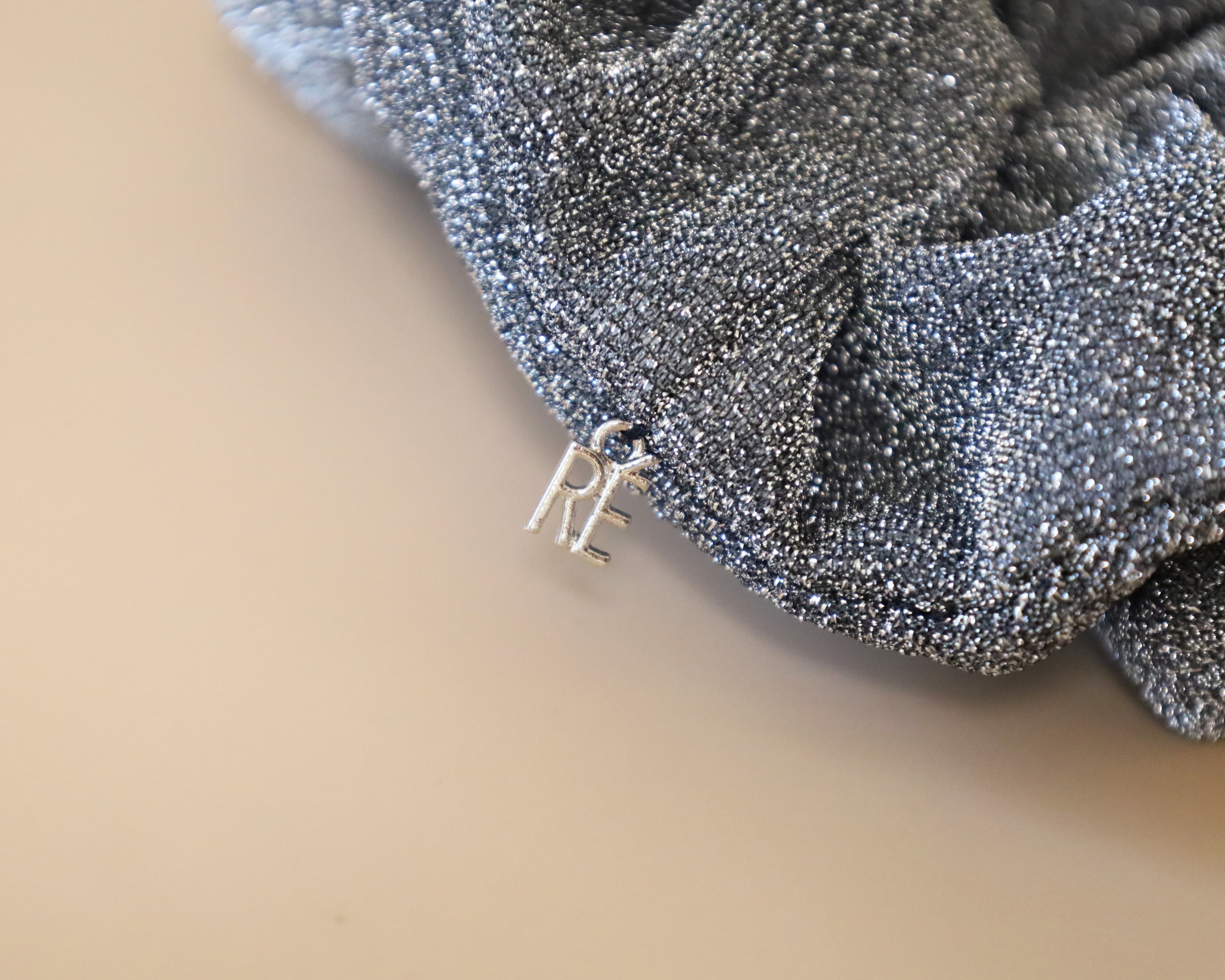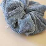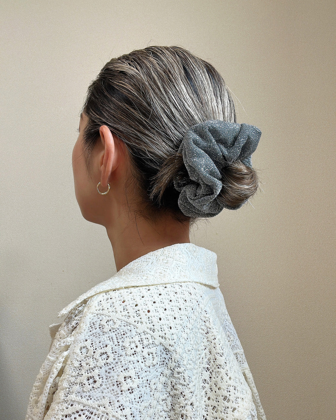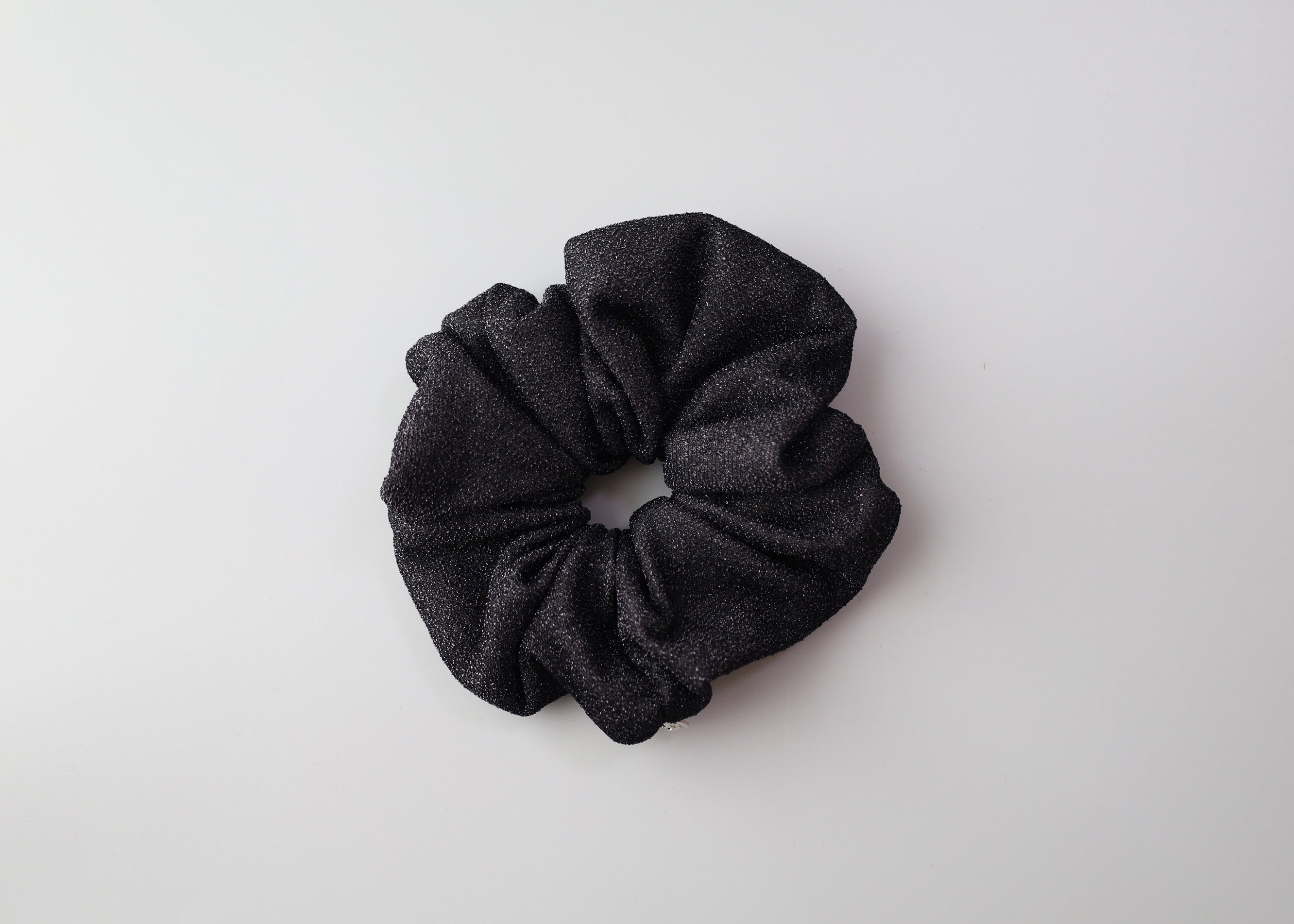 シルバーのキラキラがリッチなラメ生地のシュシュ。