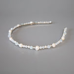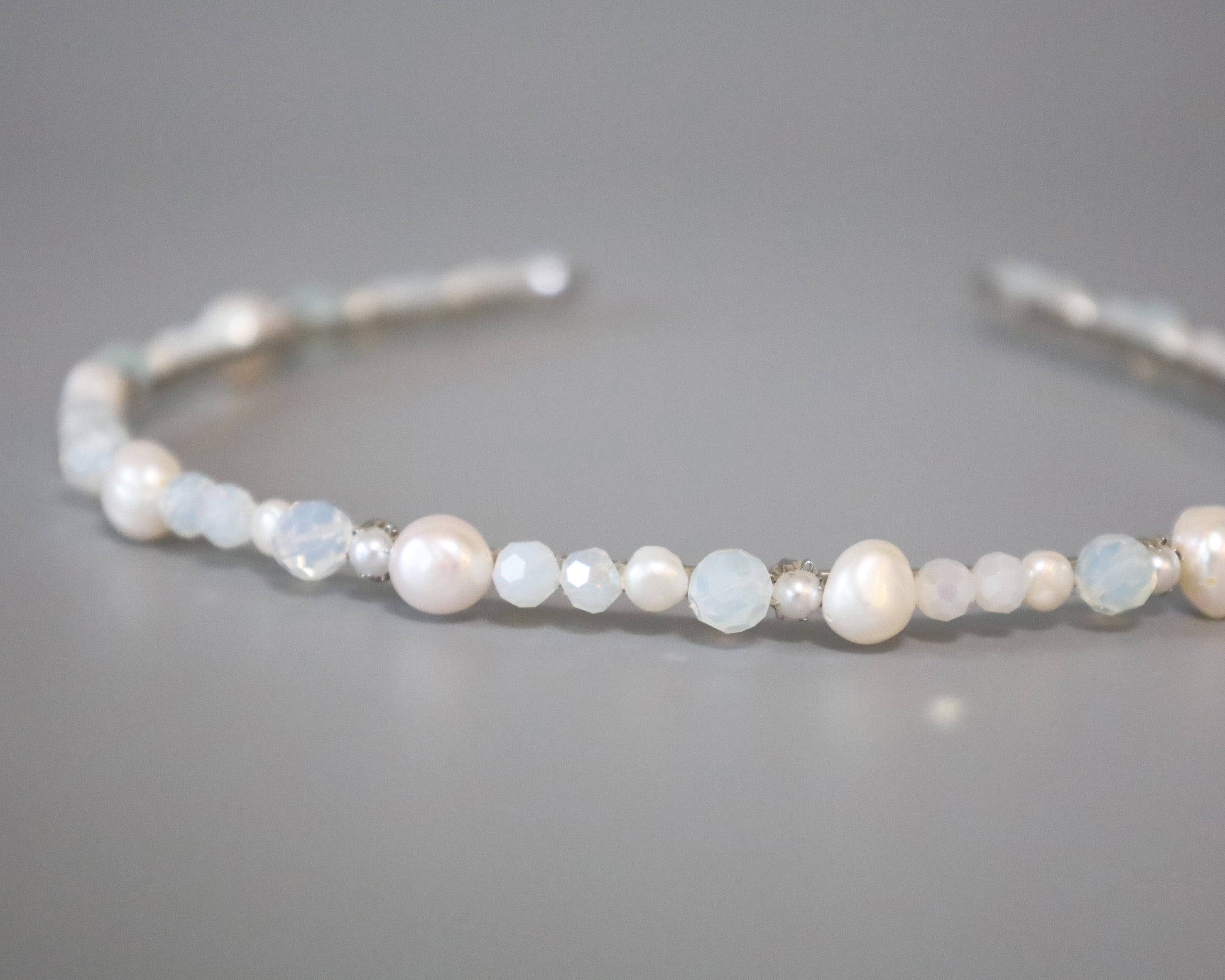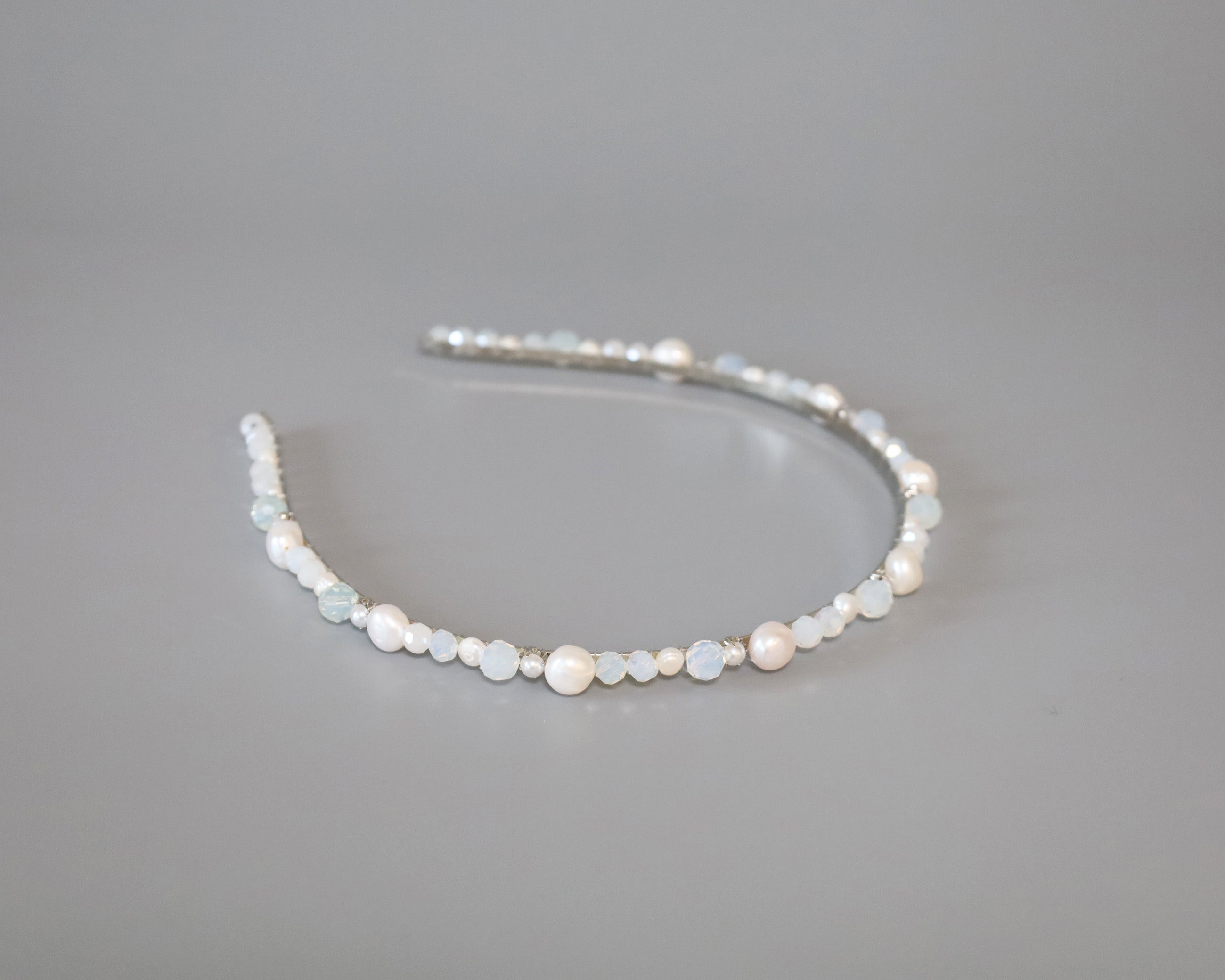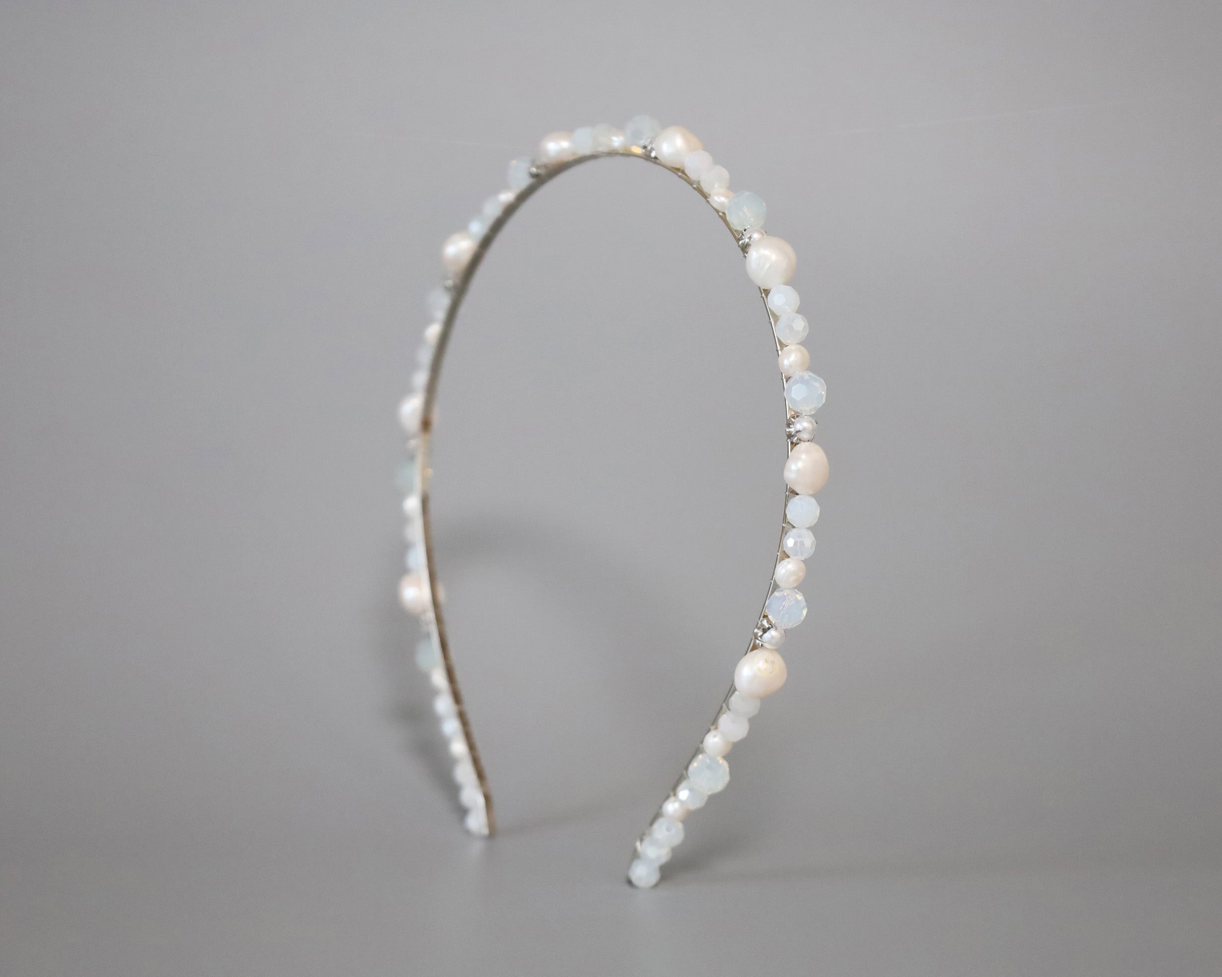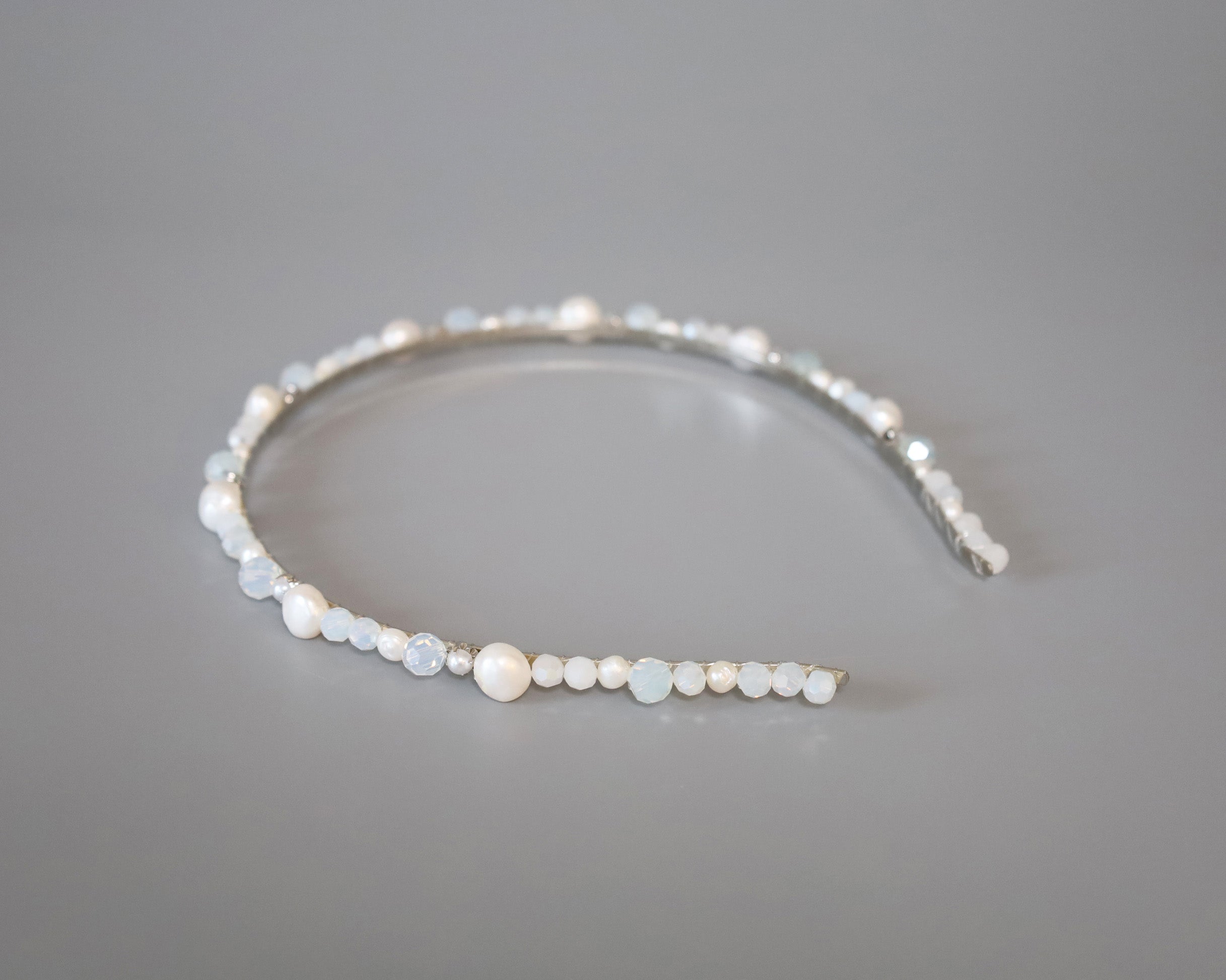 パールと乳白色のビジューを並べたロマンティックなカチューシャ。
