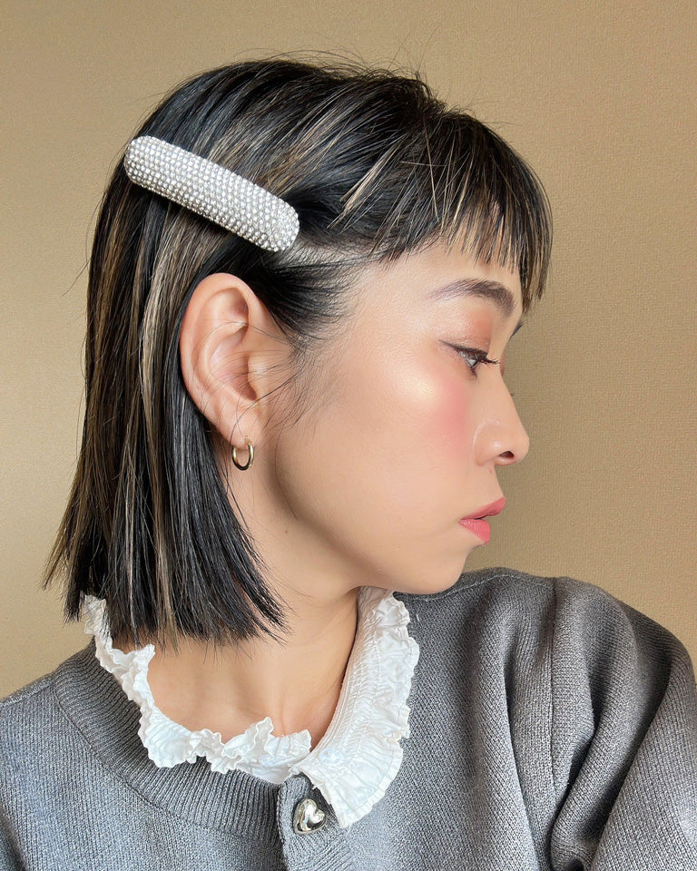 毛量少なめの方ならゴムを使わずバレッタのみでまとめるポニーテール風アレンジがこなれた雰囲気でおすすめ。