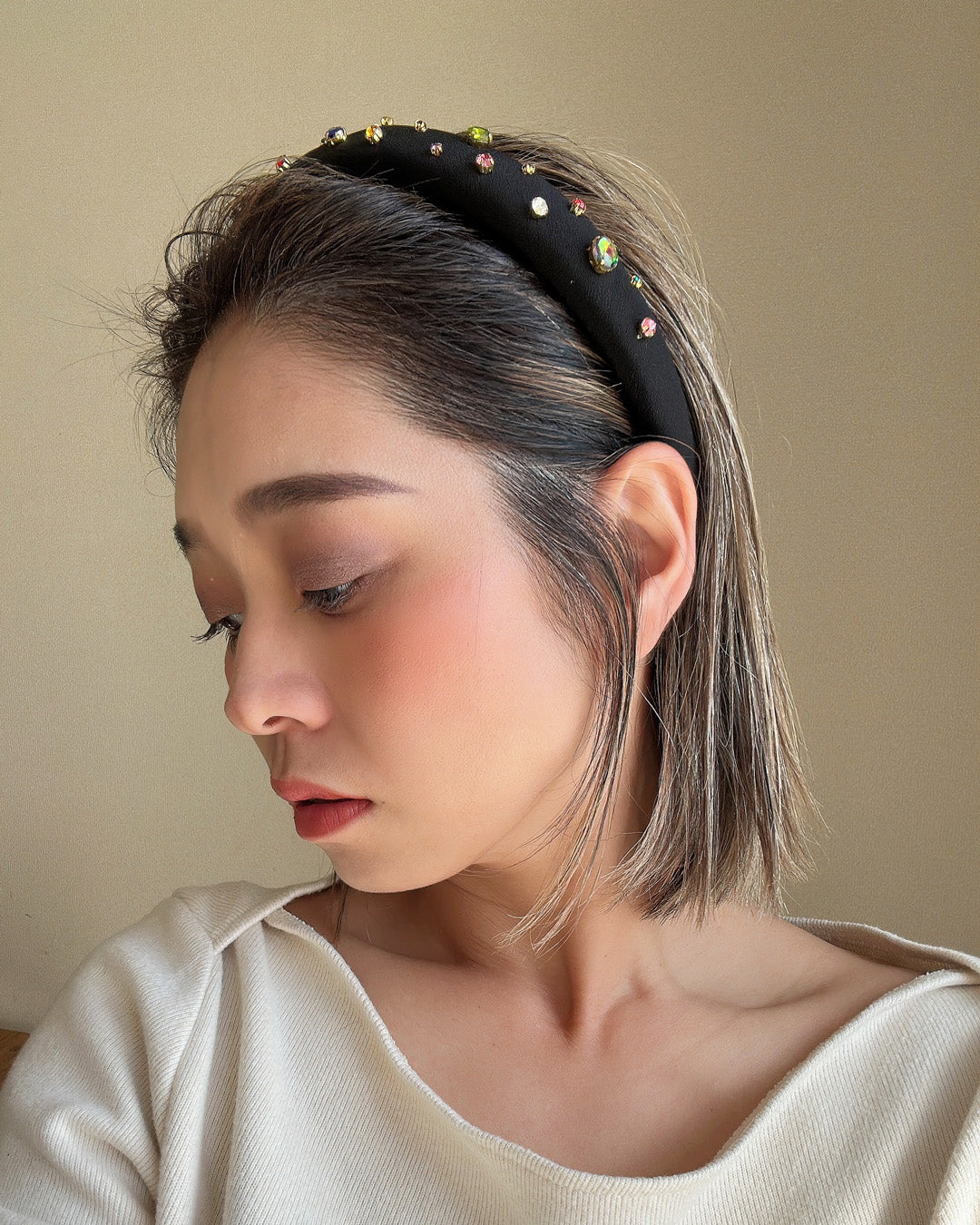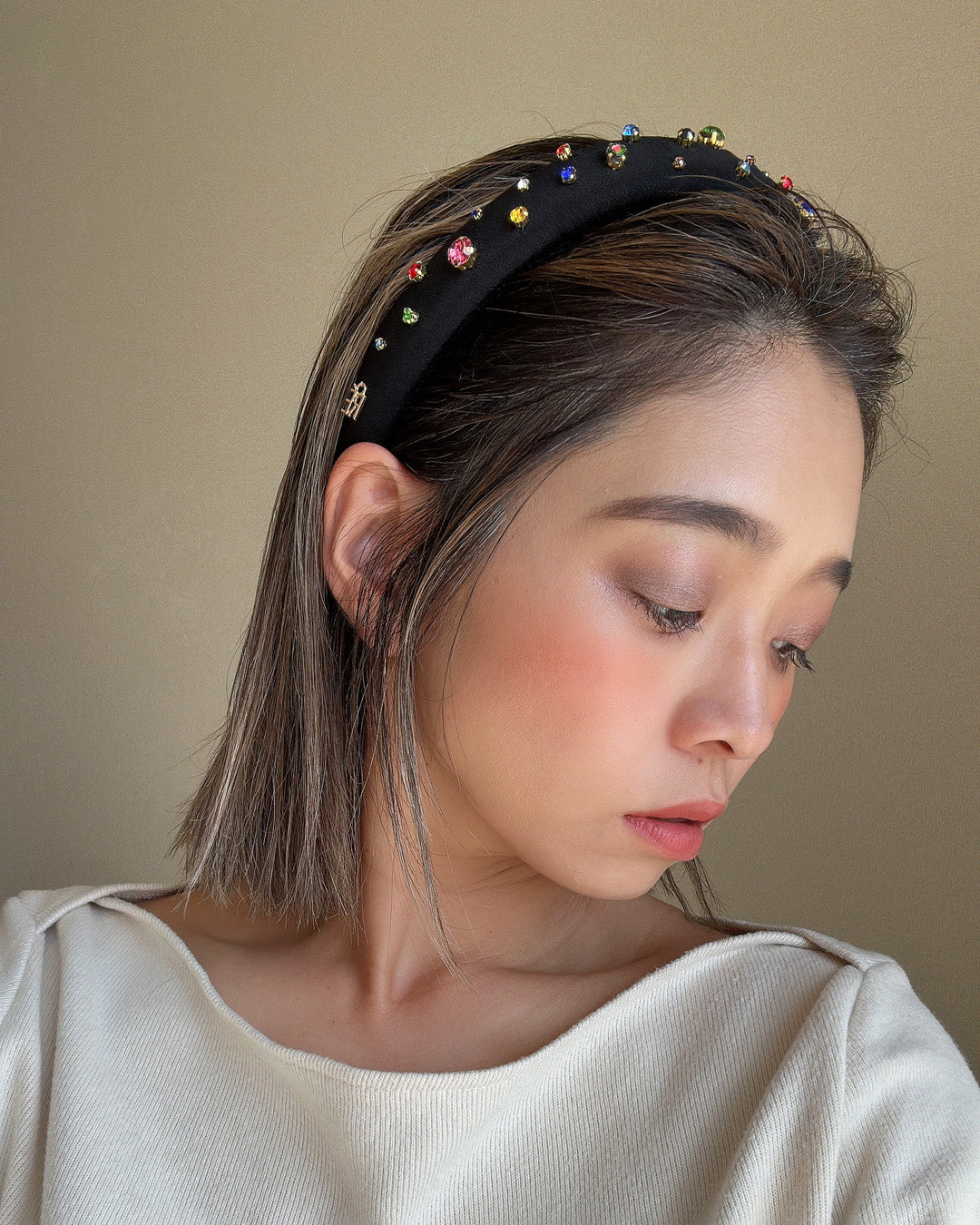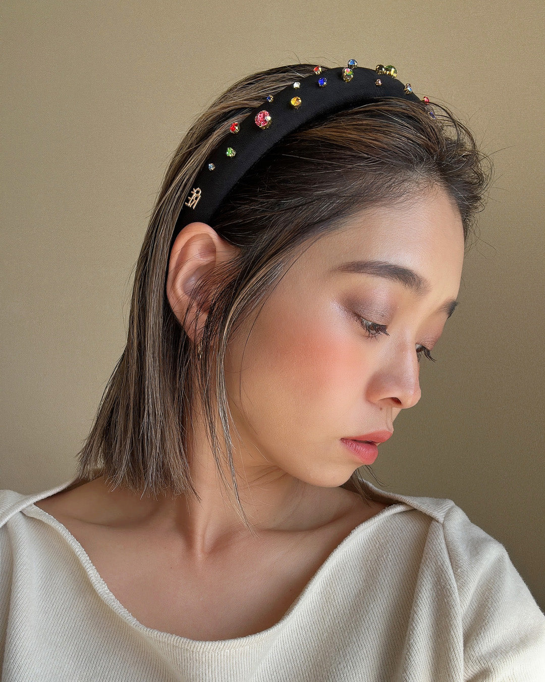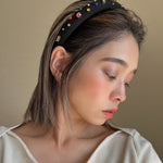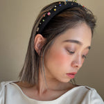 ブラックのシルク生地を土台に、カラフルなビジューがきらめくロマンティックなデザインのカチューシャ。