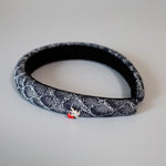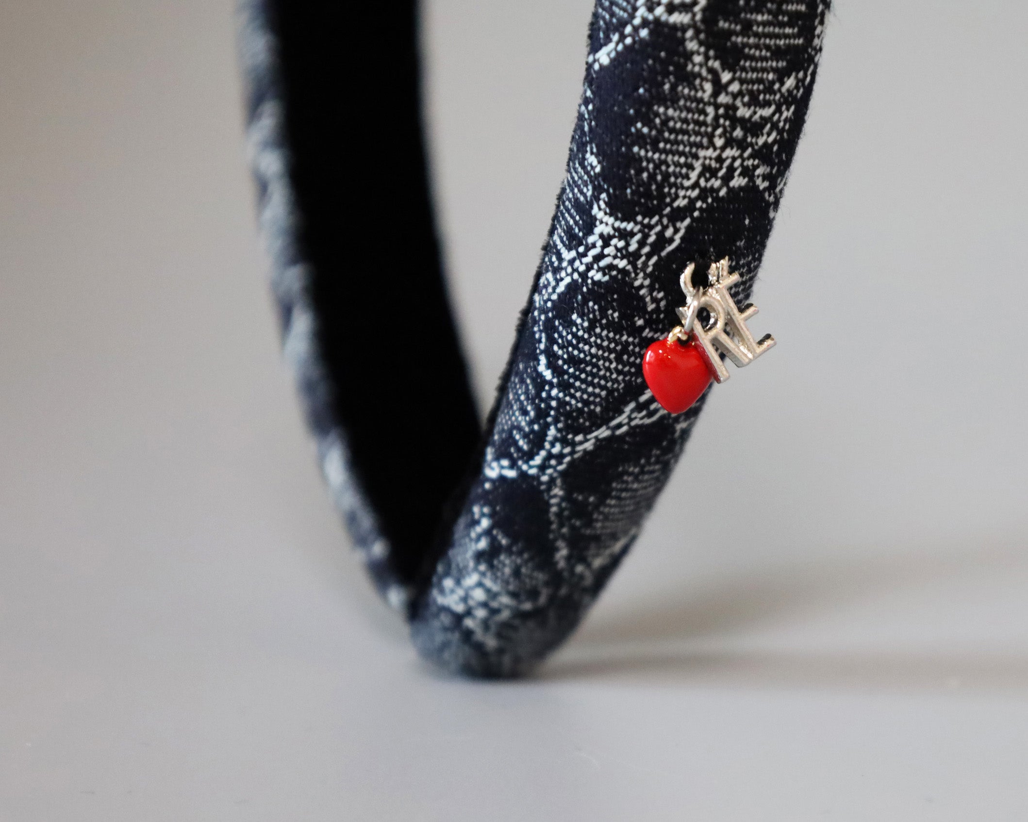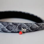 ヘビ柄のハードさに赤いハートのチャームが際立つデザイン。