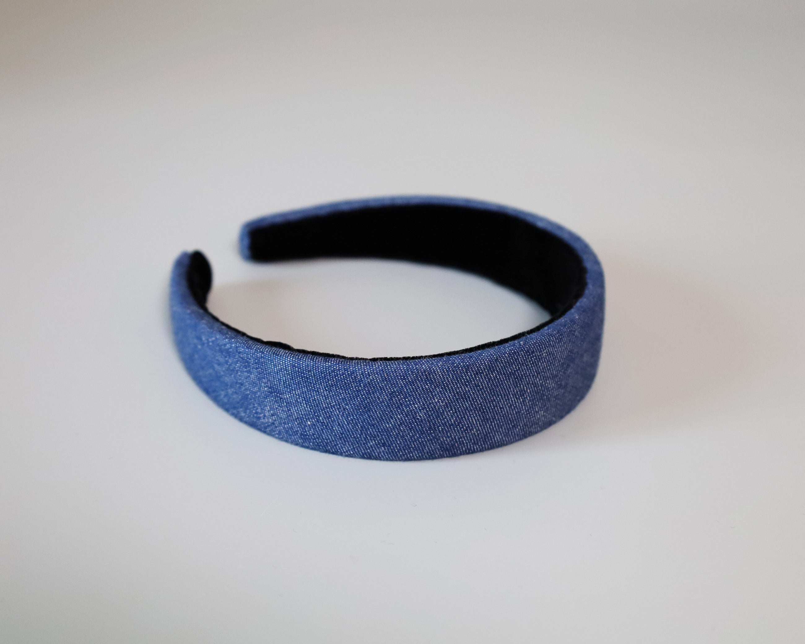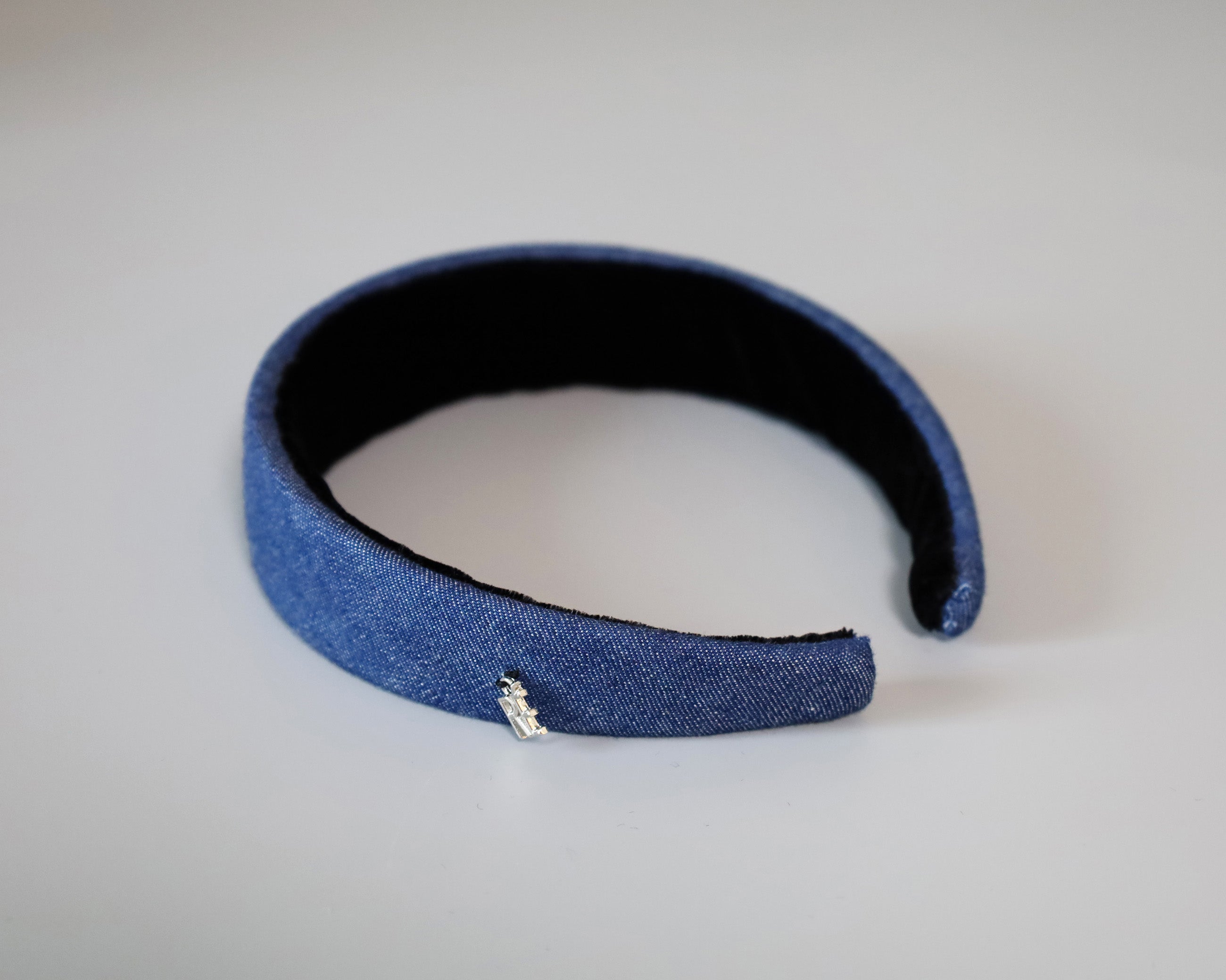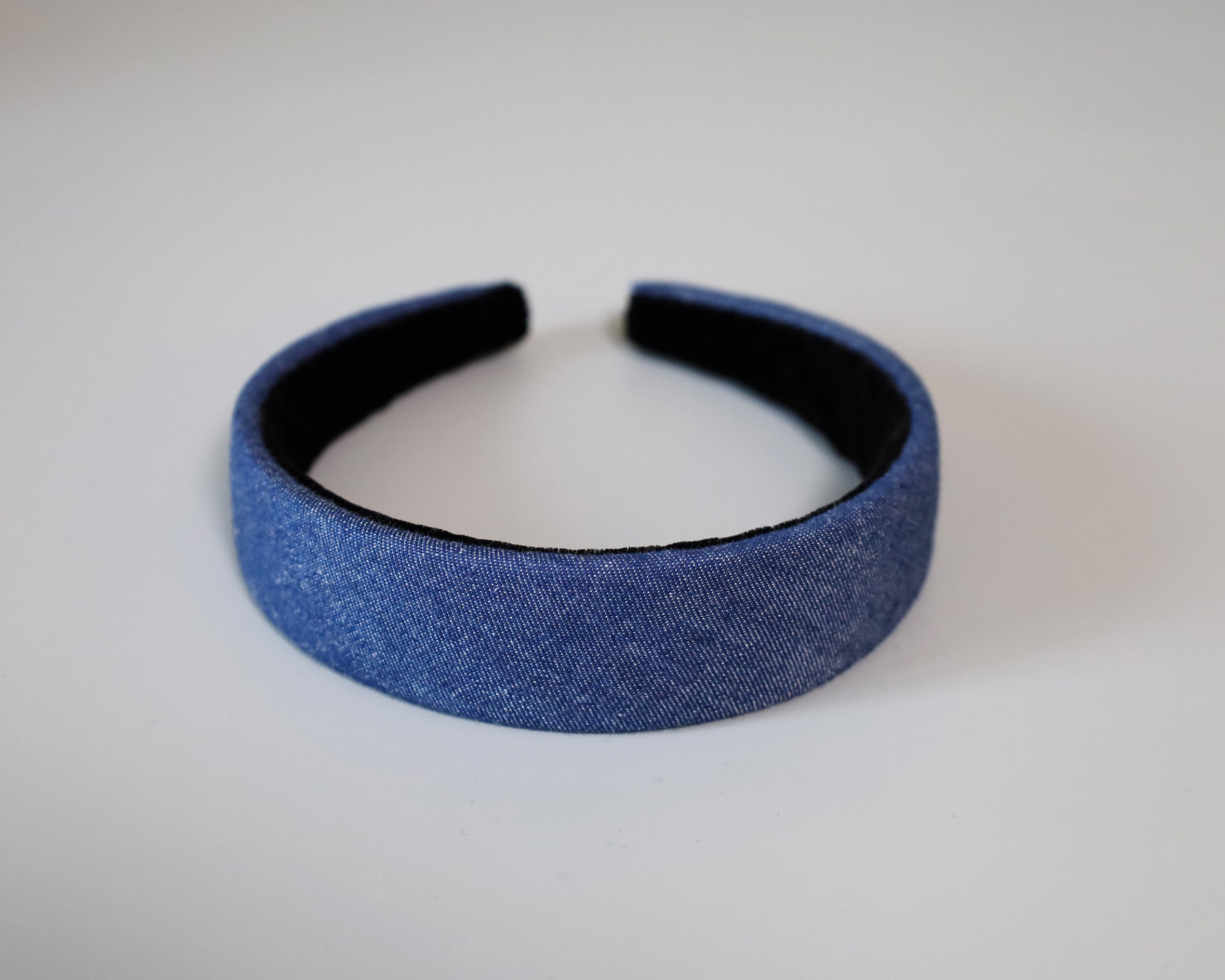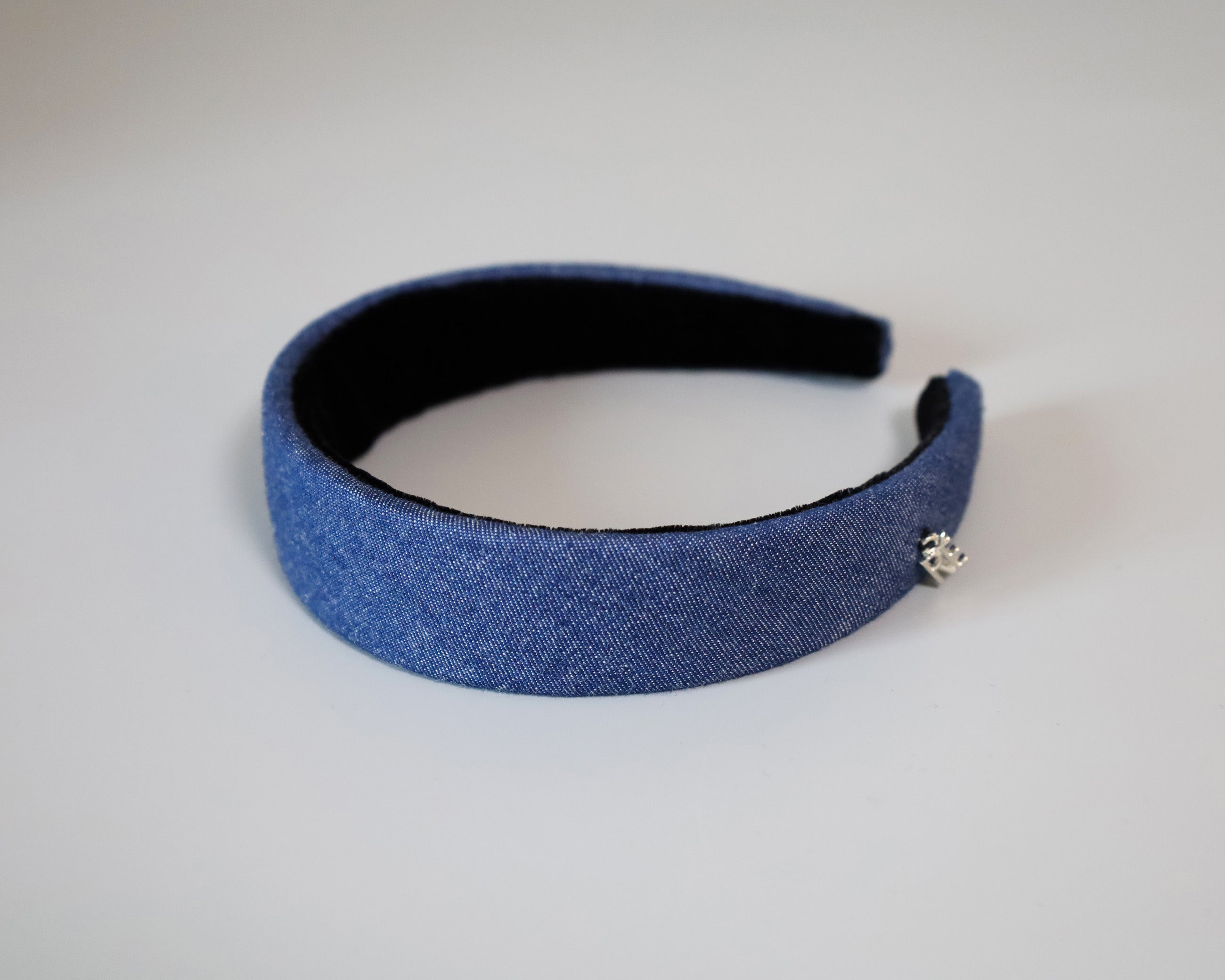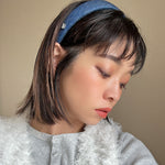 カジュアルながら落ち着きのあるブルーデニムの幅広カチューシャ。