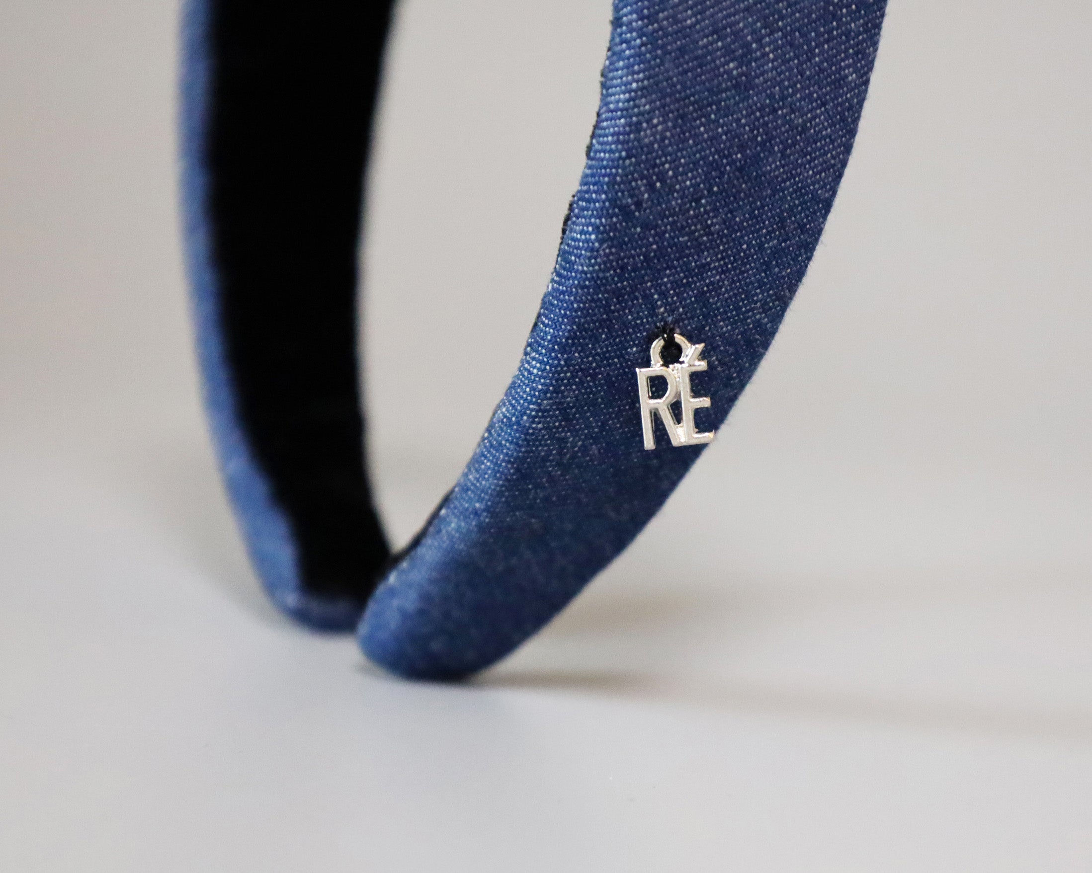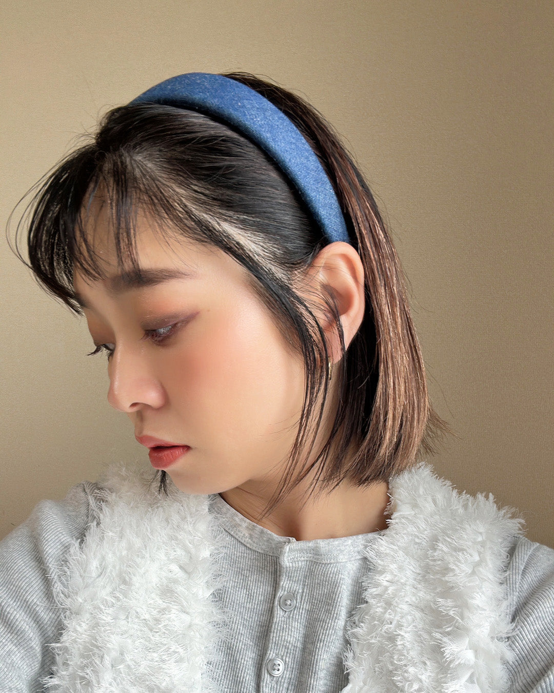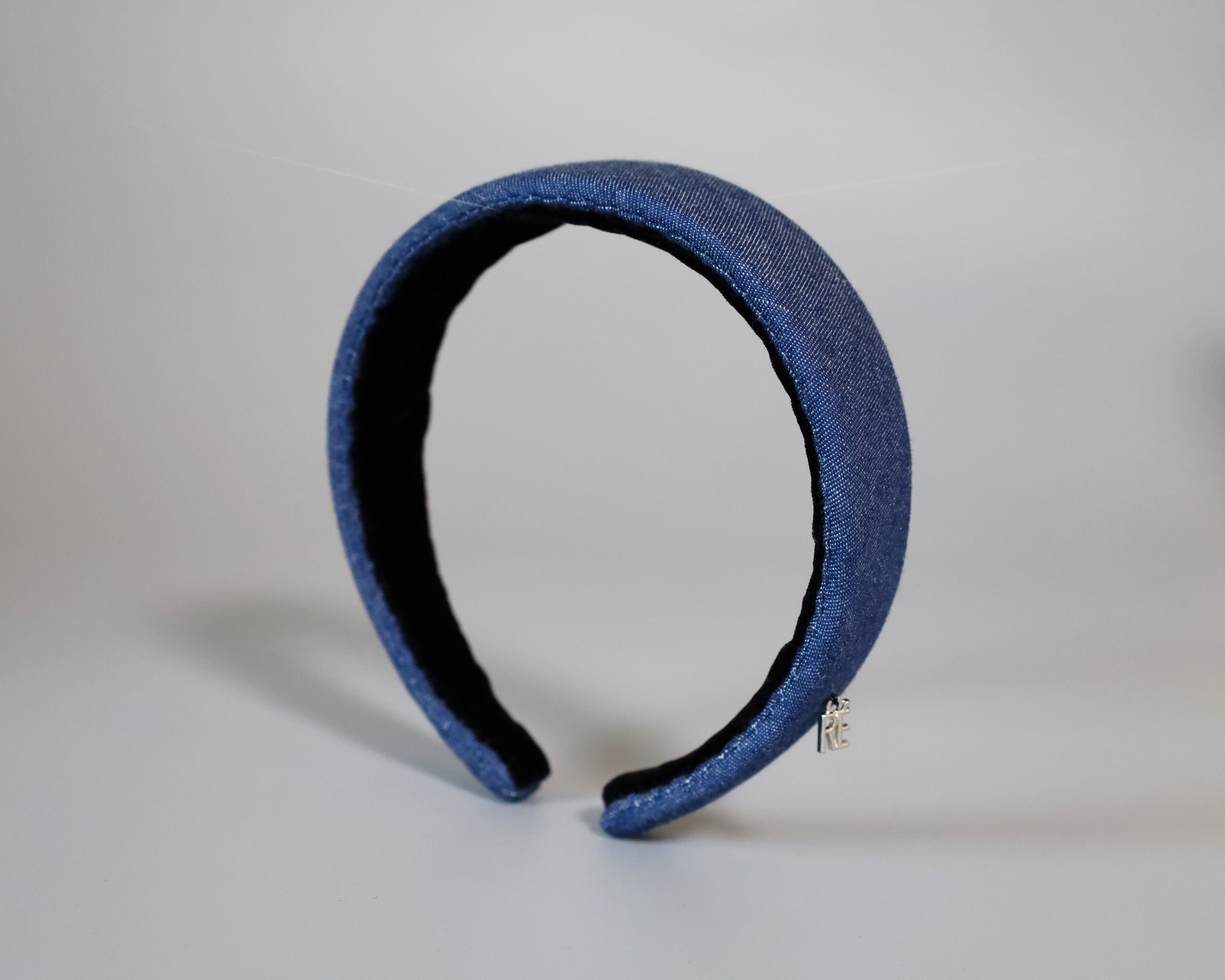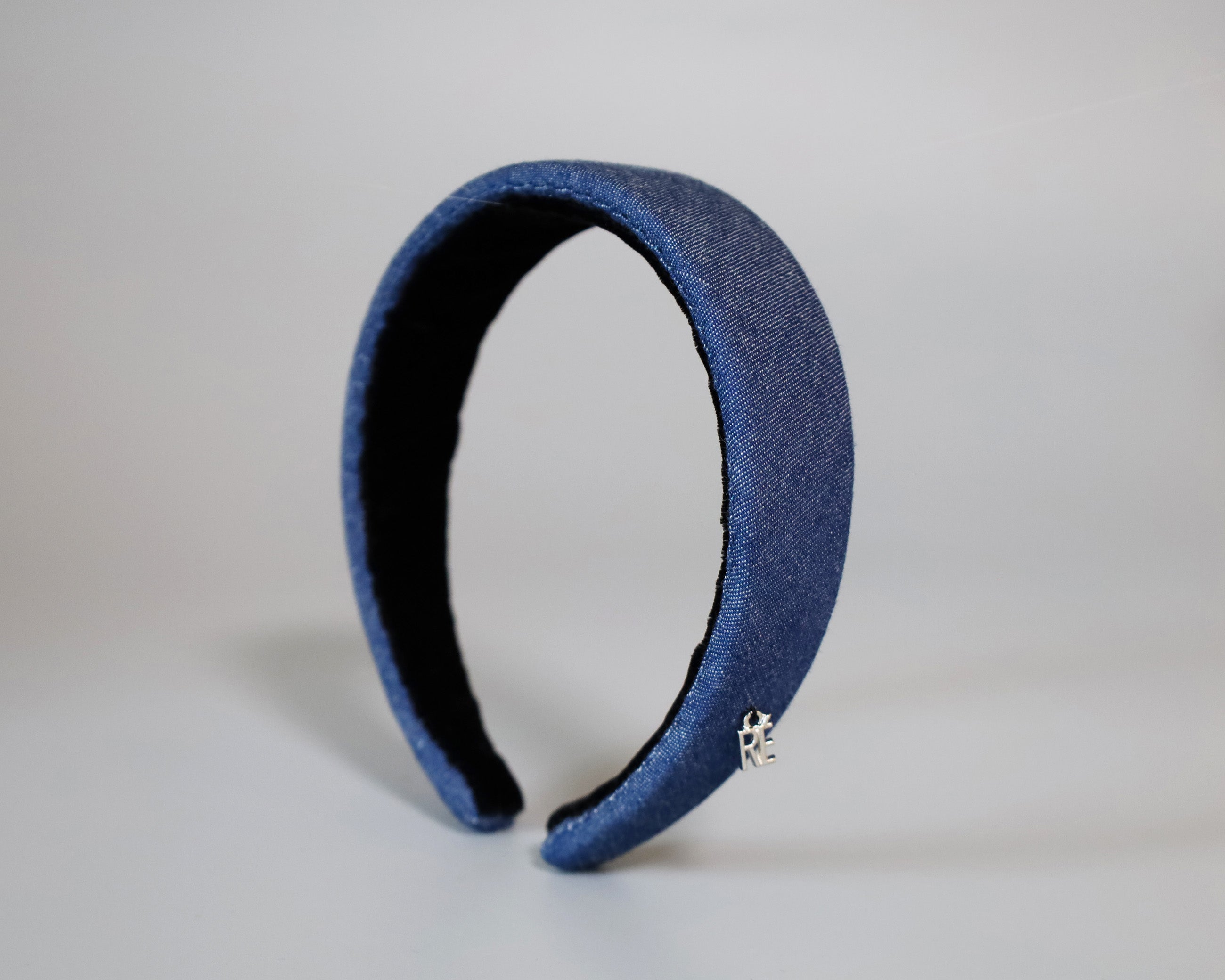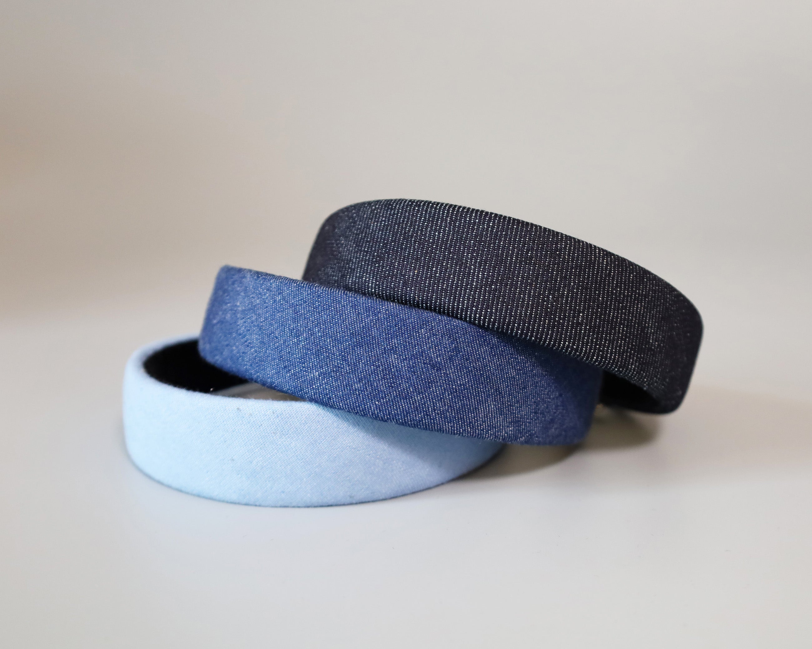 カジュアルながら落ち着きのあるブルーデニムの幅広カチューシャ。