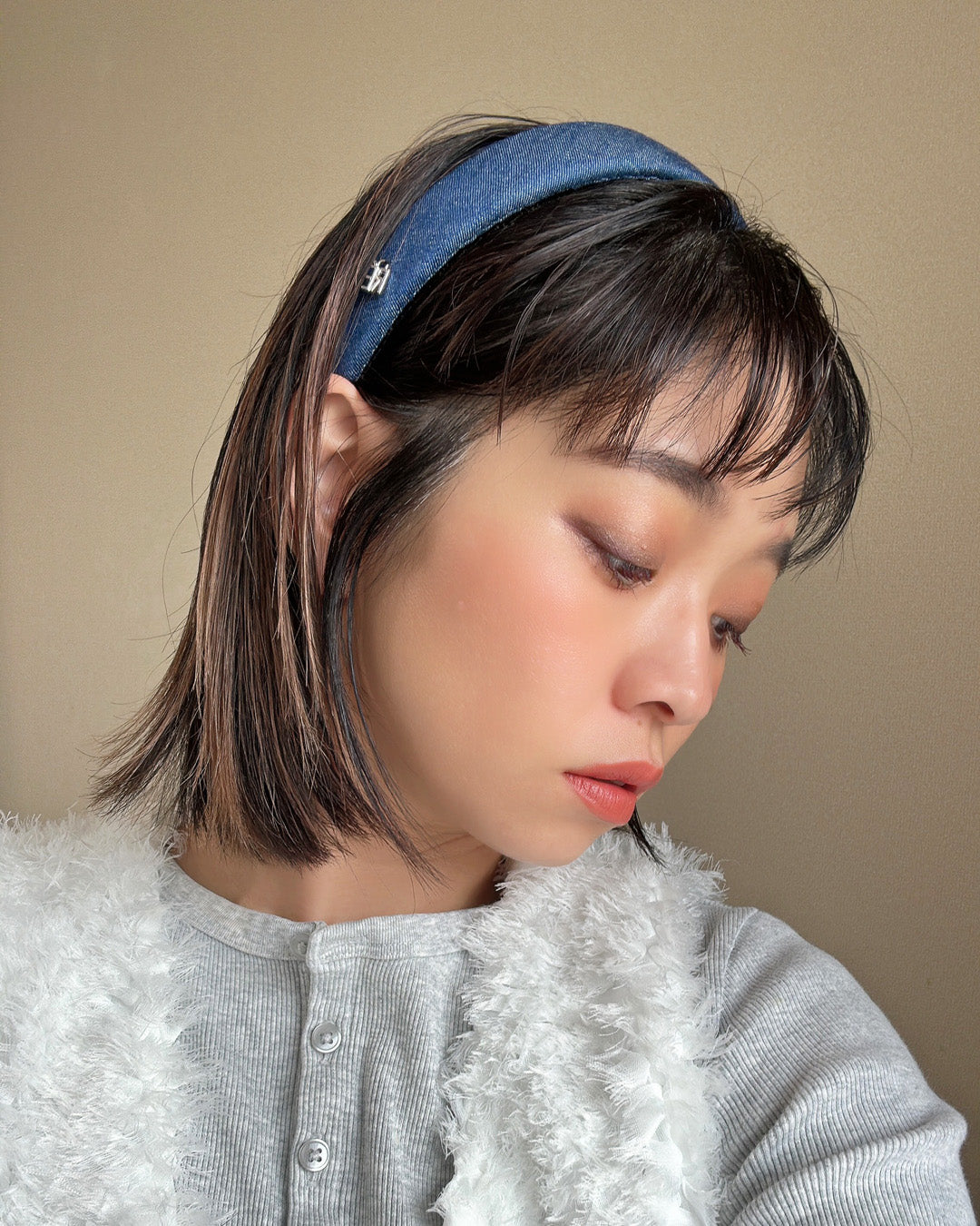 まとめ髪にもダウンヘアにもハマるデニムカチューシャです。