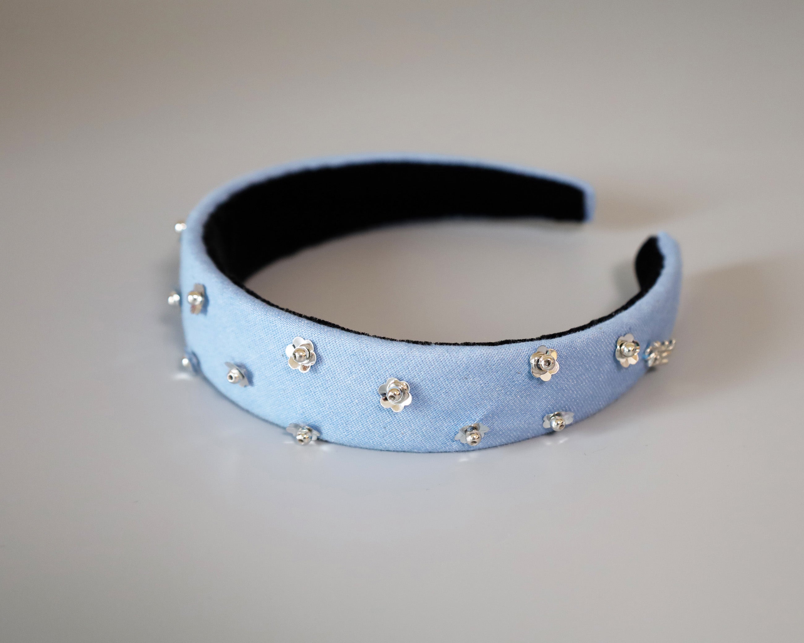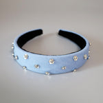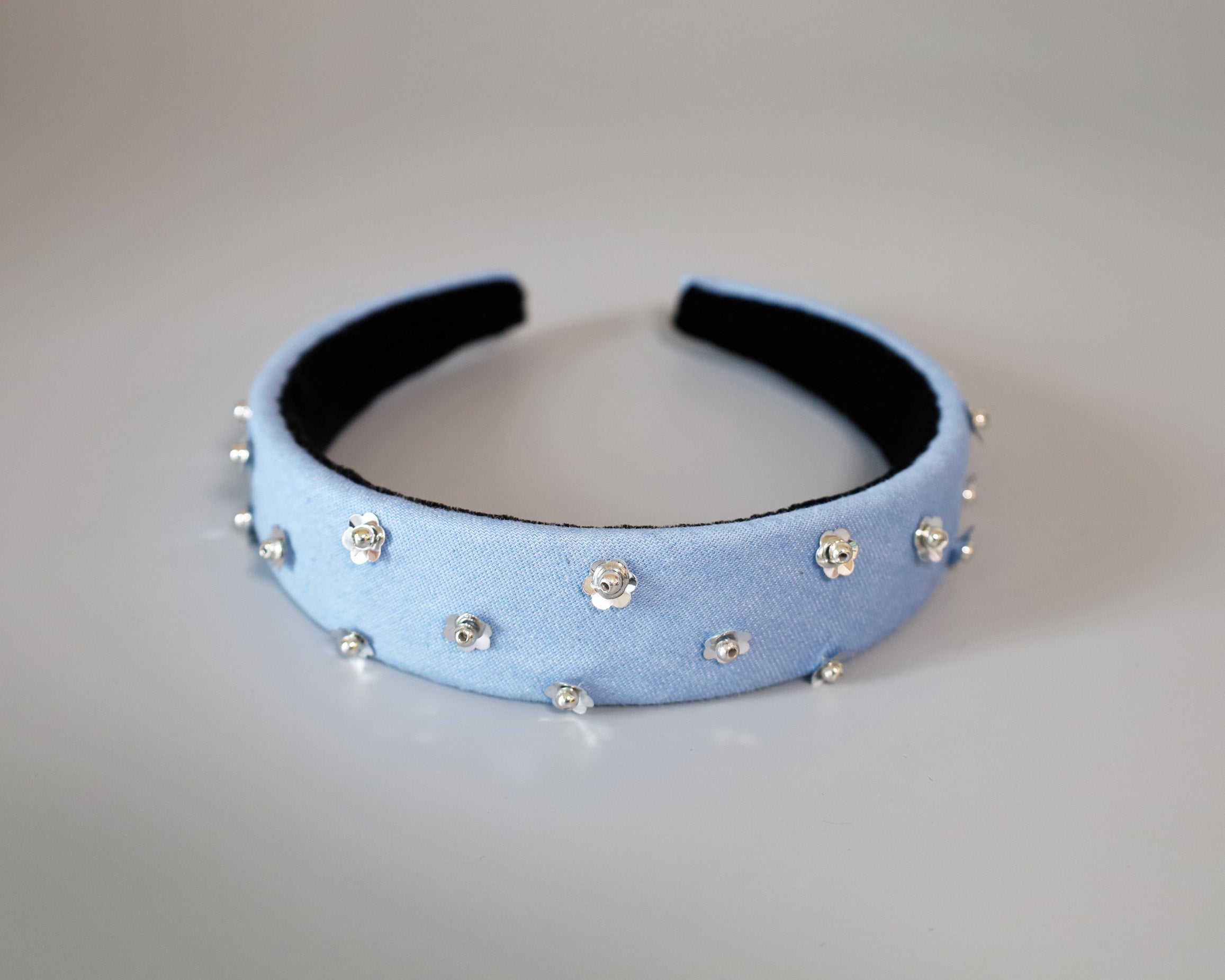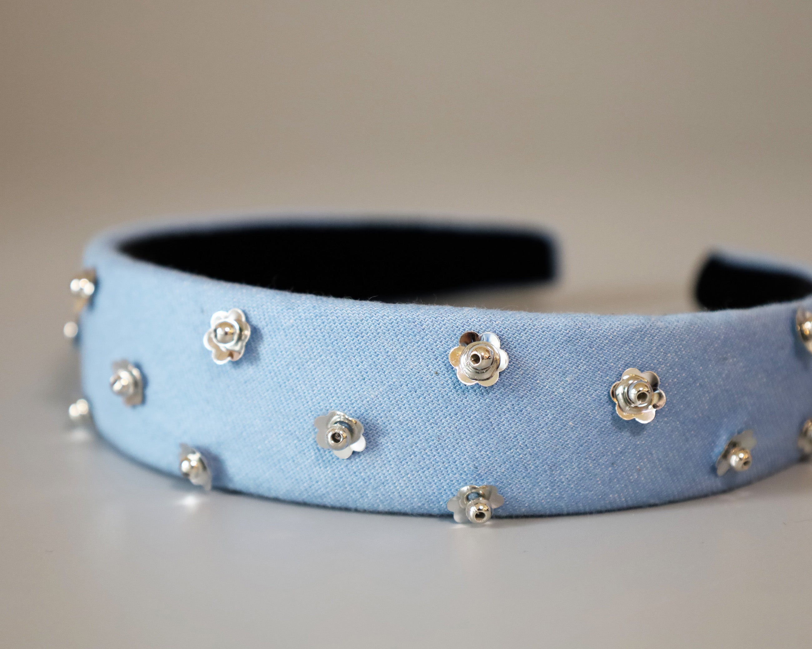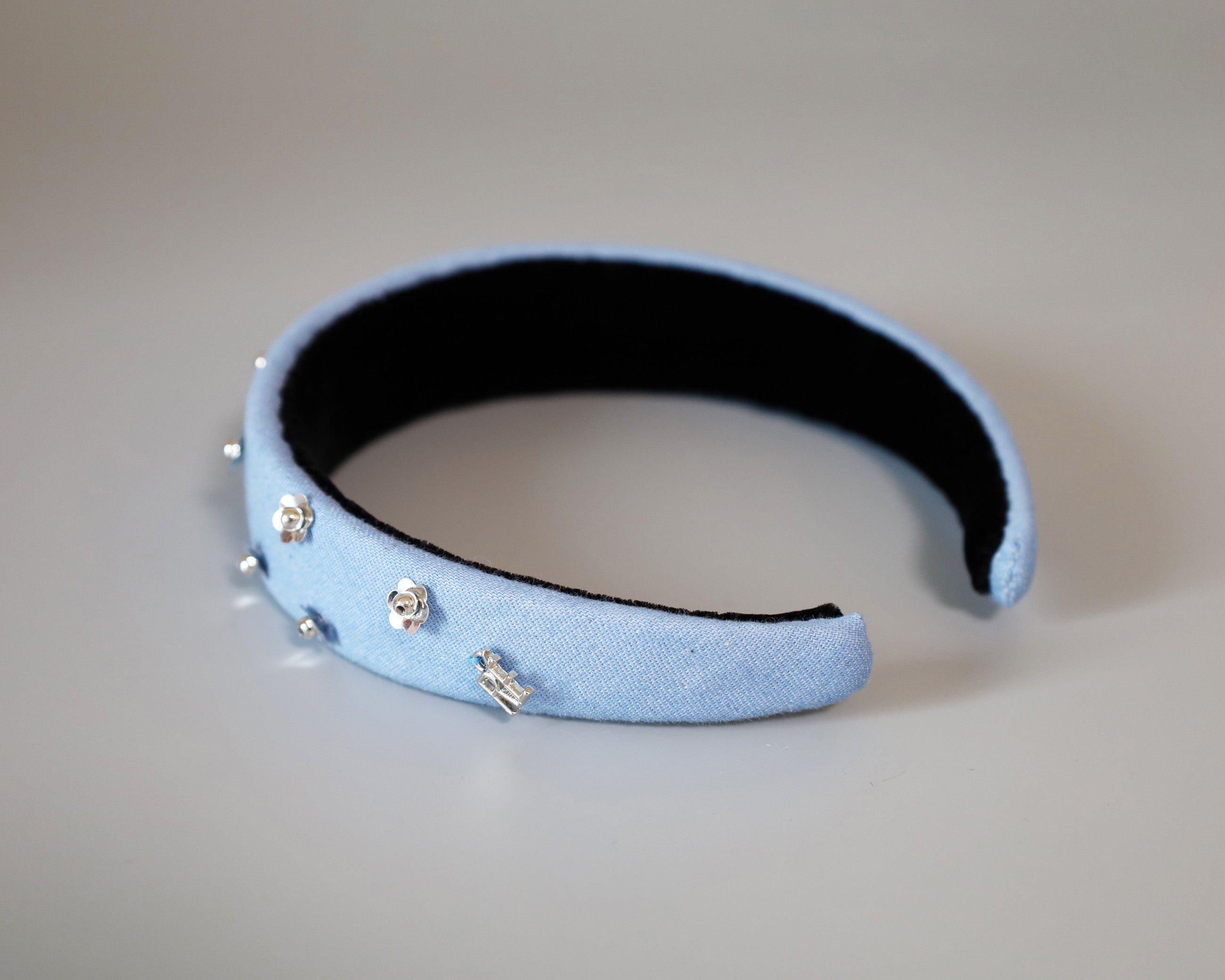 ライトブルーの幅広デニムのカチューシャ。
