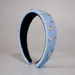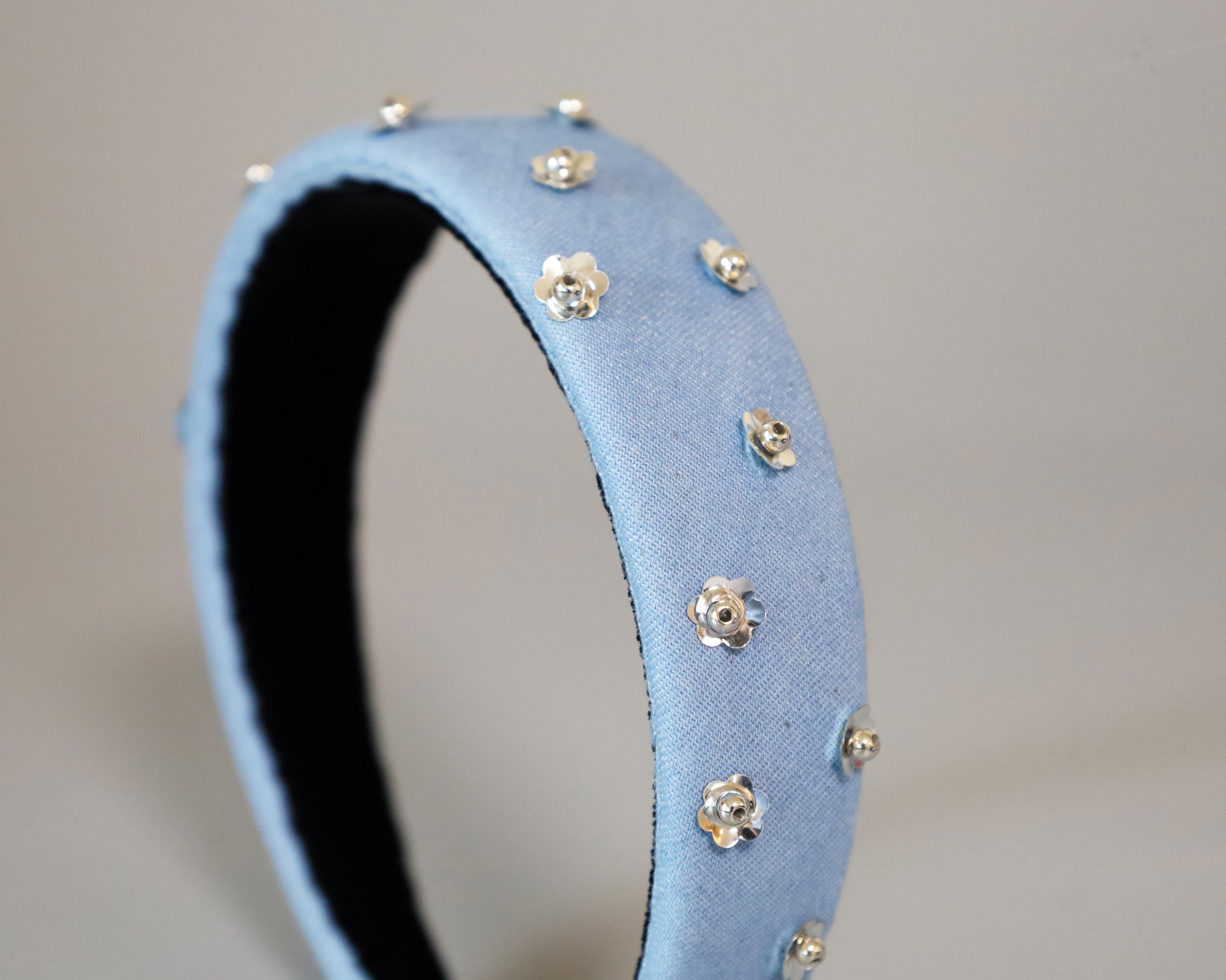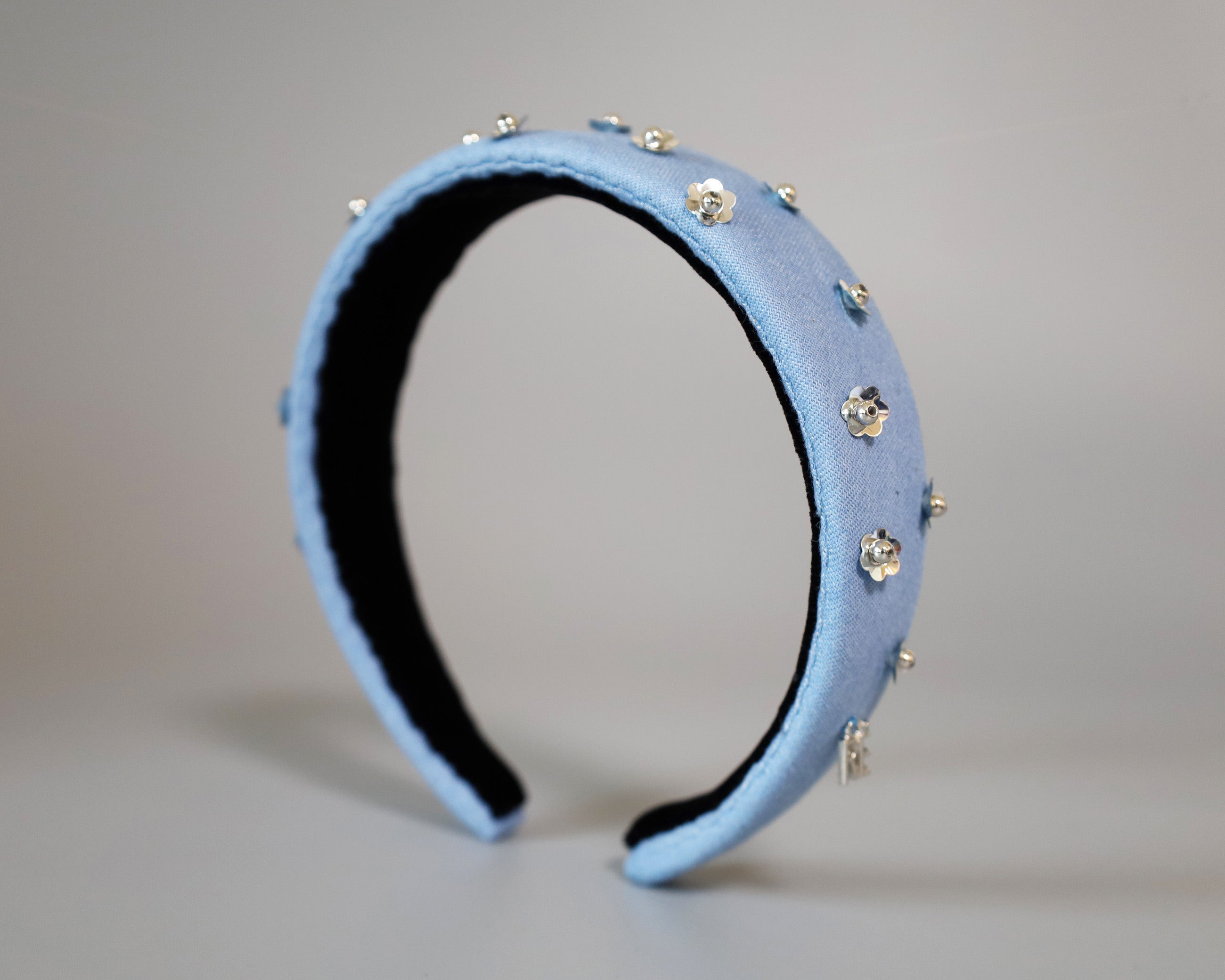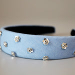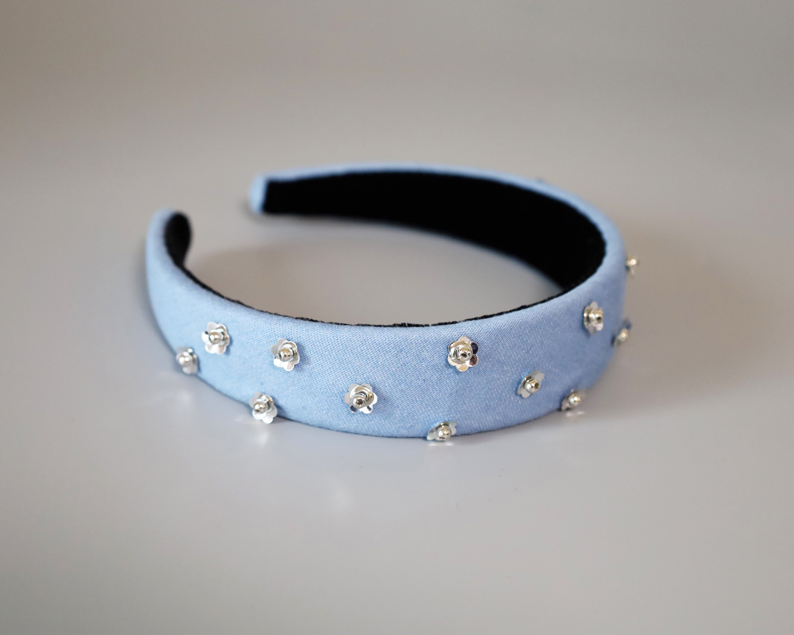 ライトブルーの幅広デニムのカチューシャ。