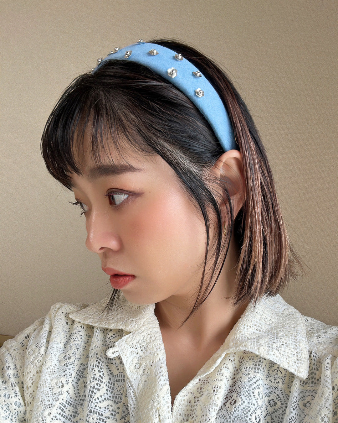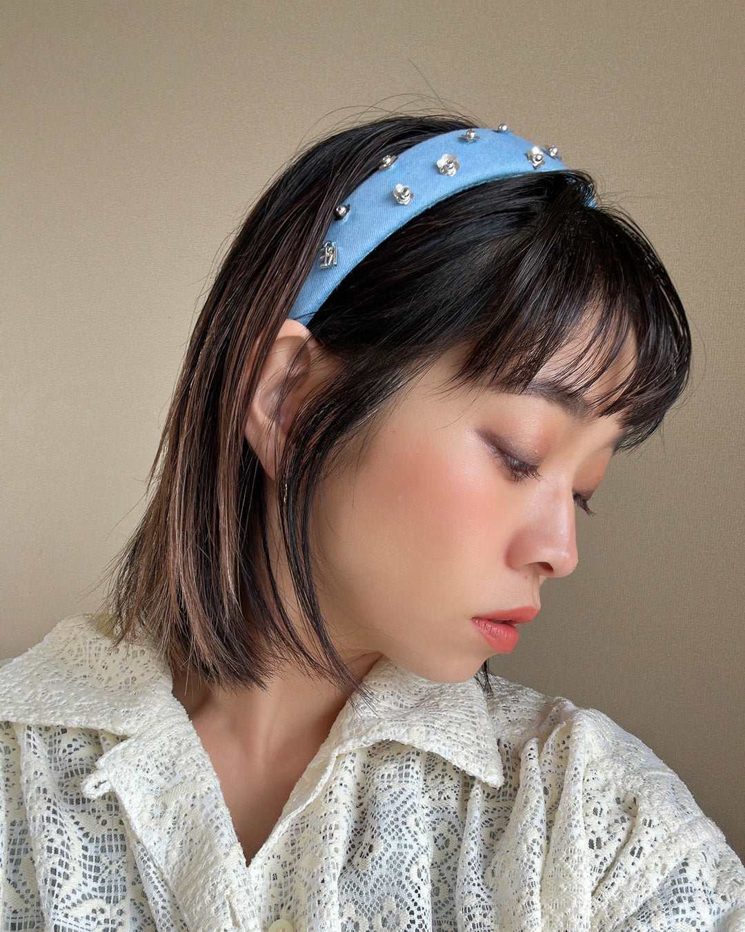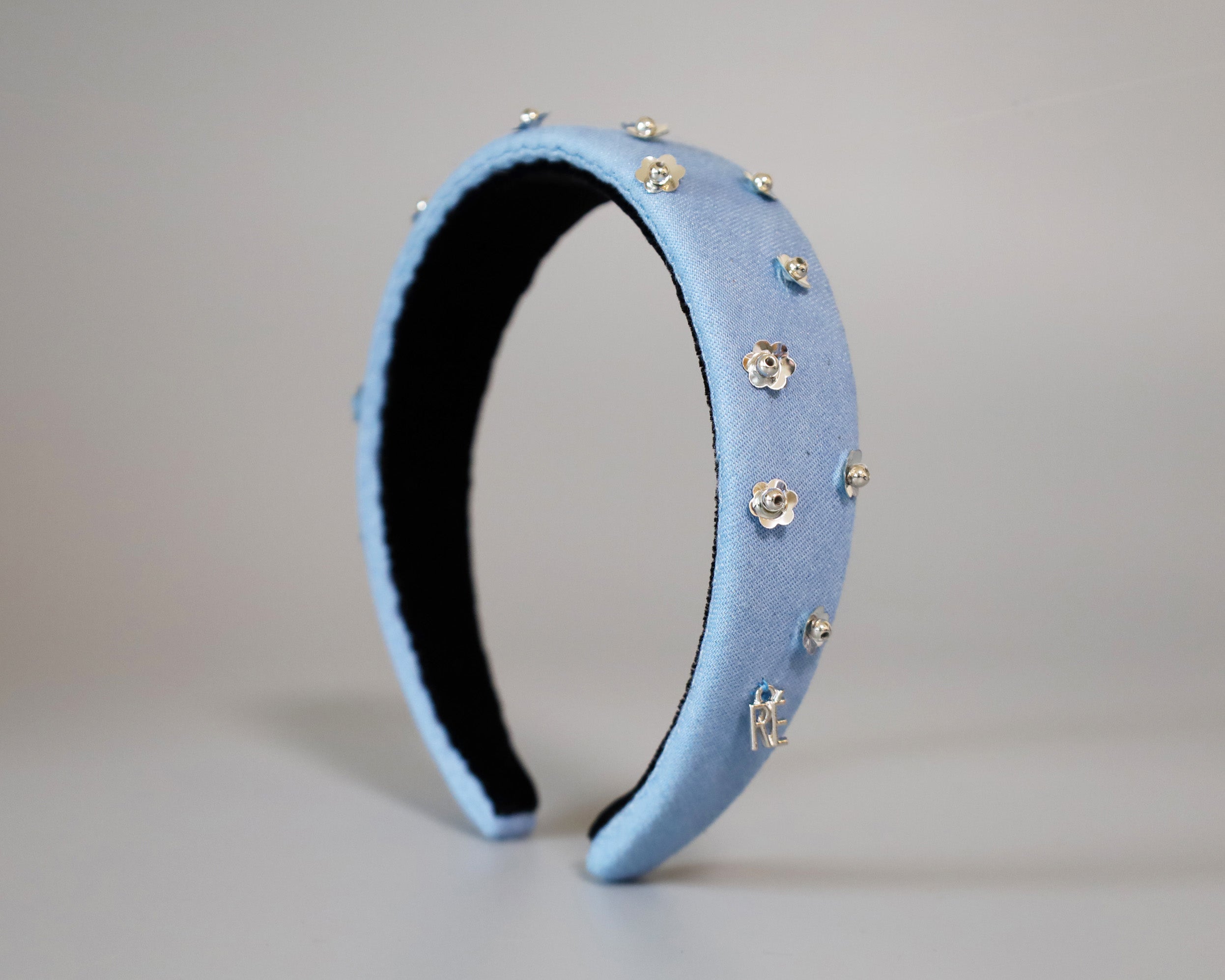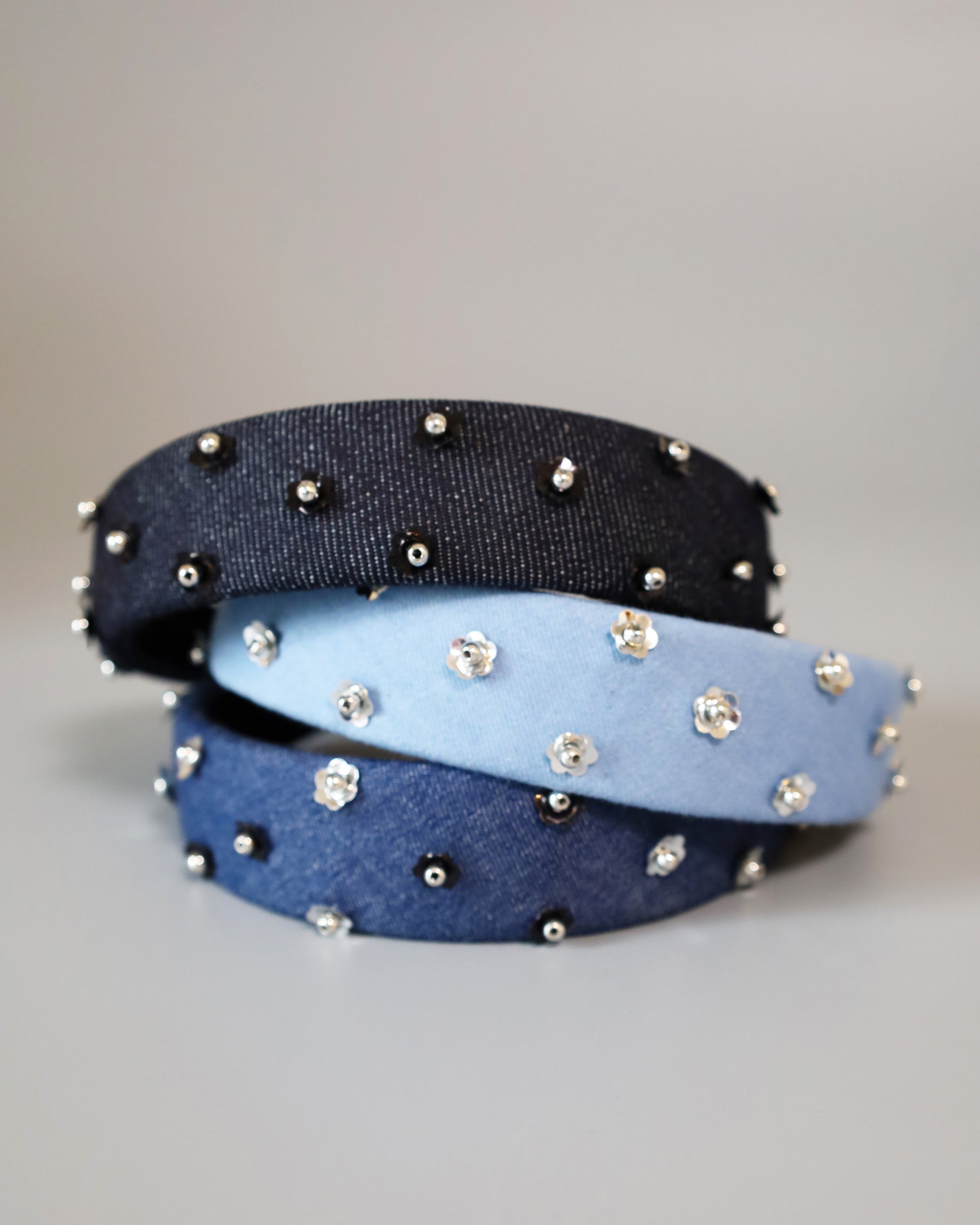 ライトブルーの幅広デニムのカチューシャ。