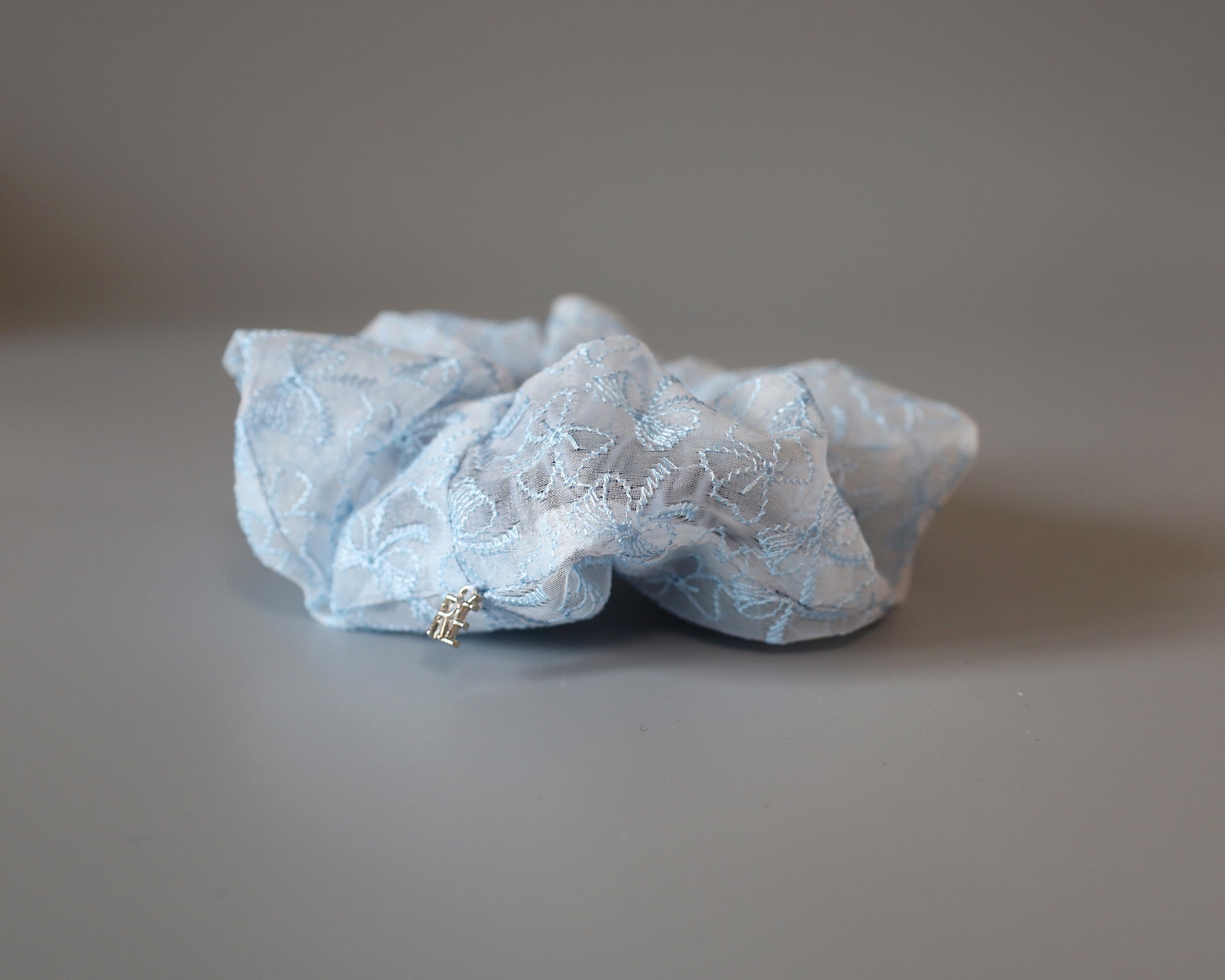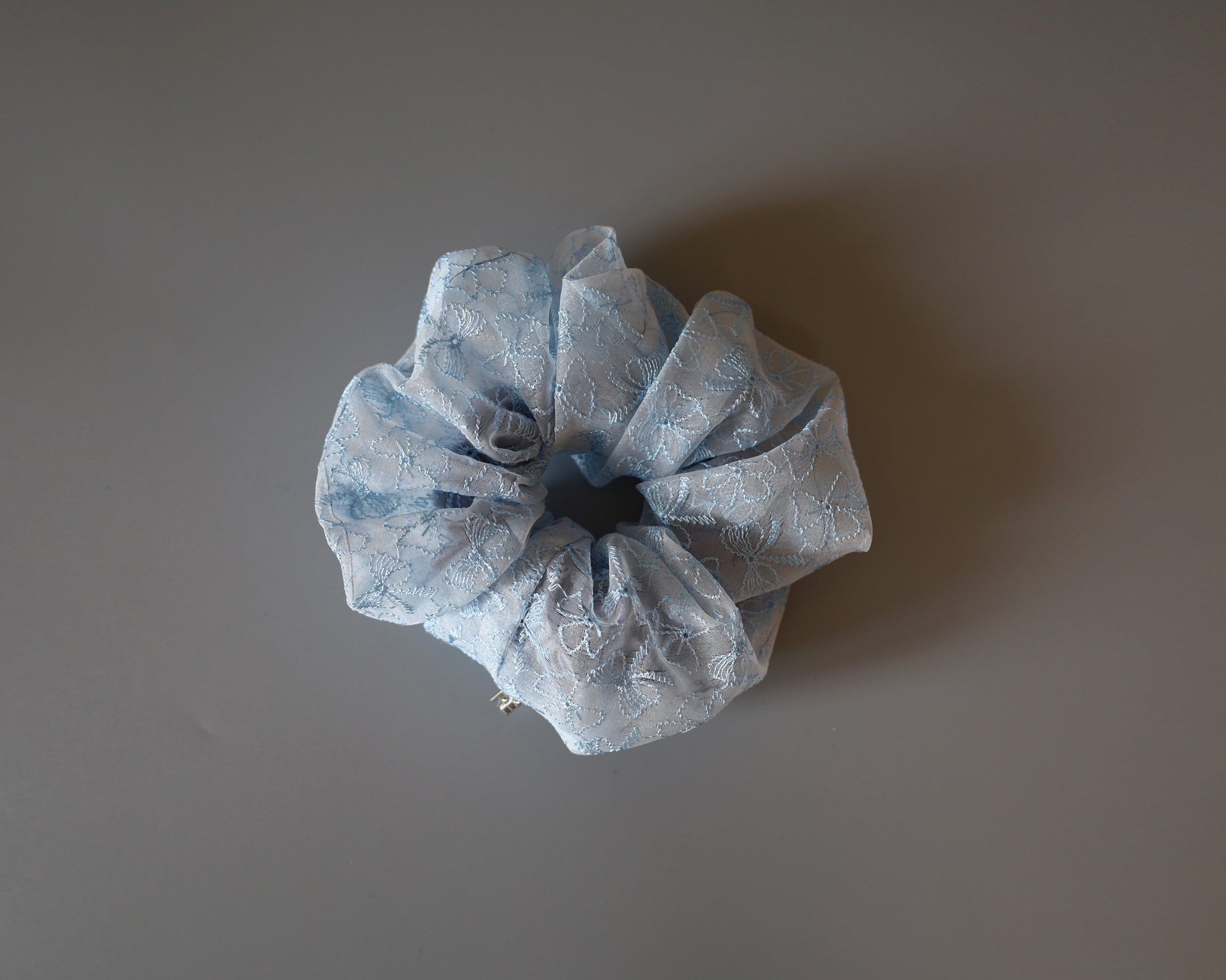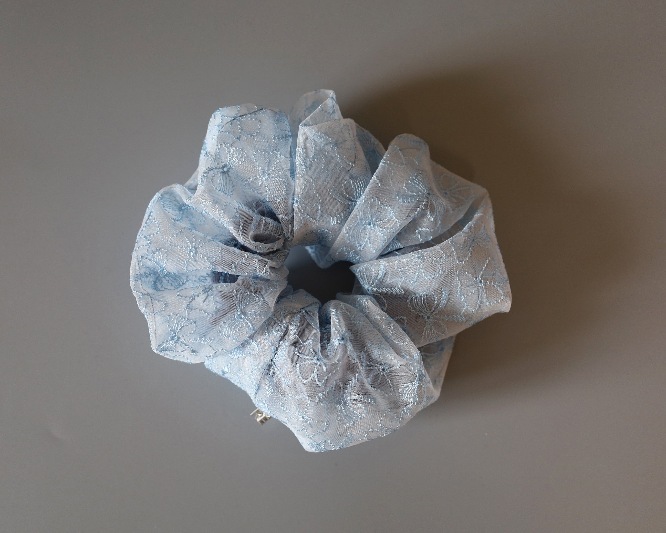 砂糖菓子のようなやわらかで淡いブルーのリボン柄シュシュ。