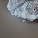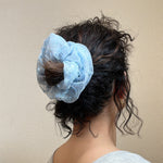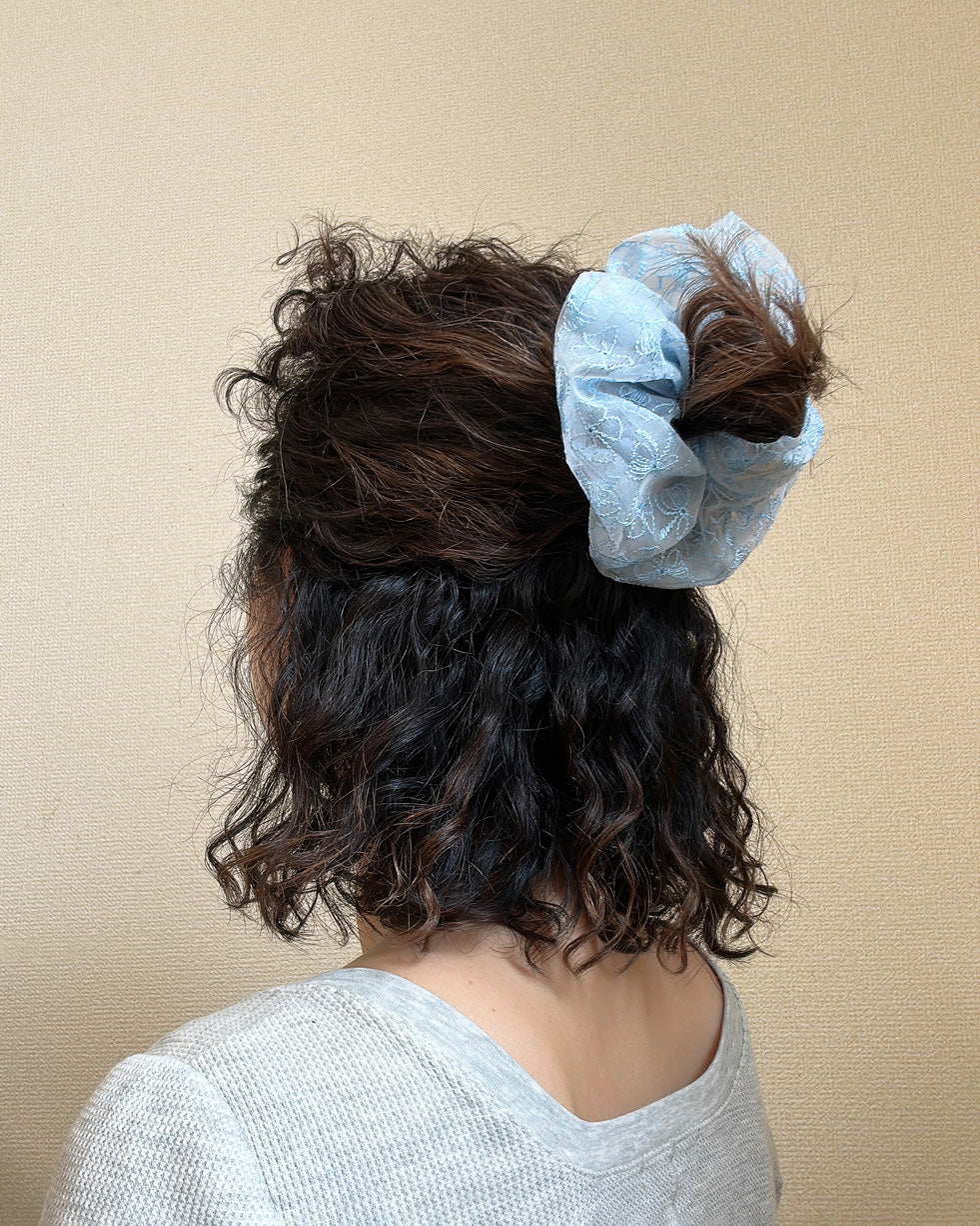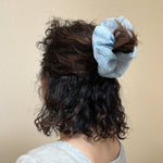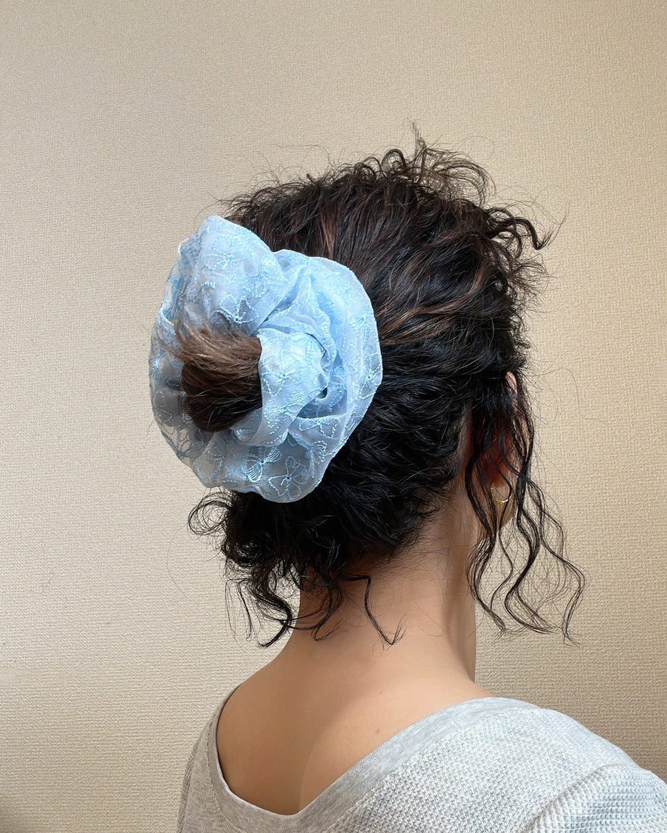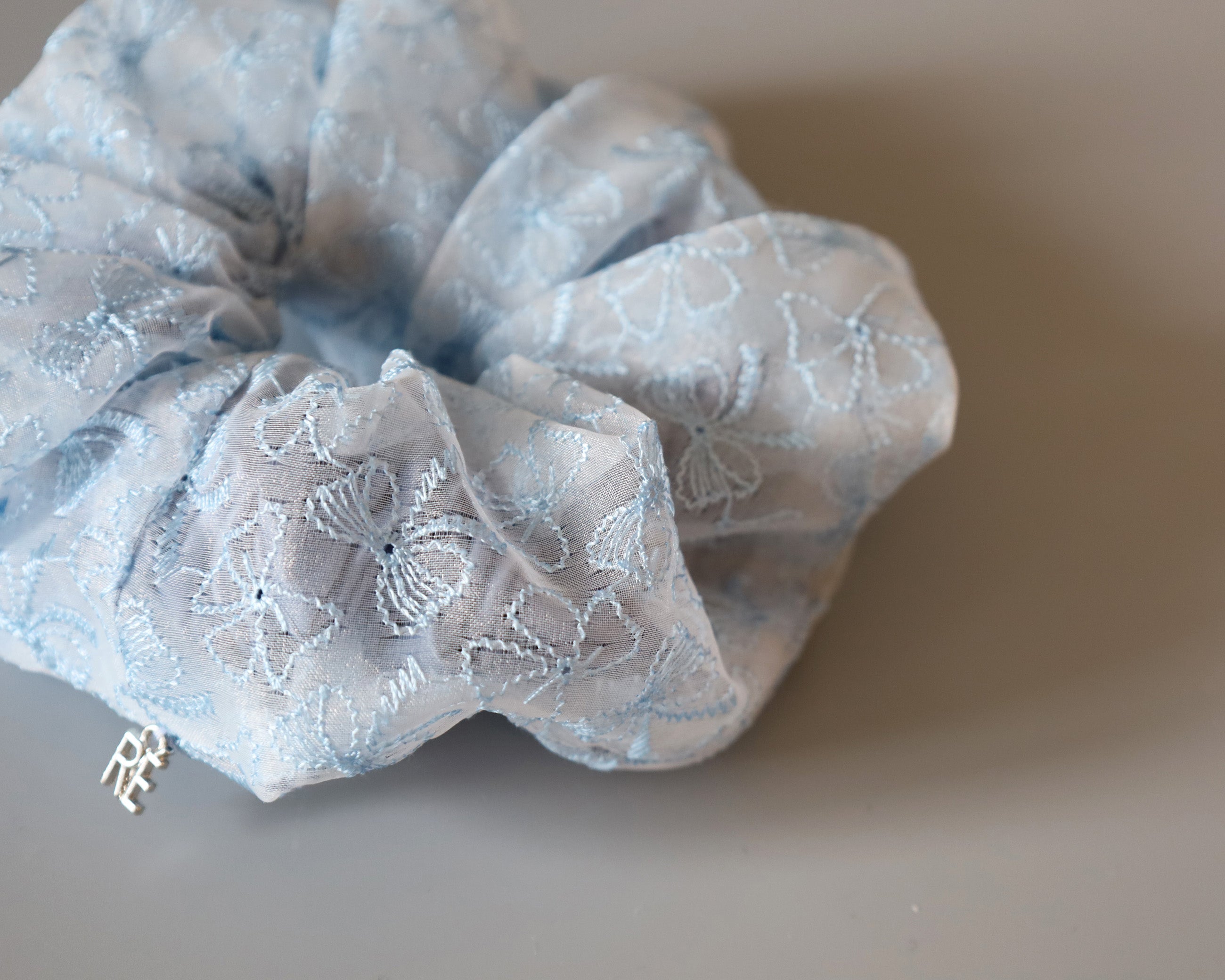 砂糖菓子のようなやわらかで淡いブルーのリボン柄シュシュ。