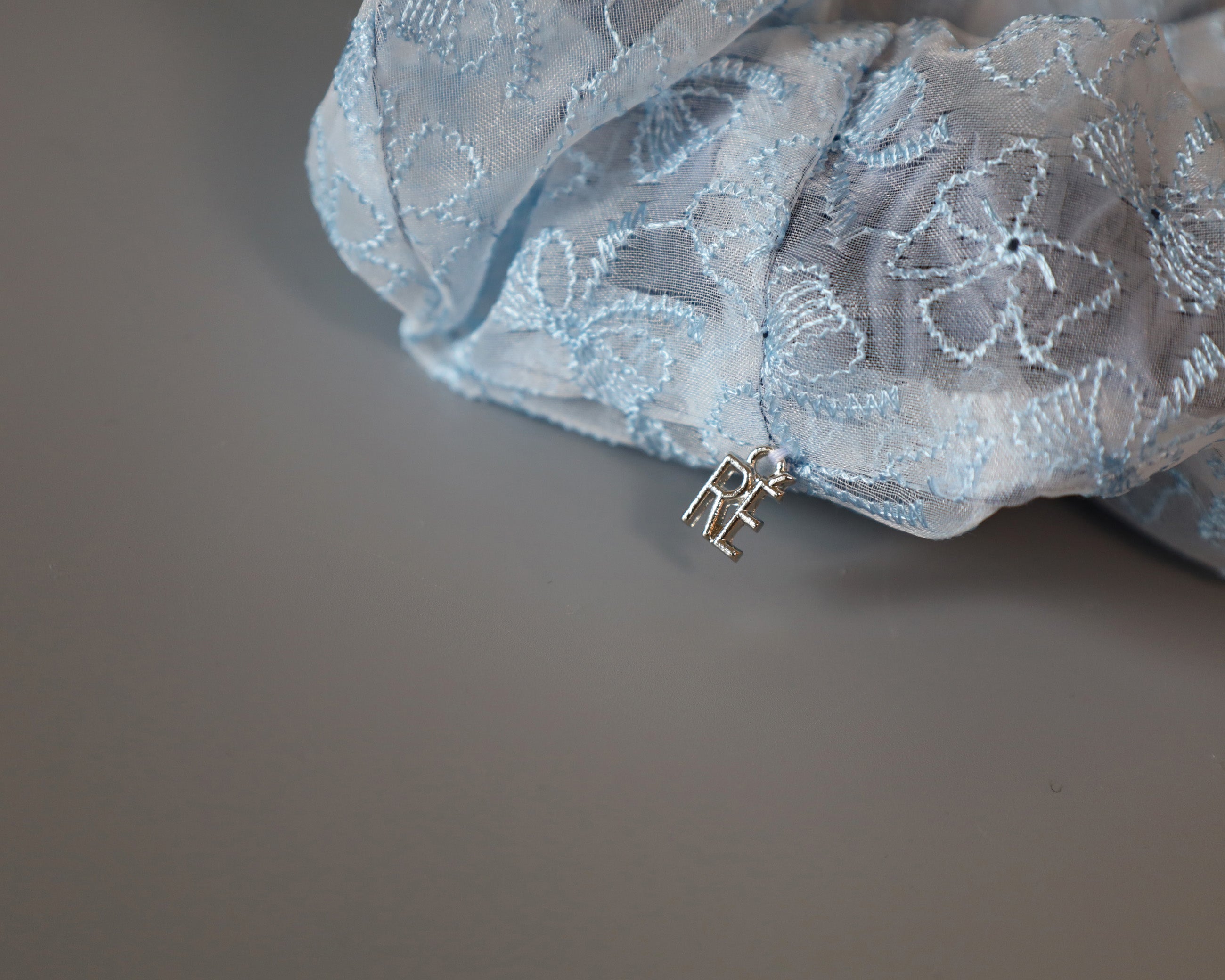 透け感のあるホワイトの生地に淡いブルーのステッチで描いたリボンモチーフが甘めな気分にぴったりです。