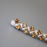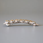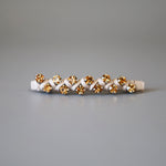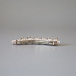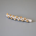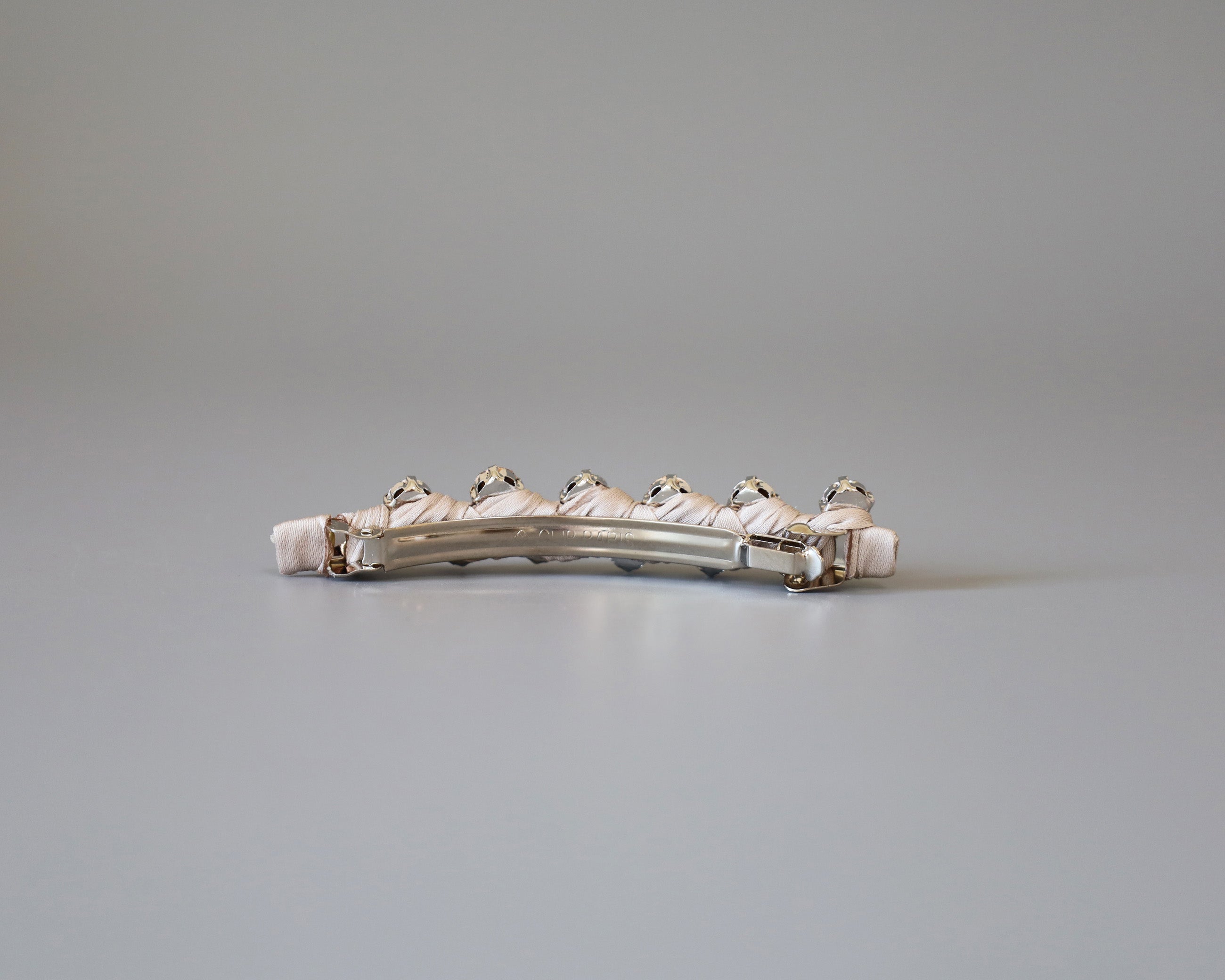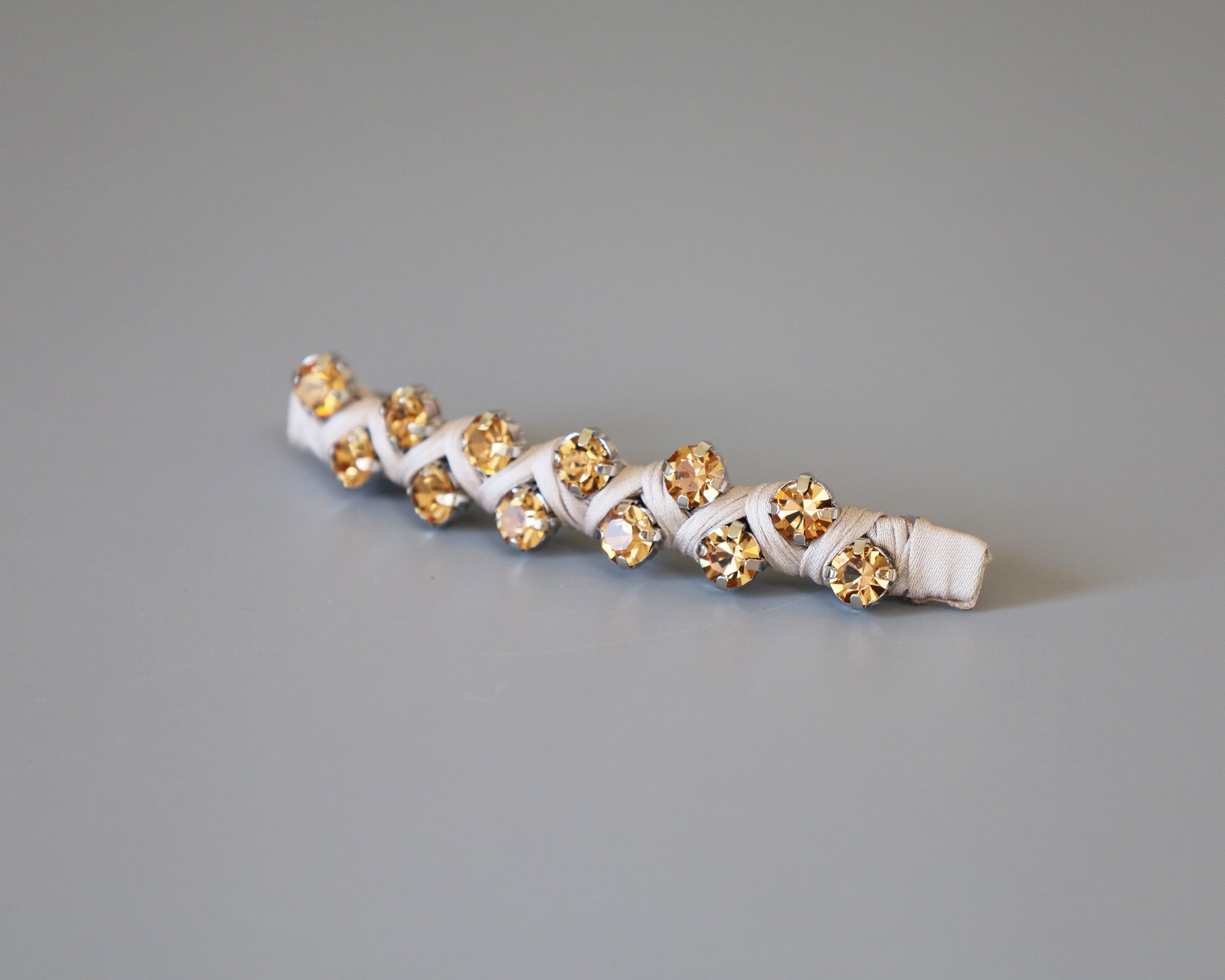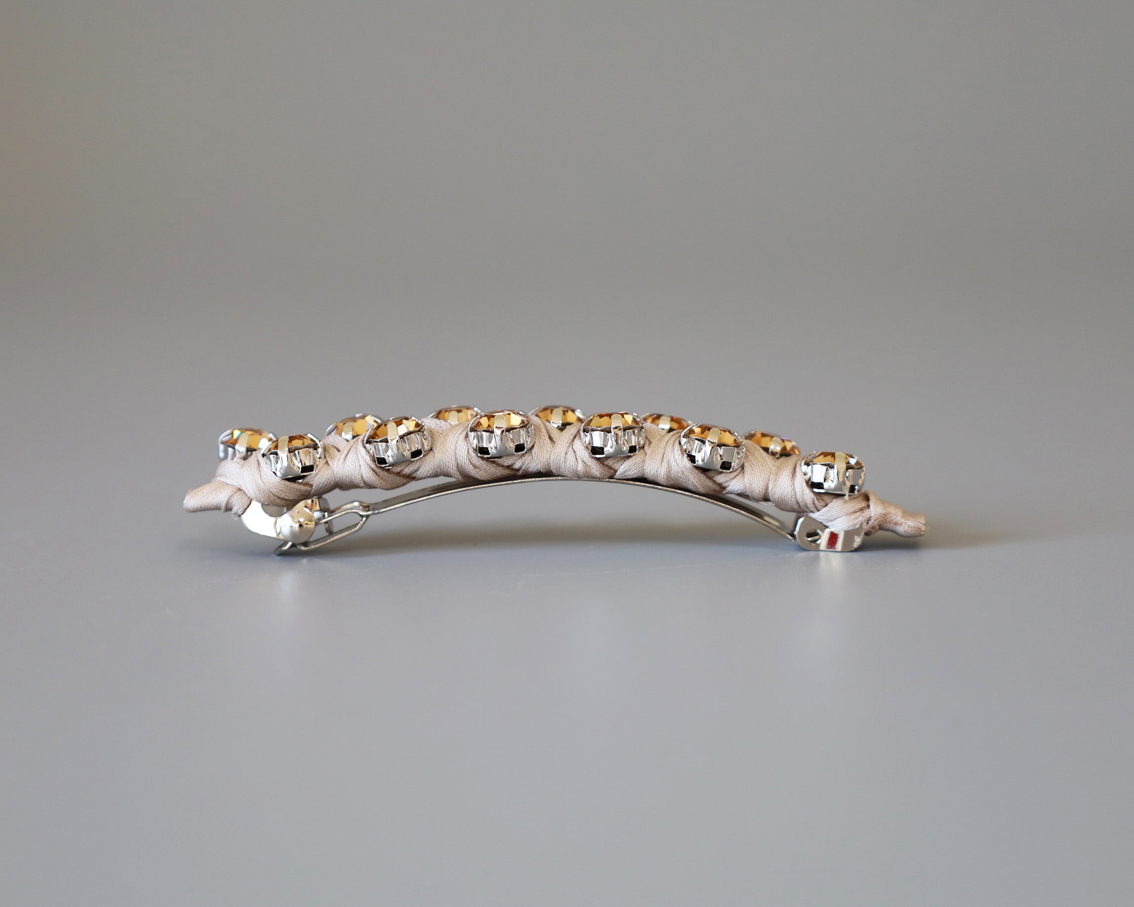 ゴールドにきらめくビジューを編み込んだようなヘアバレッタ。