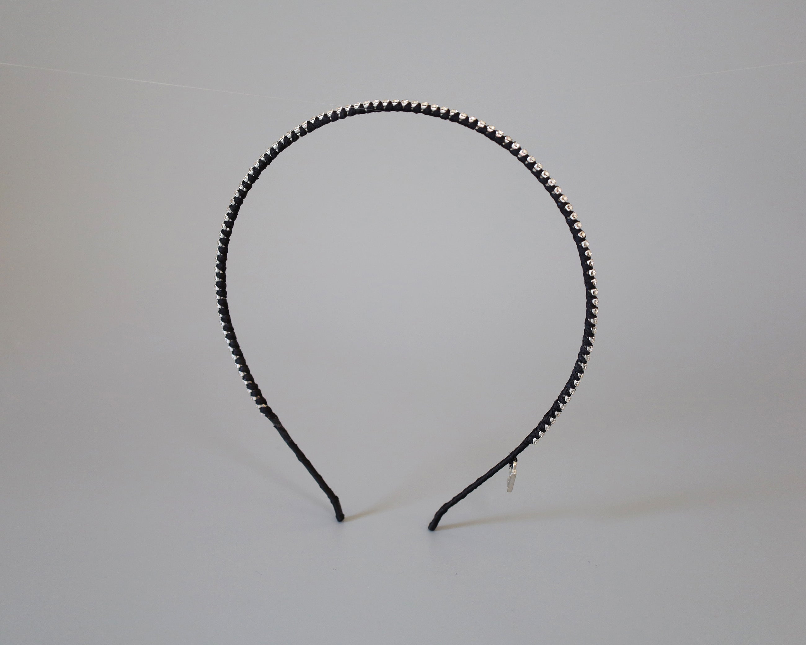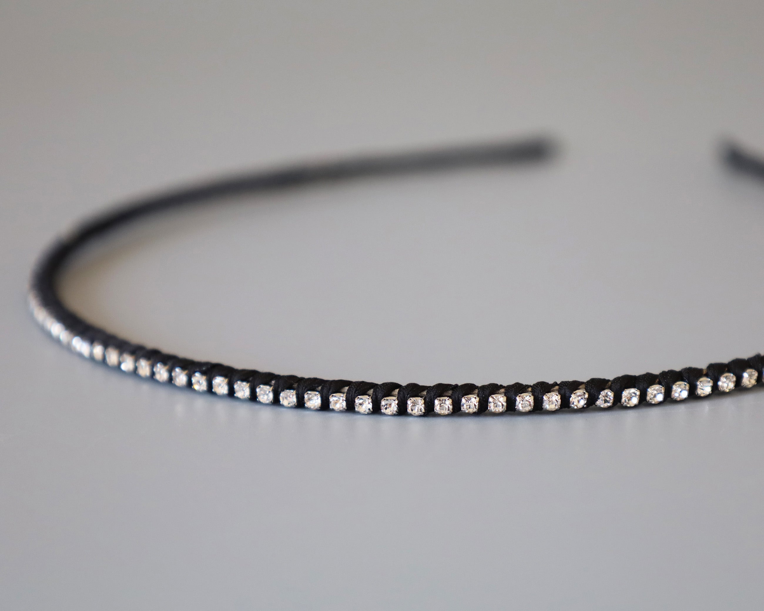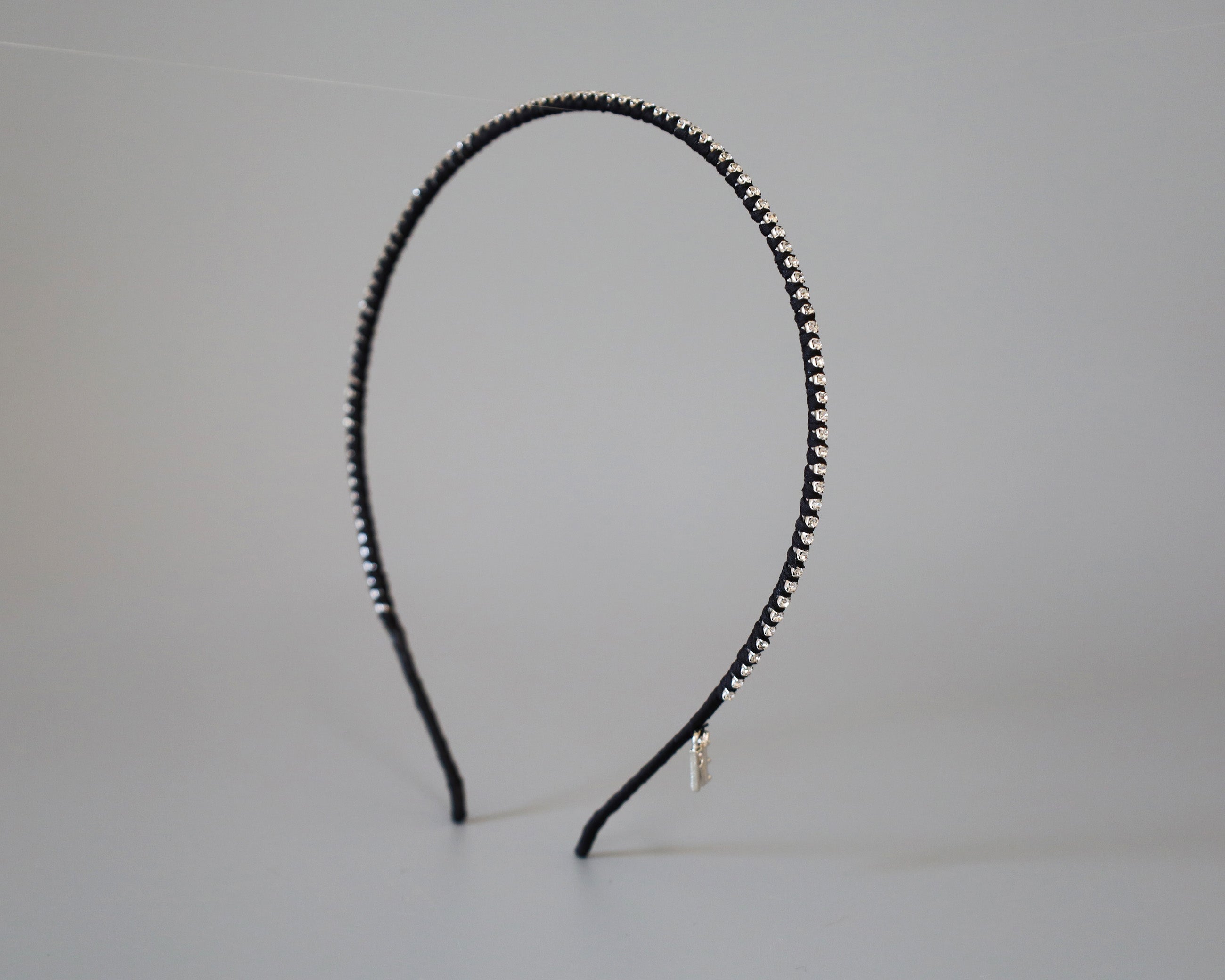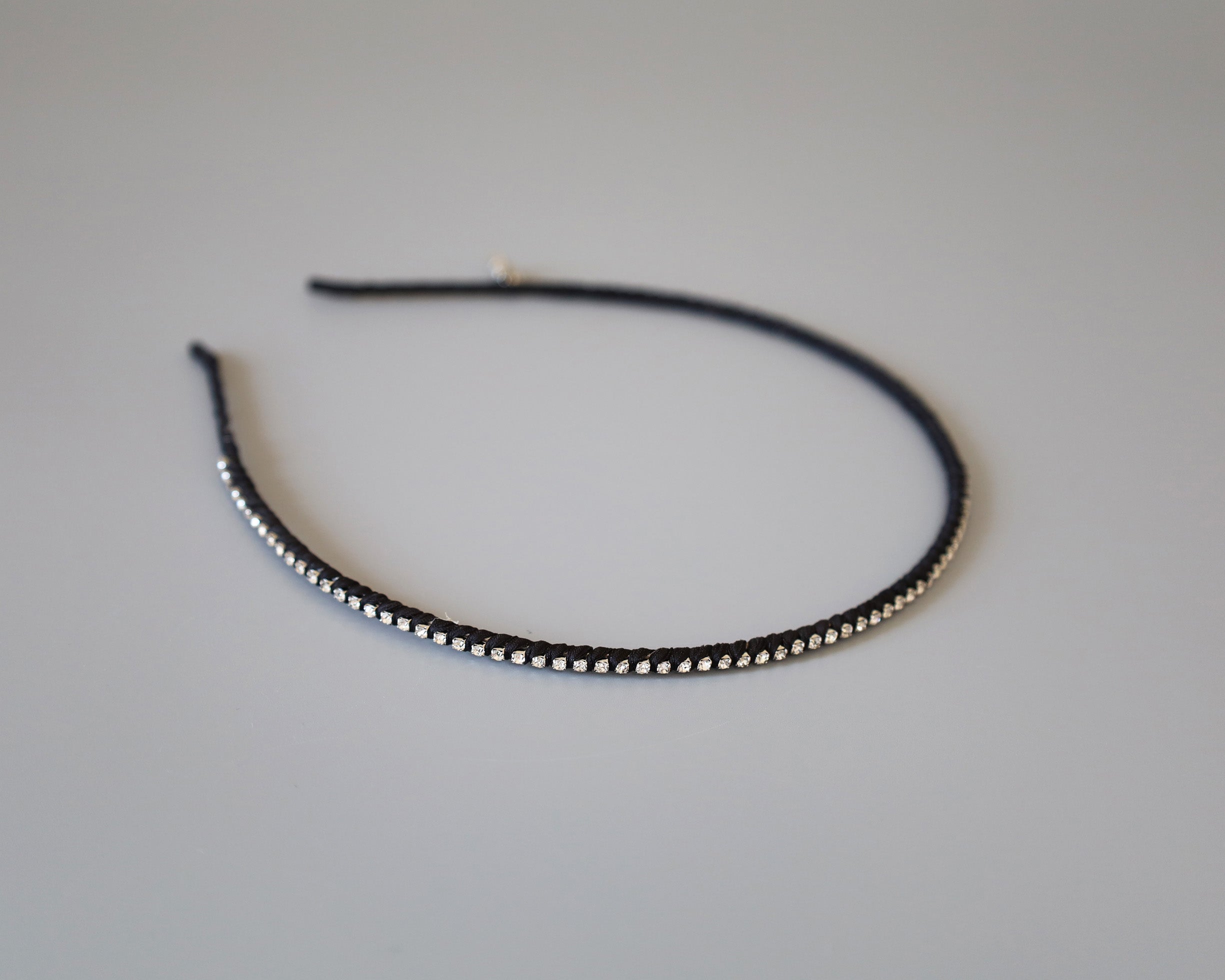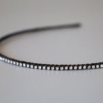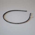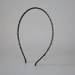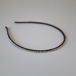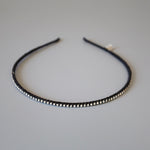 極細のブラックのボディにクリアビジューを直線的に並べたカチューシャ。