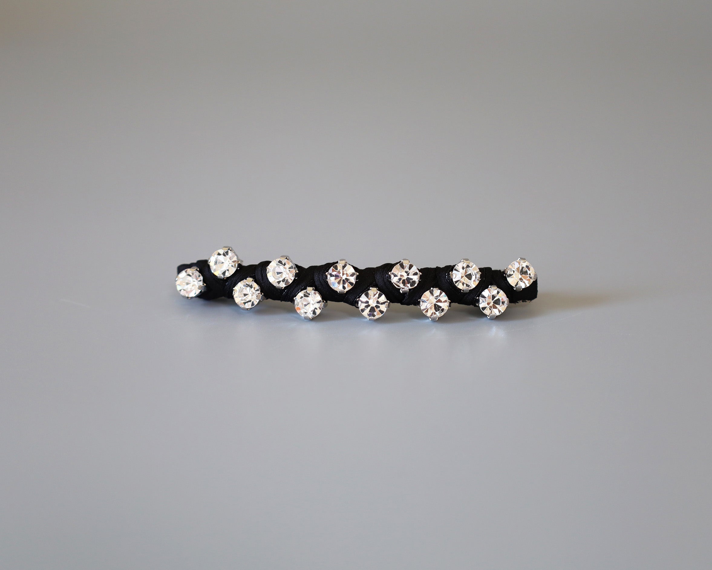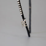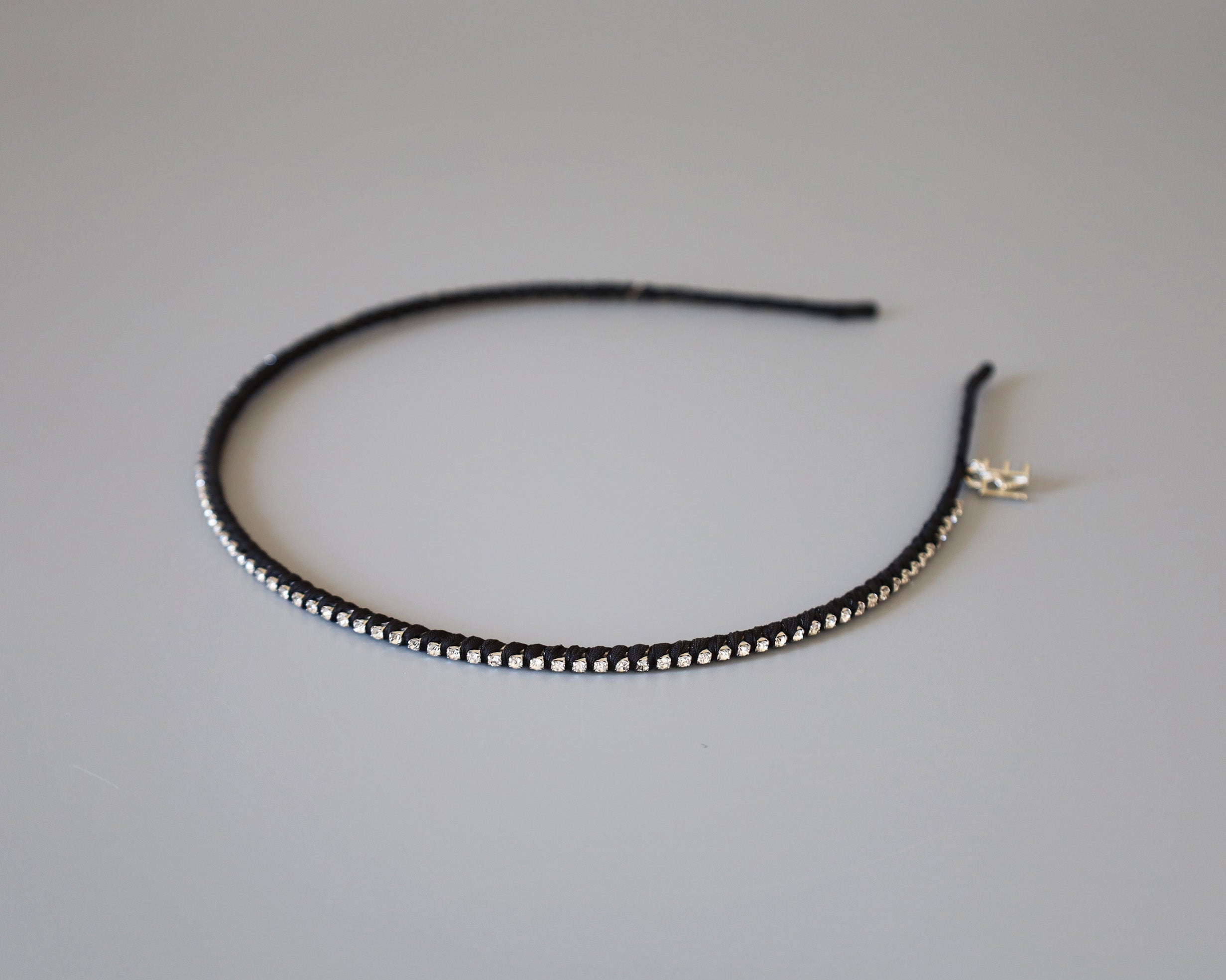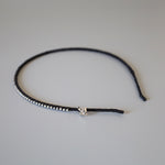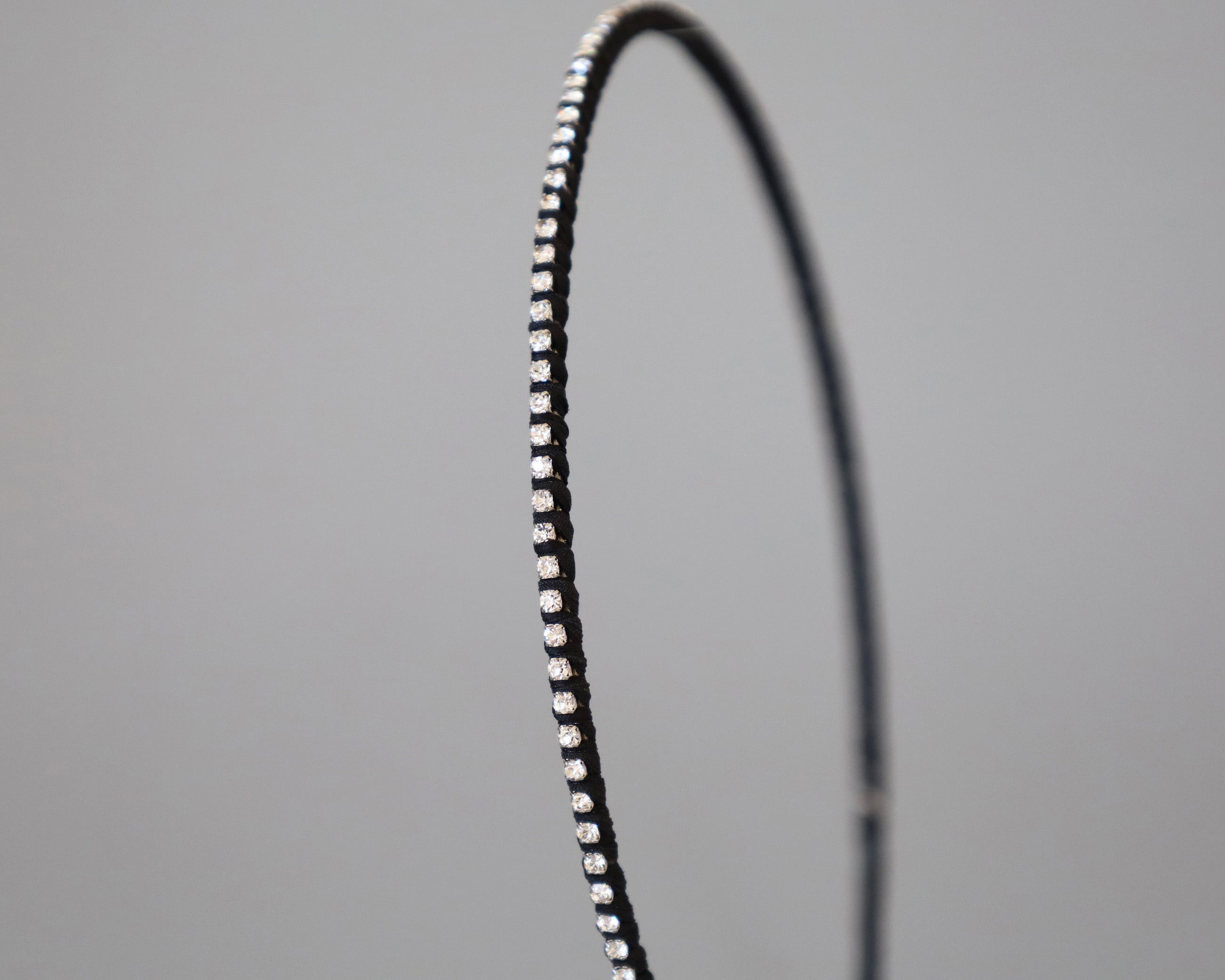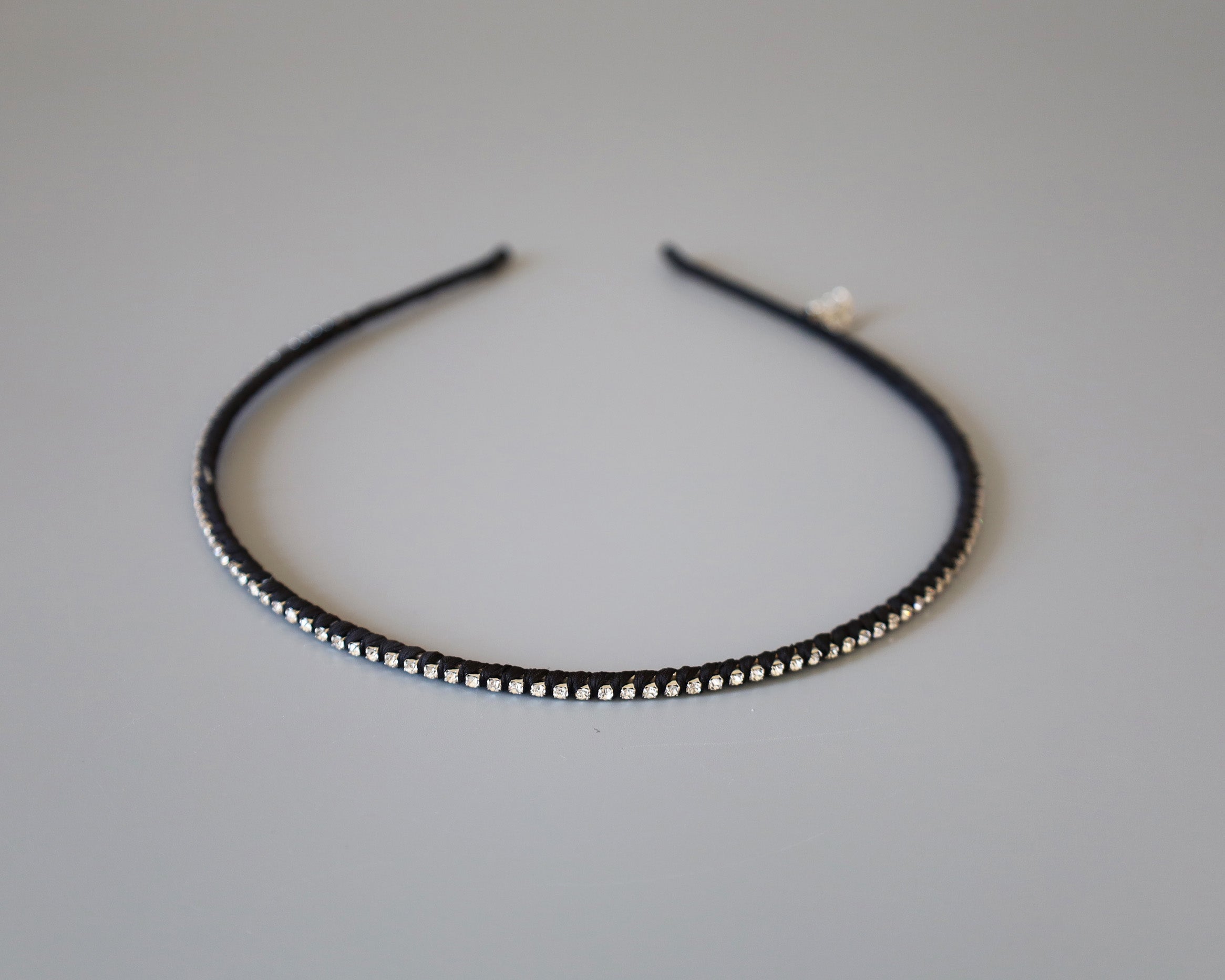 極細のブラックのボディにクリアビジューを直線的に並べたカチューシャ。
