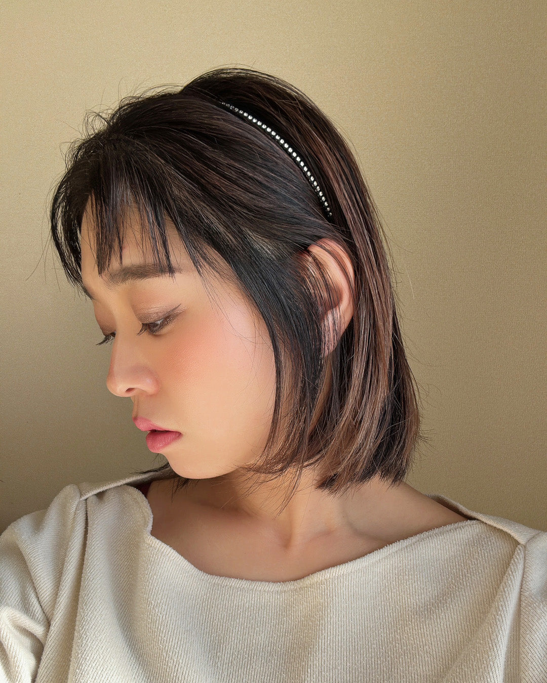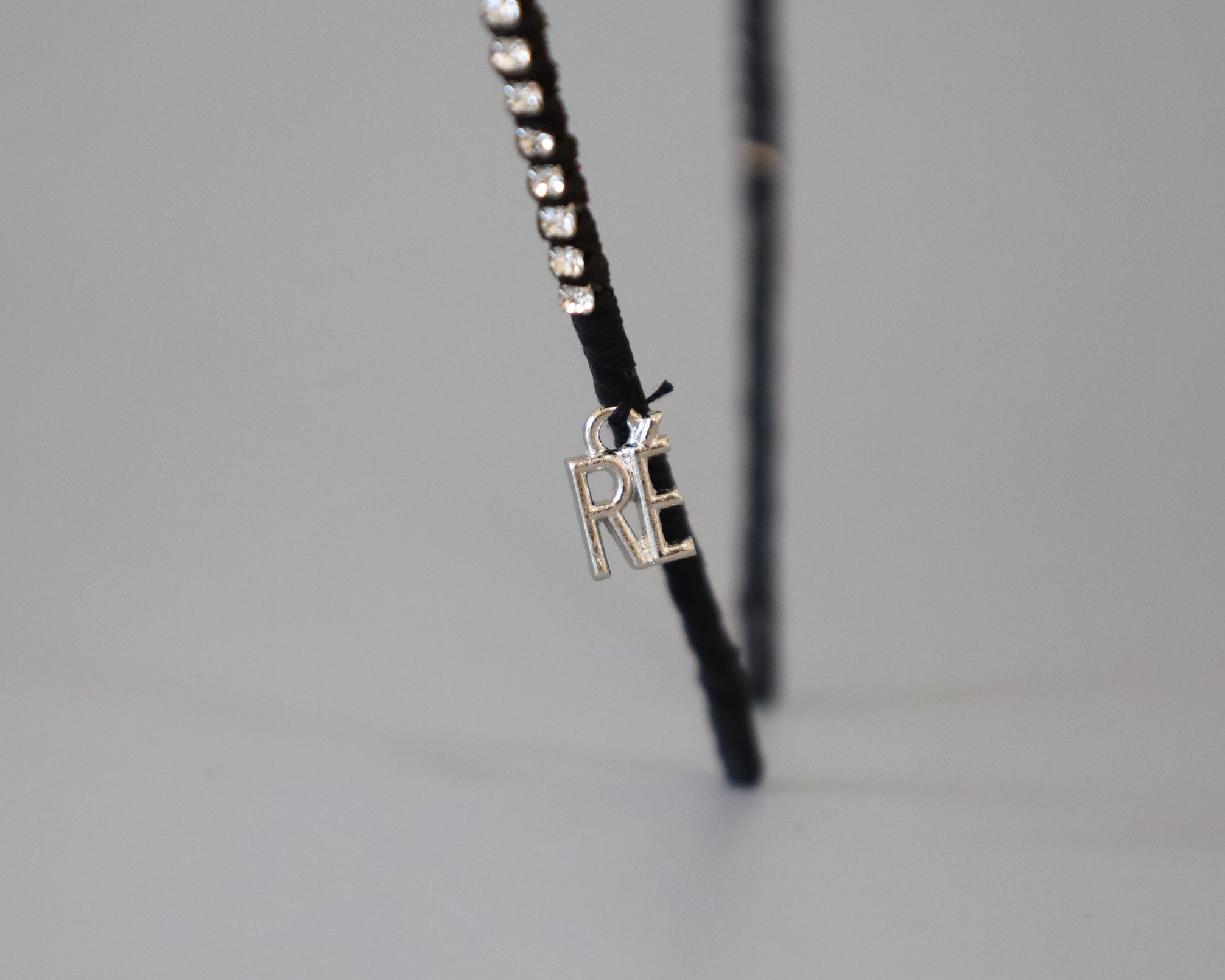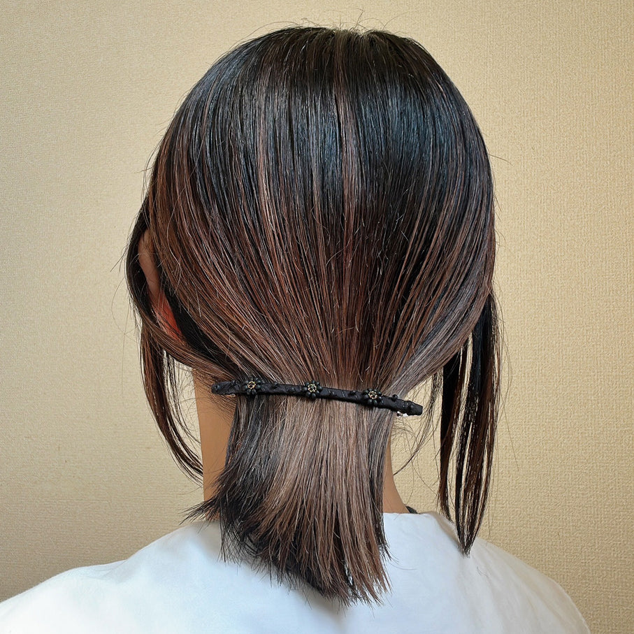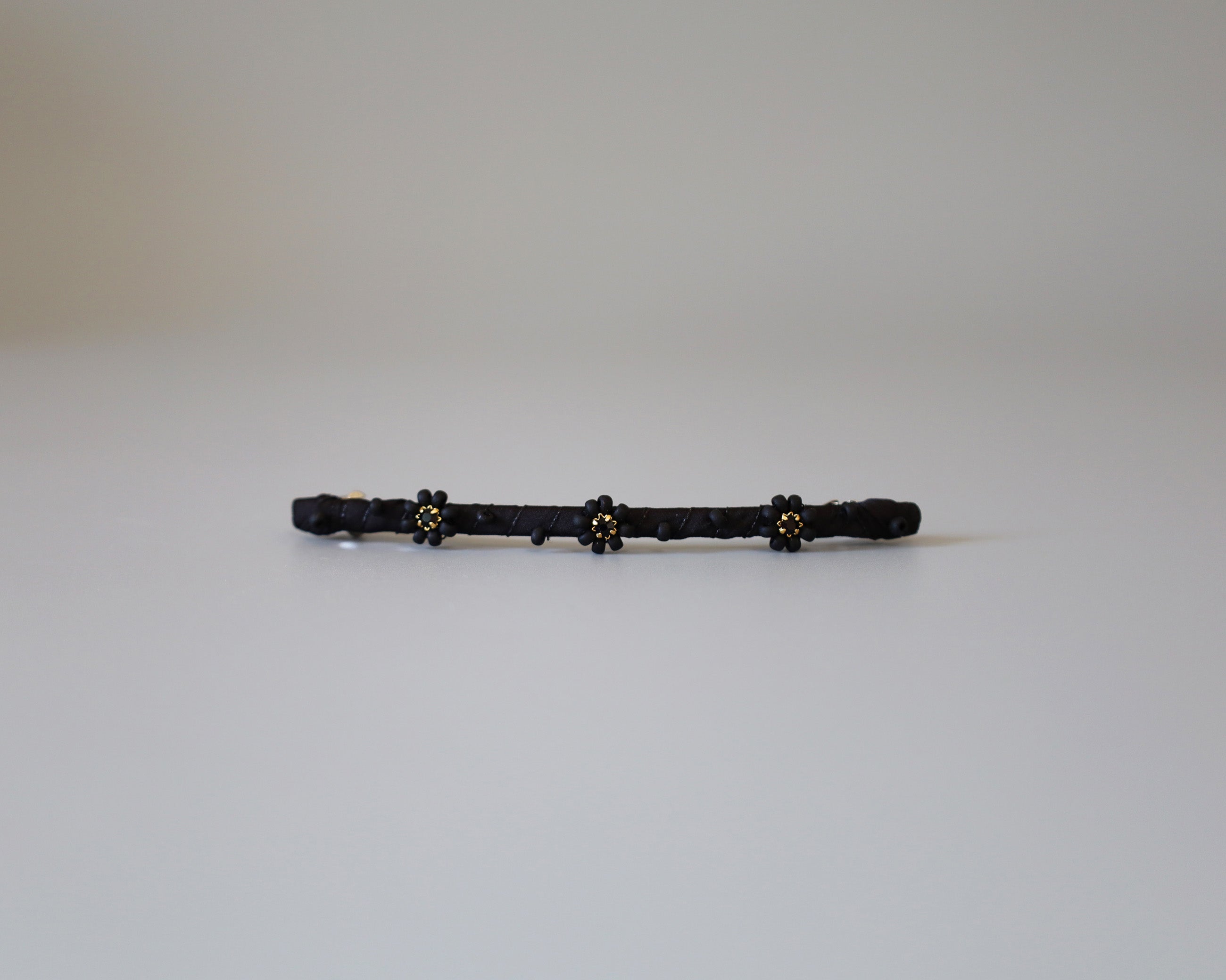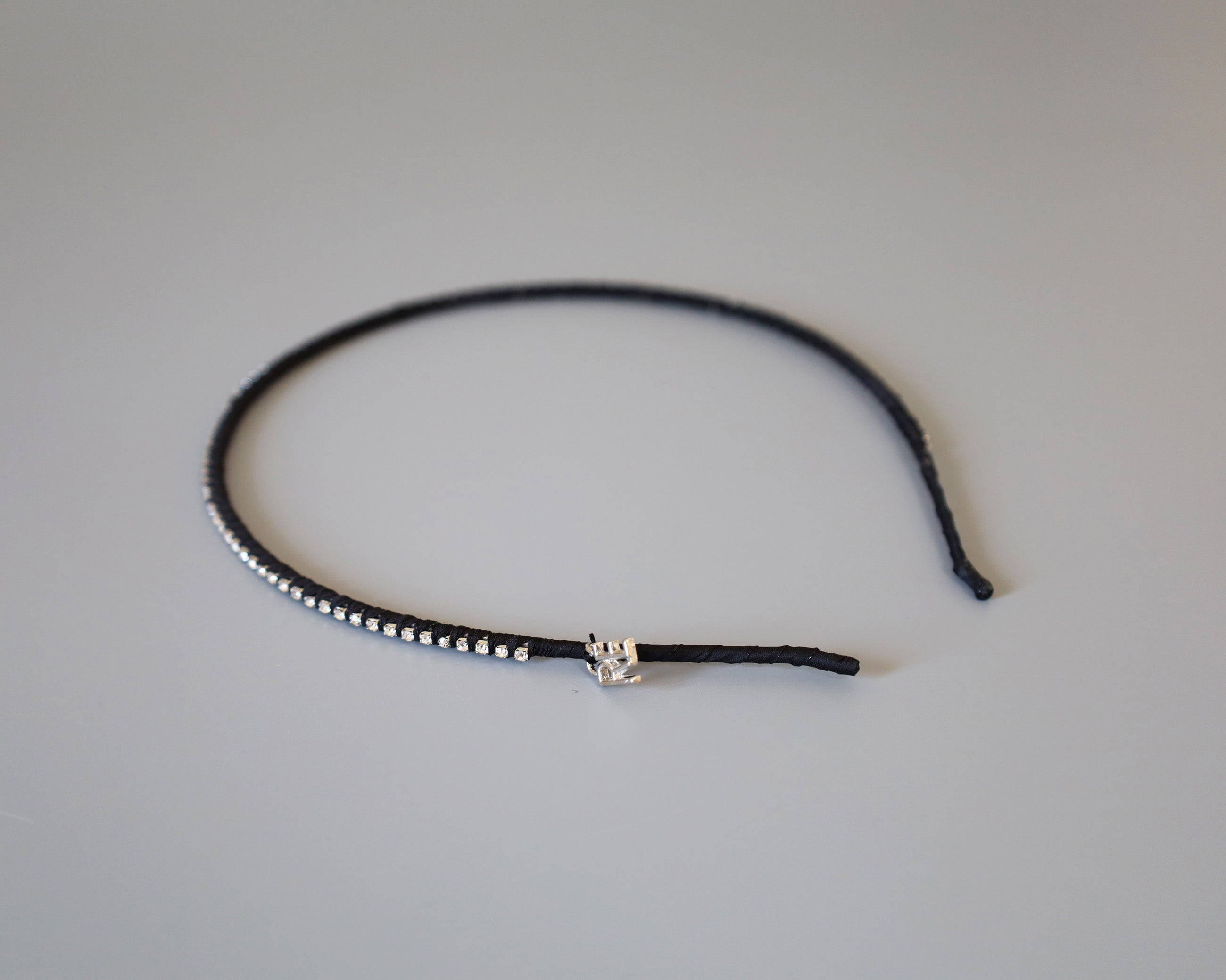 極細のブラックのボディにクリアビジューを直線的に並べたカチューシャ。
