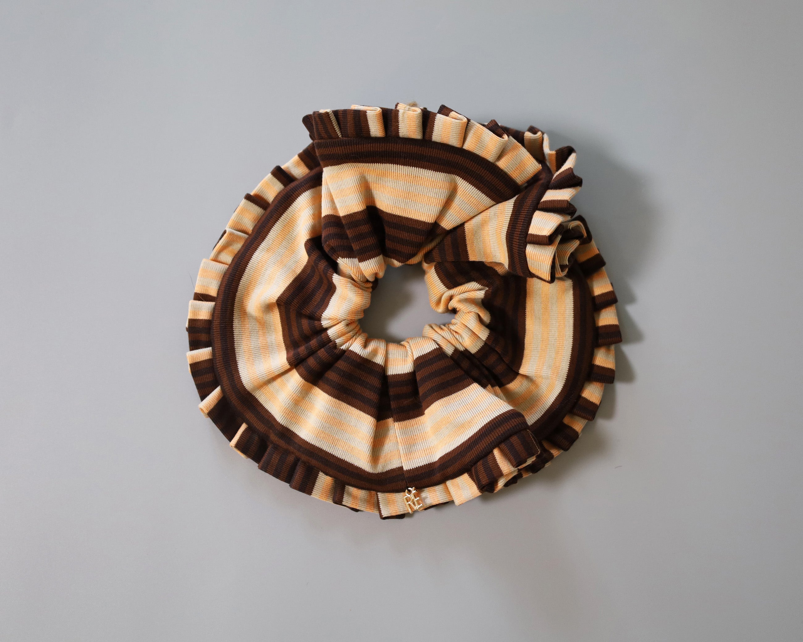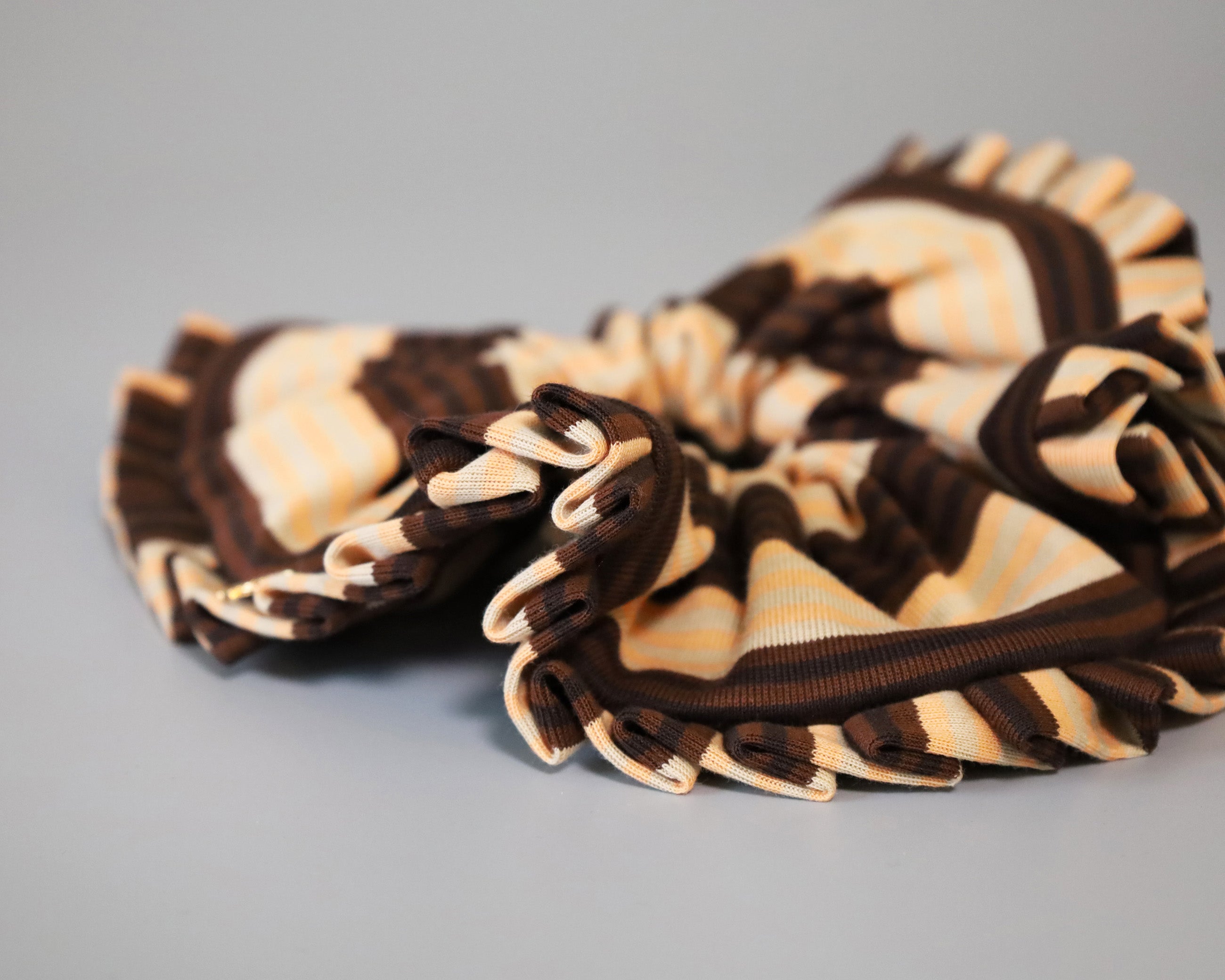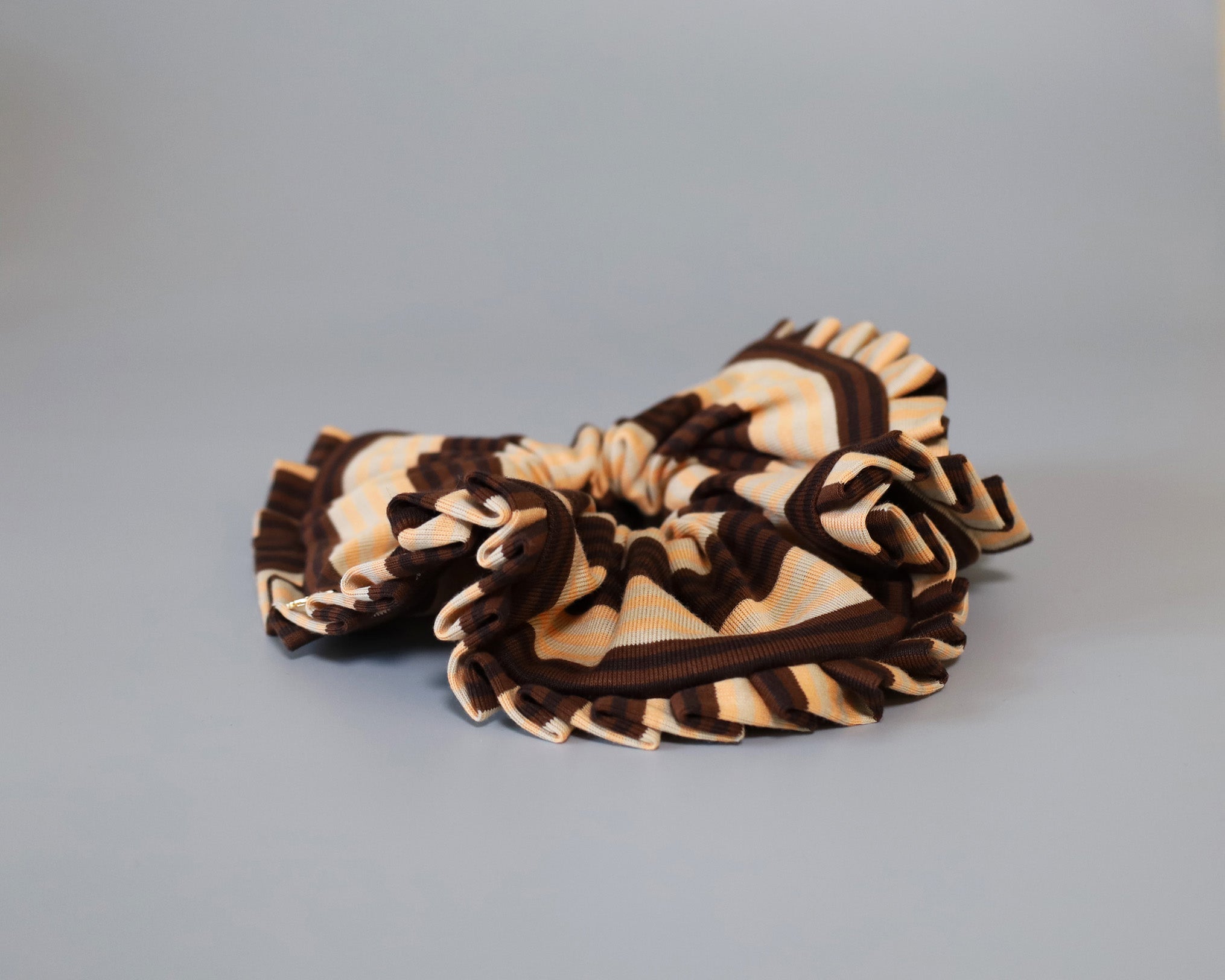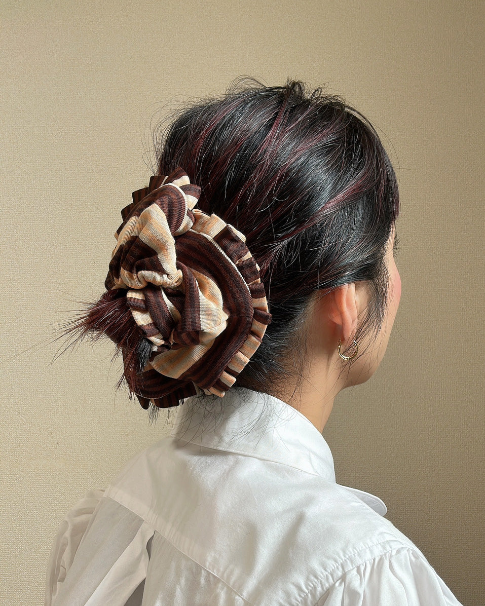 ブラウンとベージュをベースにしたボーダー柄のコンビネーションシュシュ。