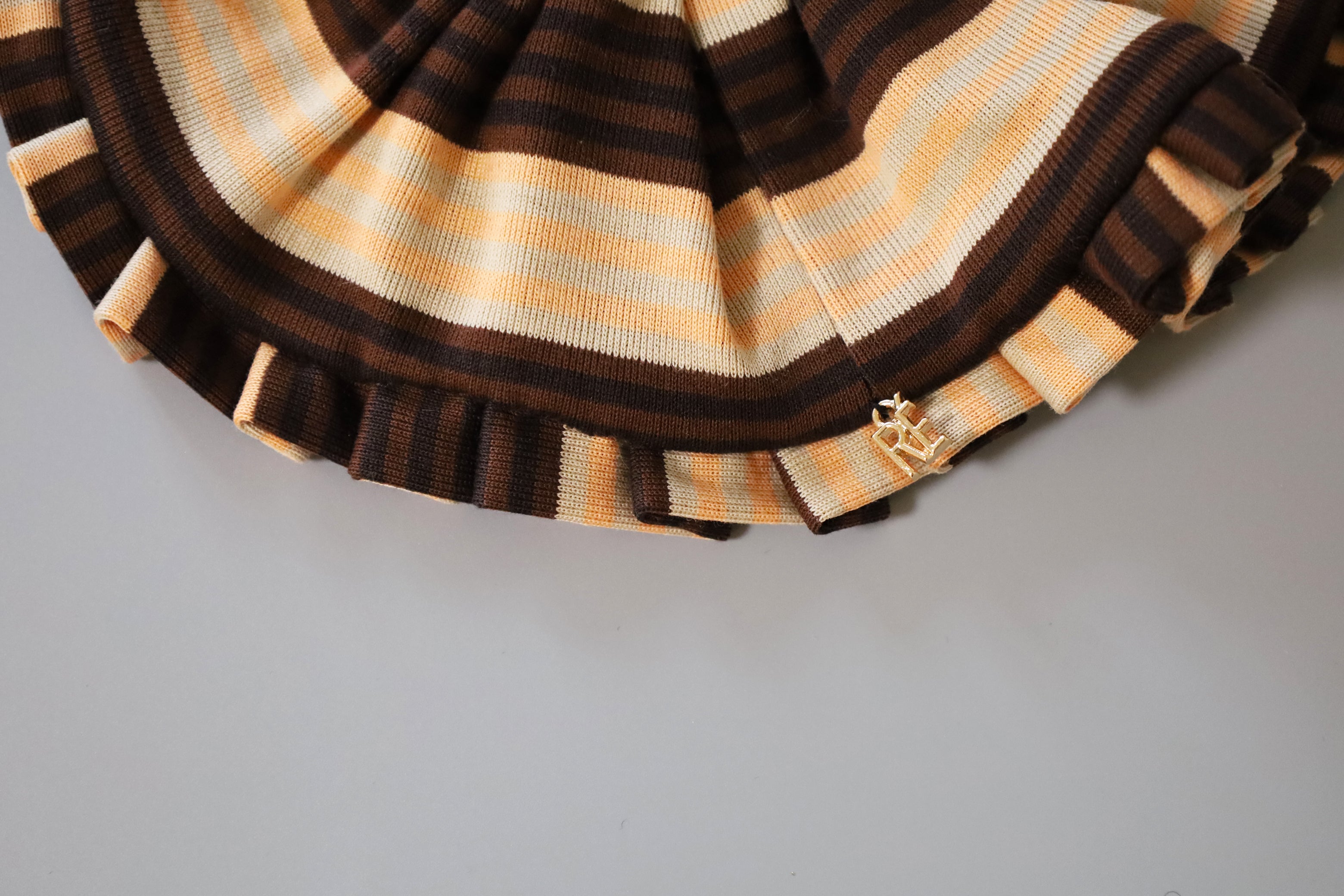 ブラウン×ベージュをベースにしつつ、ブラックやオレンジがアクセントに効いたひと癖あるストライプ。