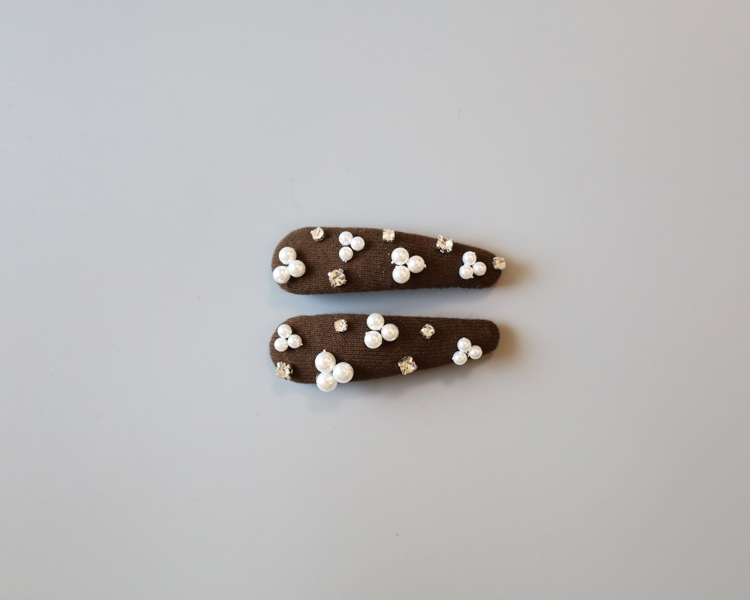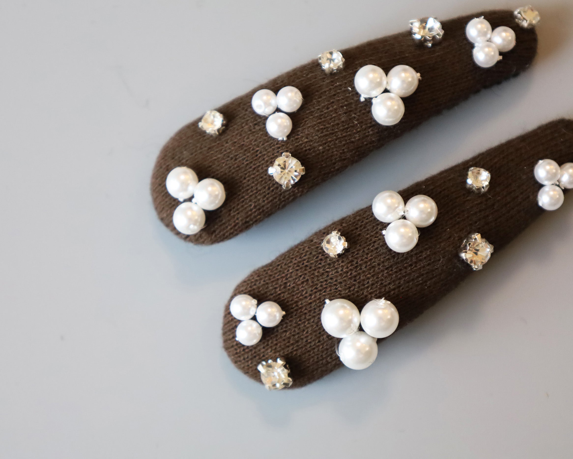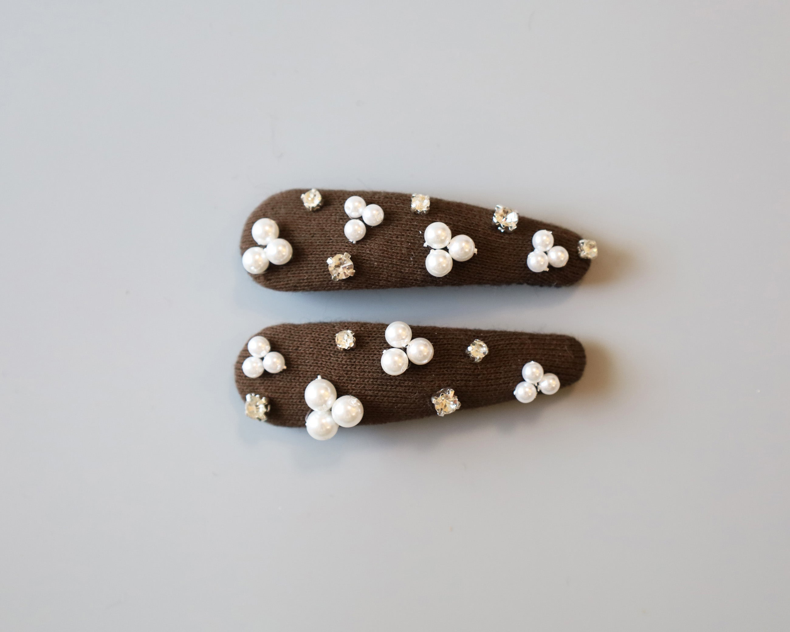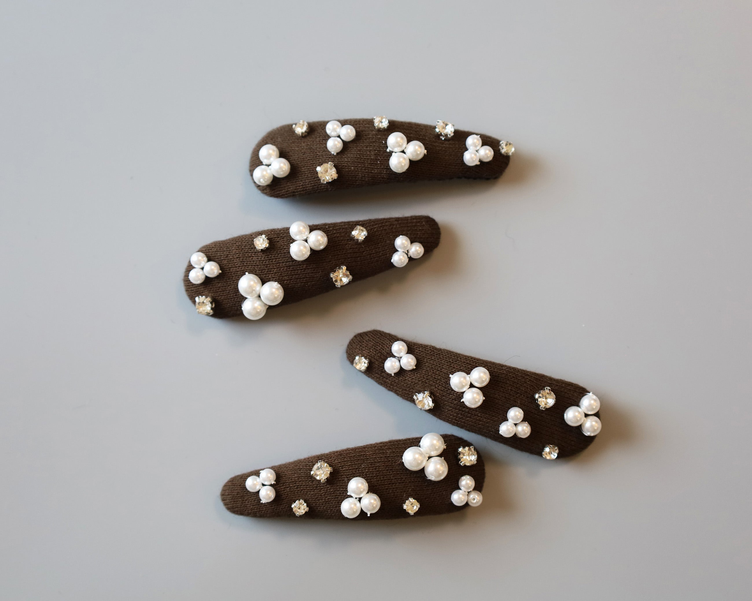 パールやクリアビジューのきらめきがよく映える深めのブラウンカラー。