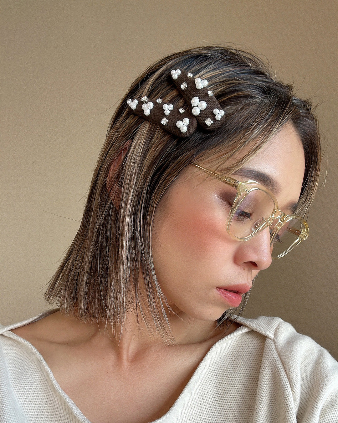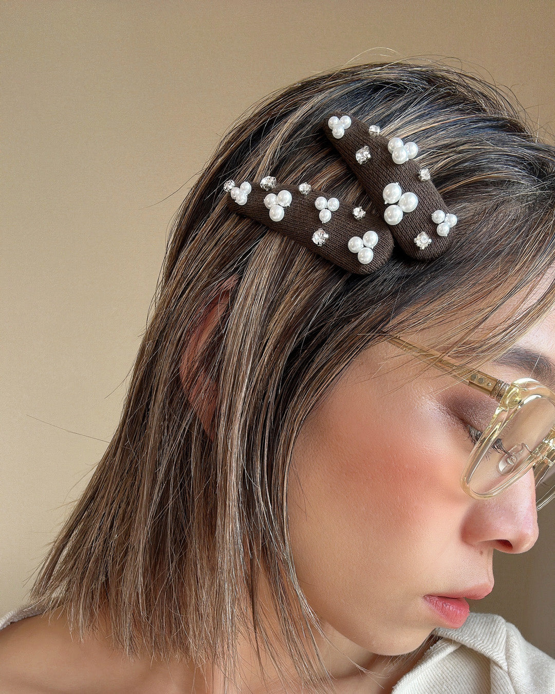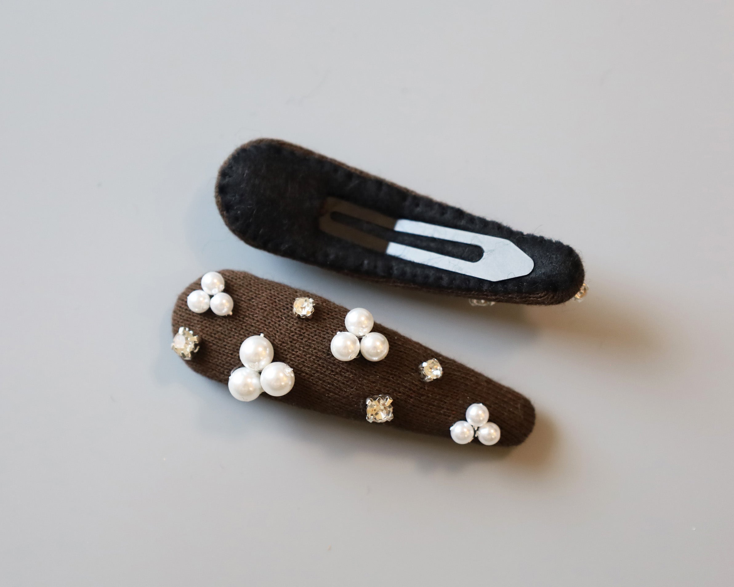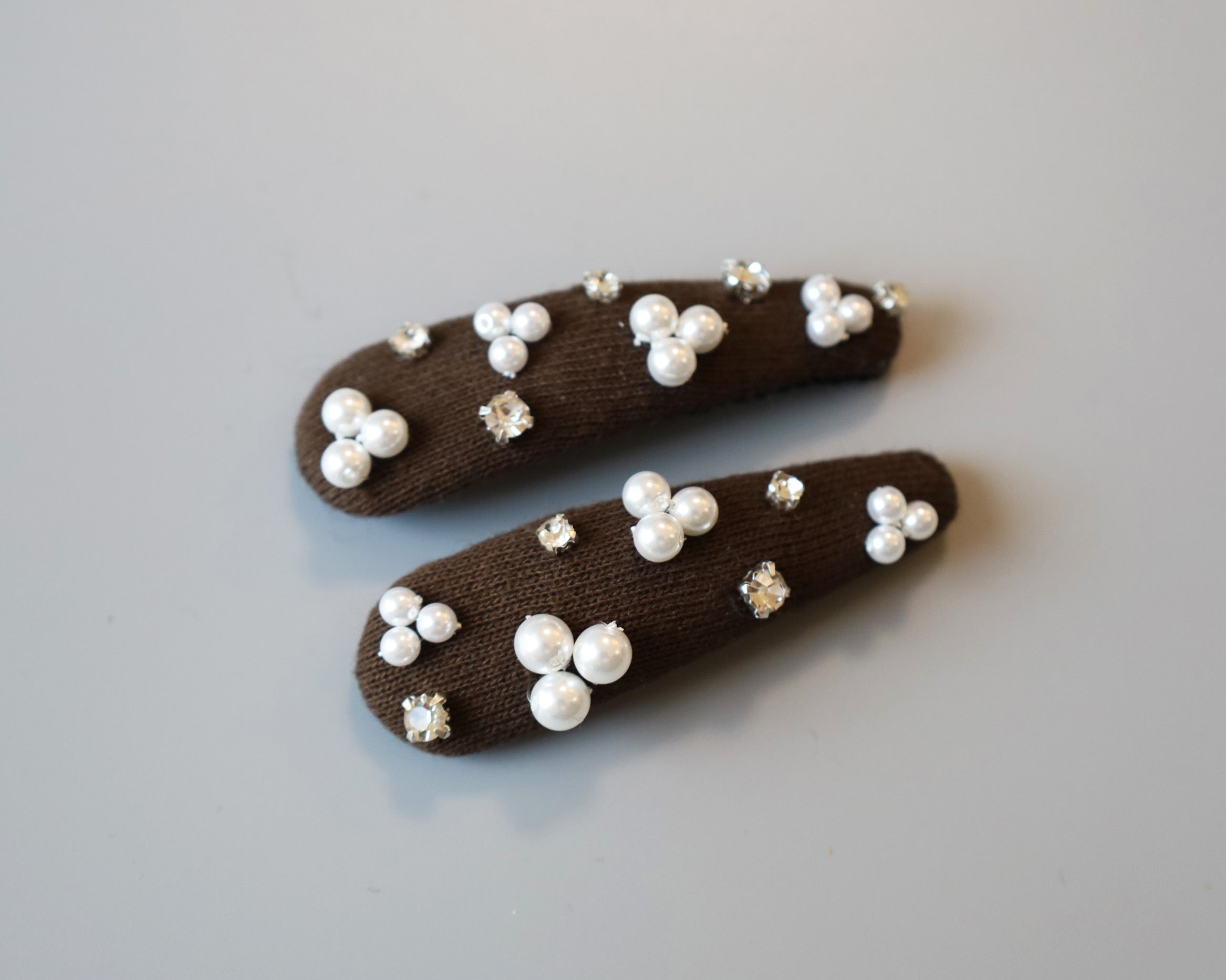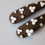 パールやクリアビジューのきらめきがよく映える深めのブラウンカラー。