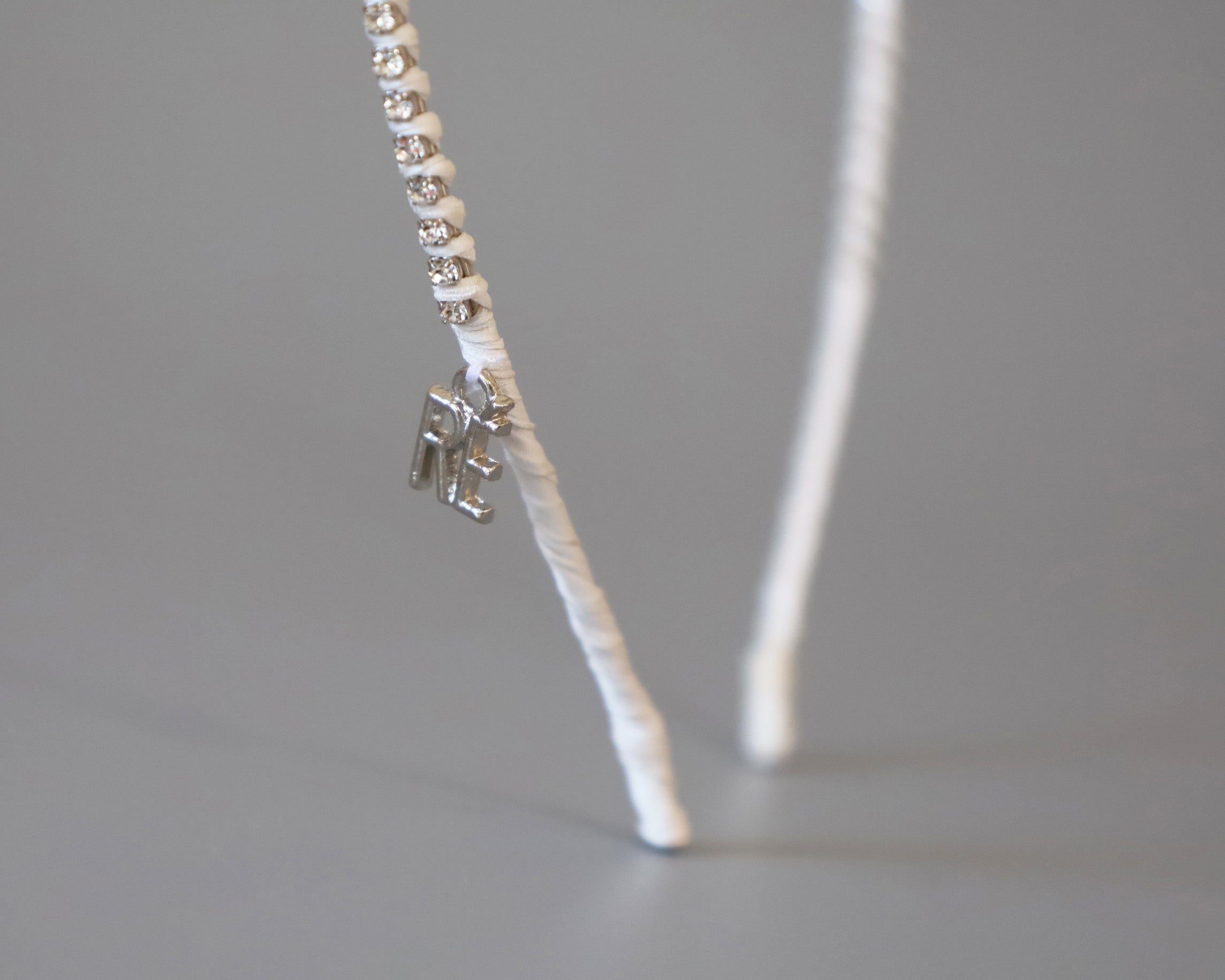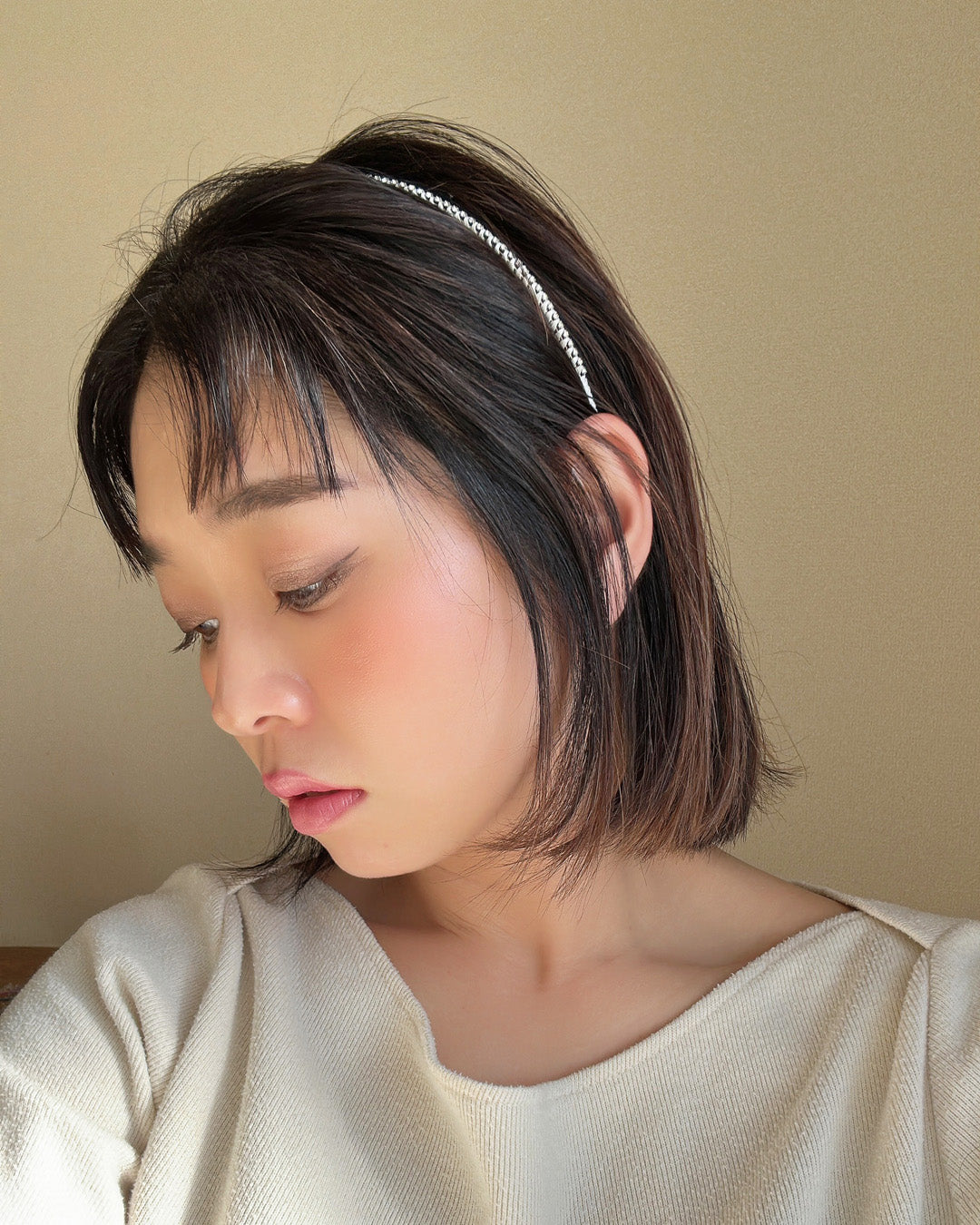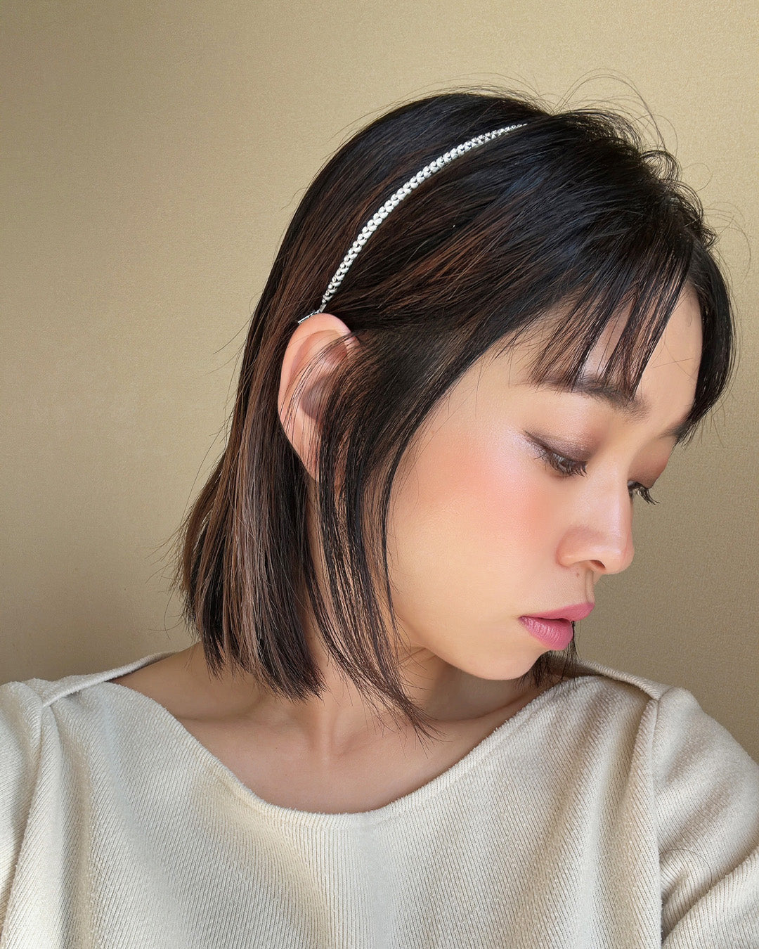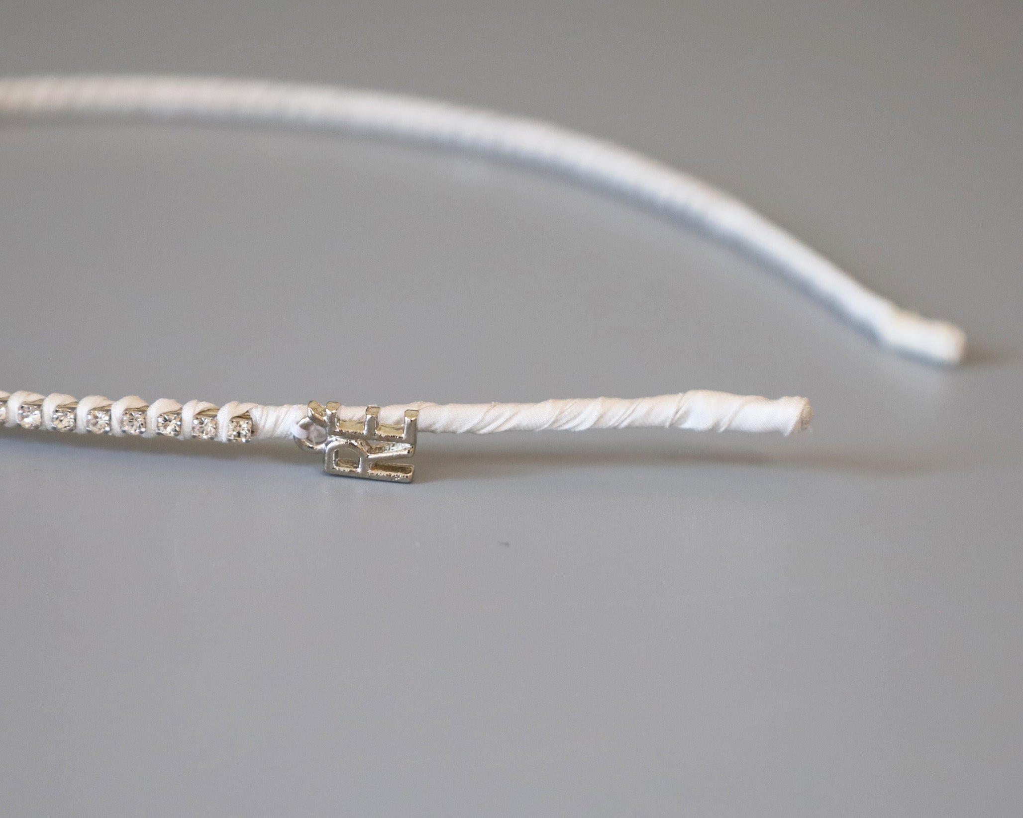 白を基調としたタイトなビジューカチューシャ。
