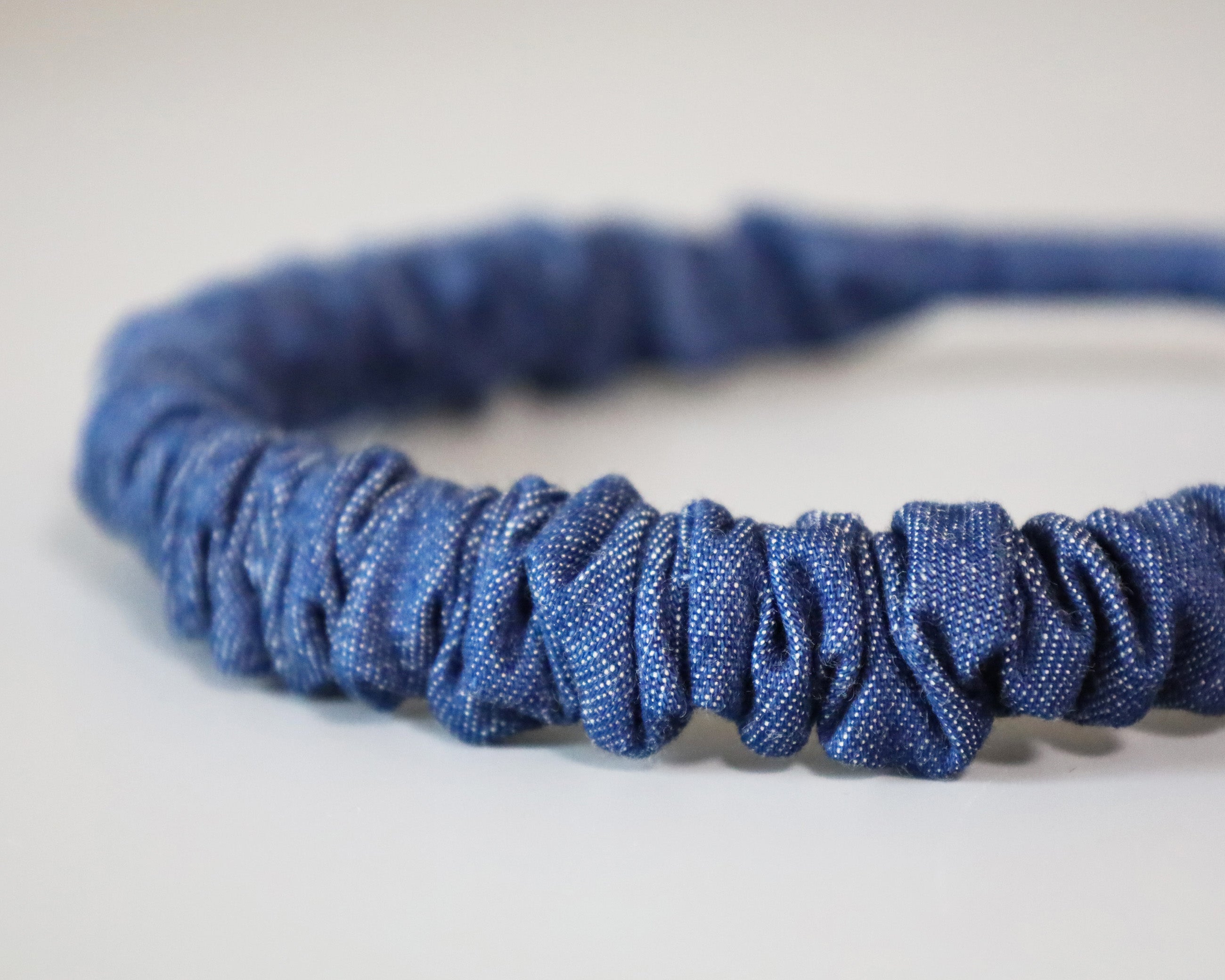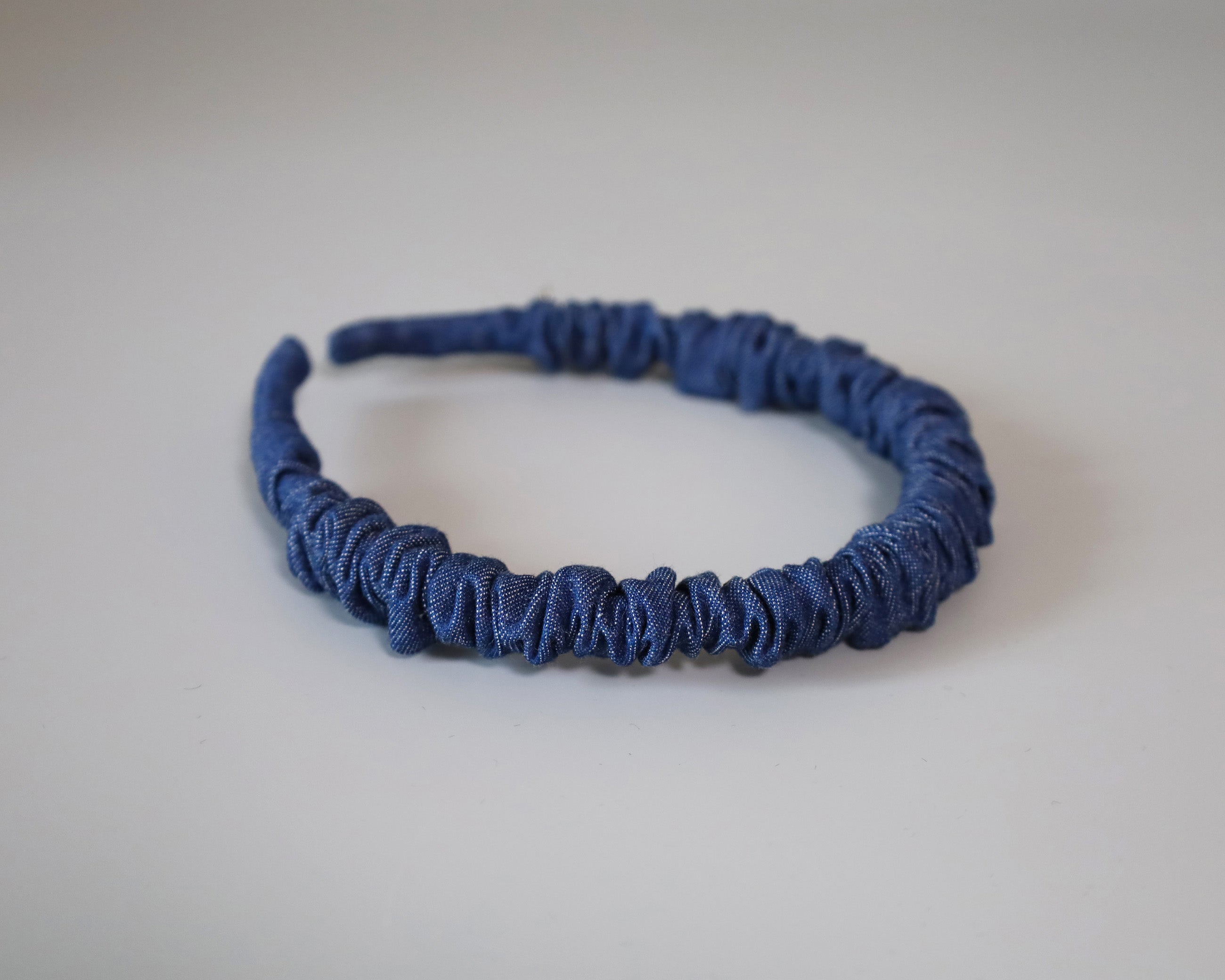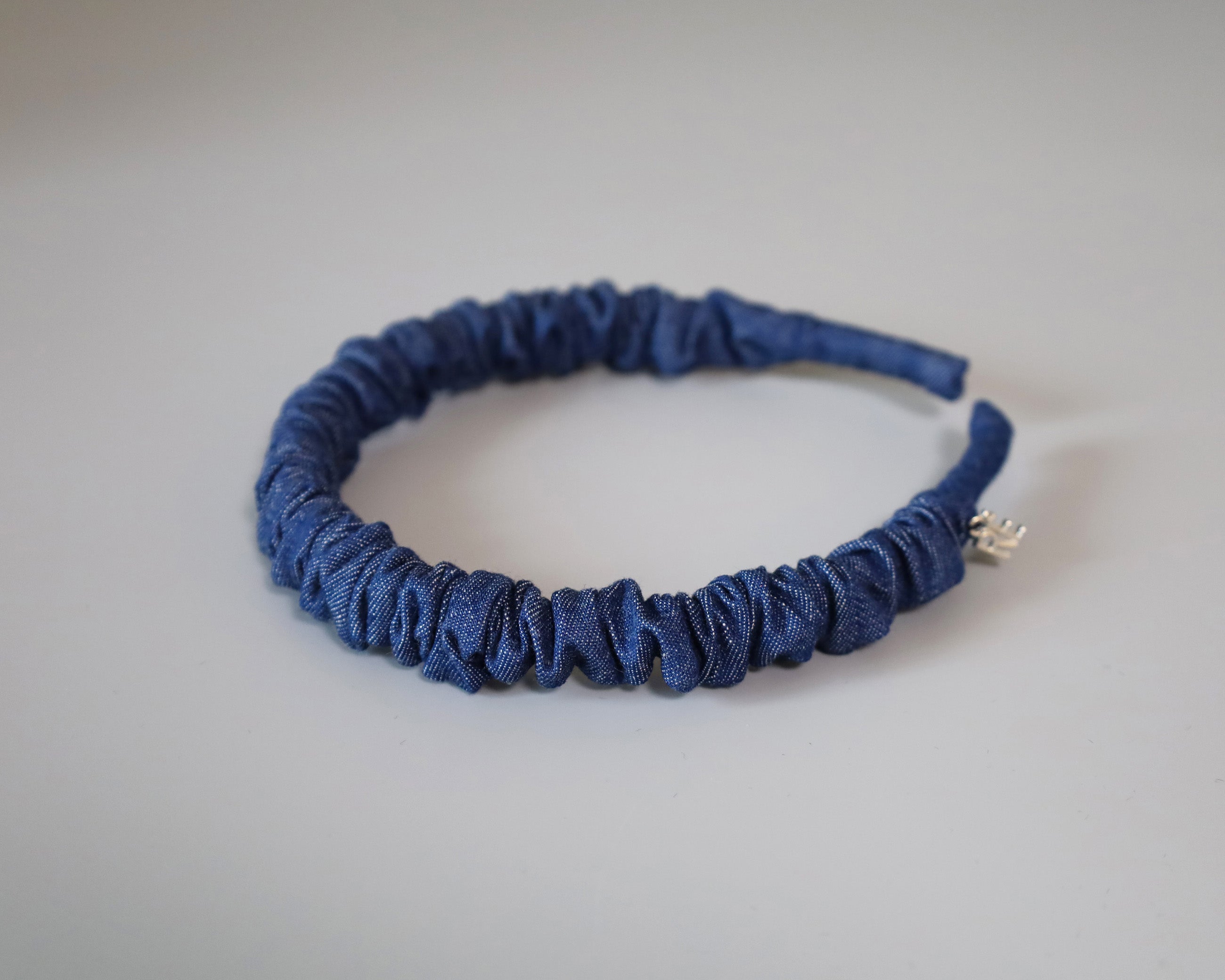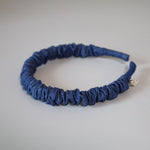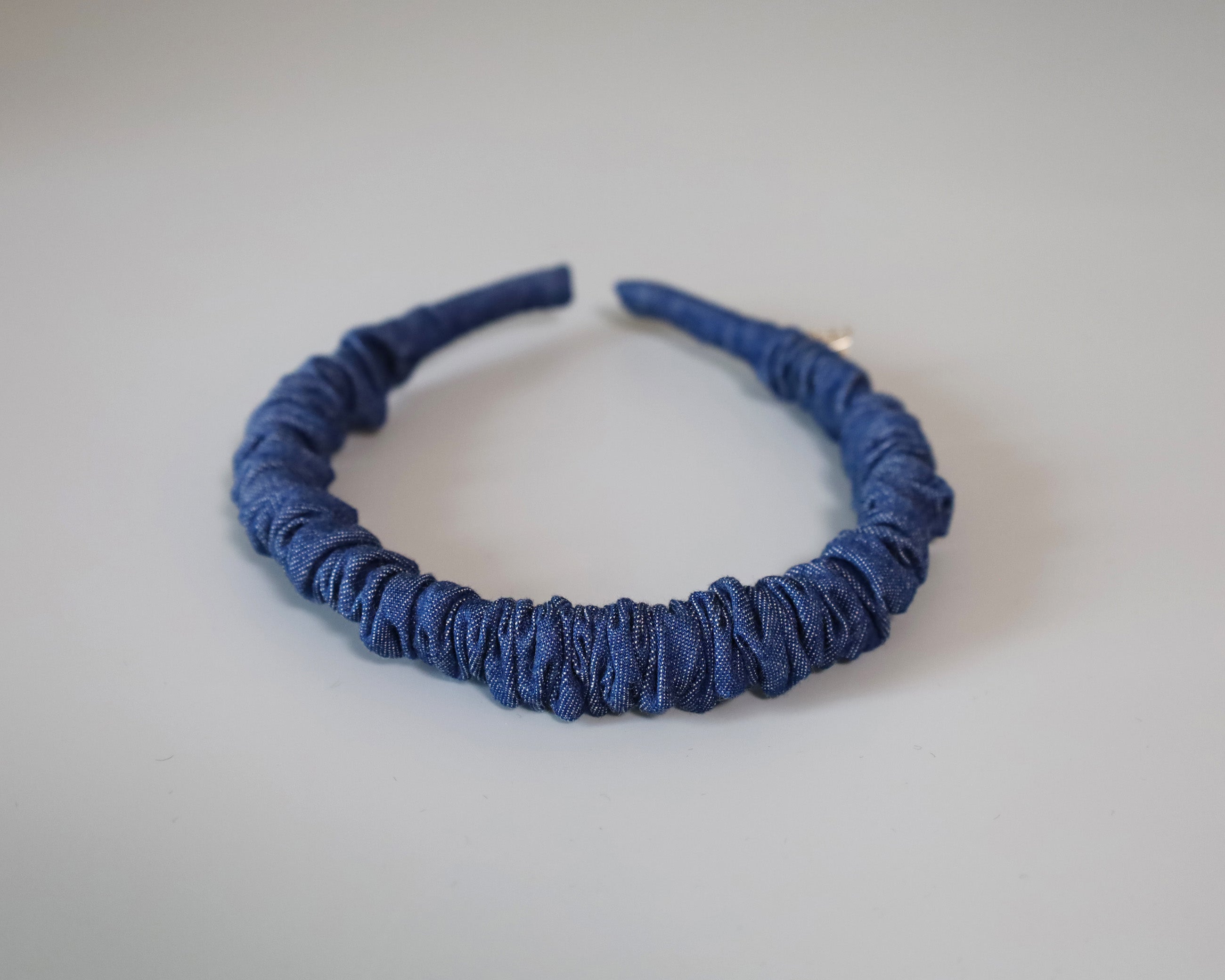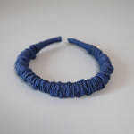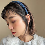 ブルーデニムで大人カジュアルな雰囲気を演出するギャザーカチューシャ。