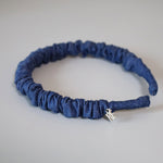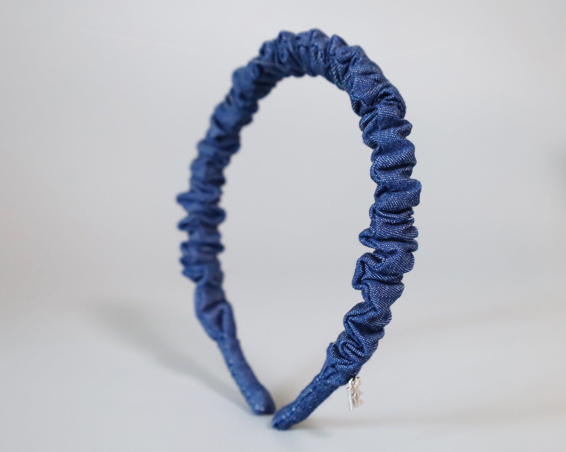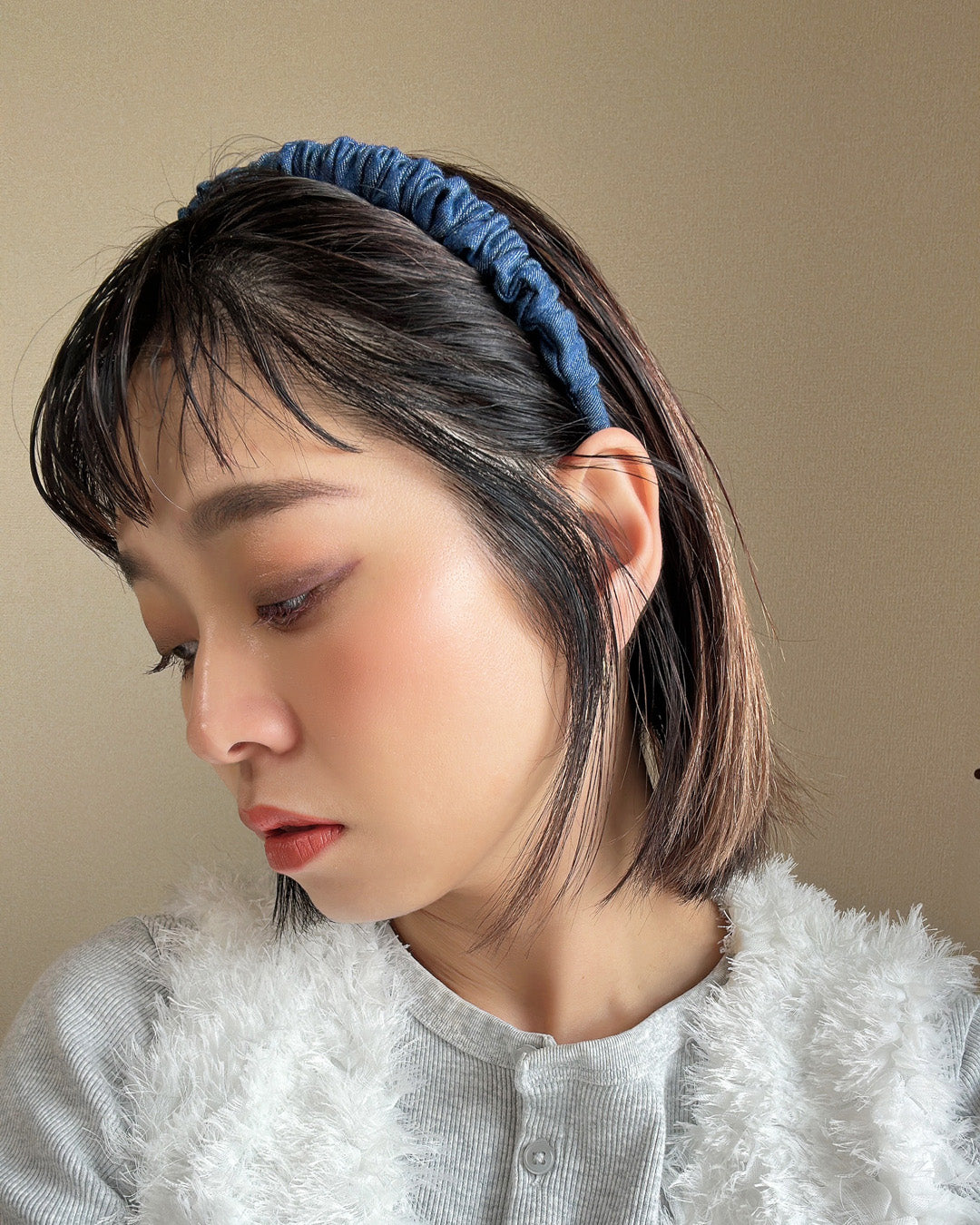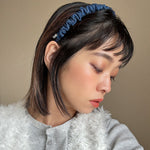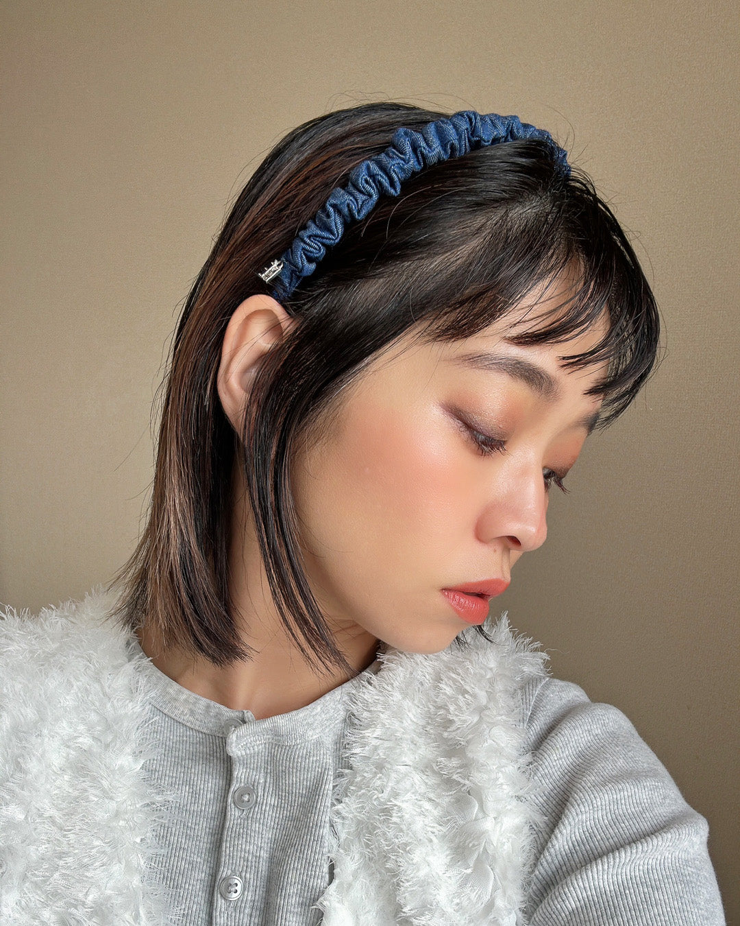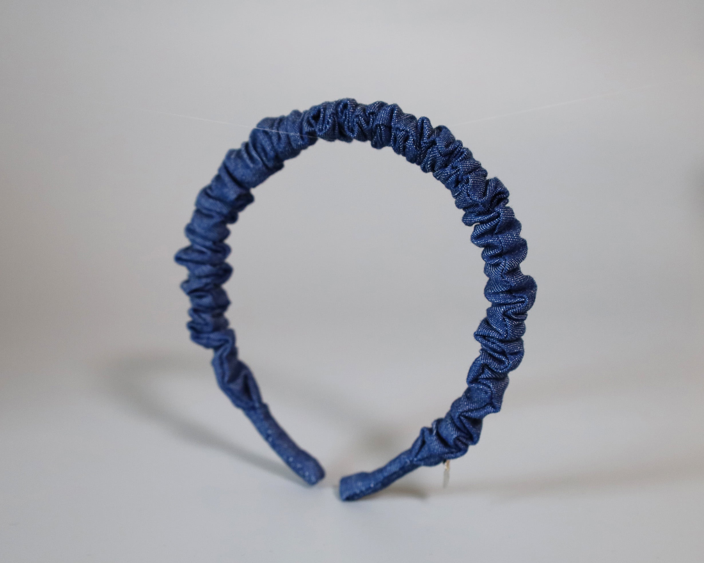 ブルーデニムで大人カジュアルな雰囲気を演出するギャザーカチューシャ。