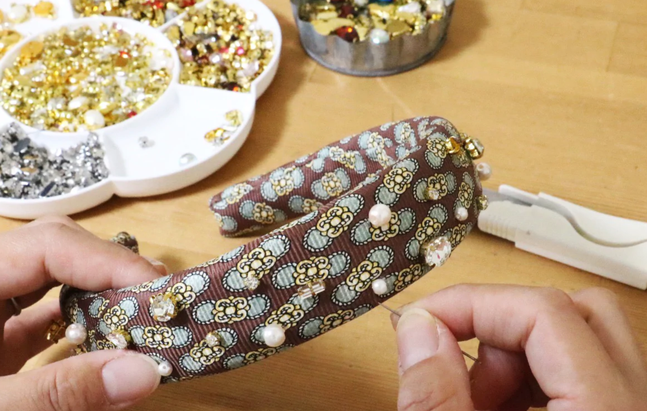 From cutting the fabric to sewing and decorating with jewels, Reactant headbands are made entirely by hand by artisans.