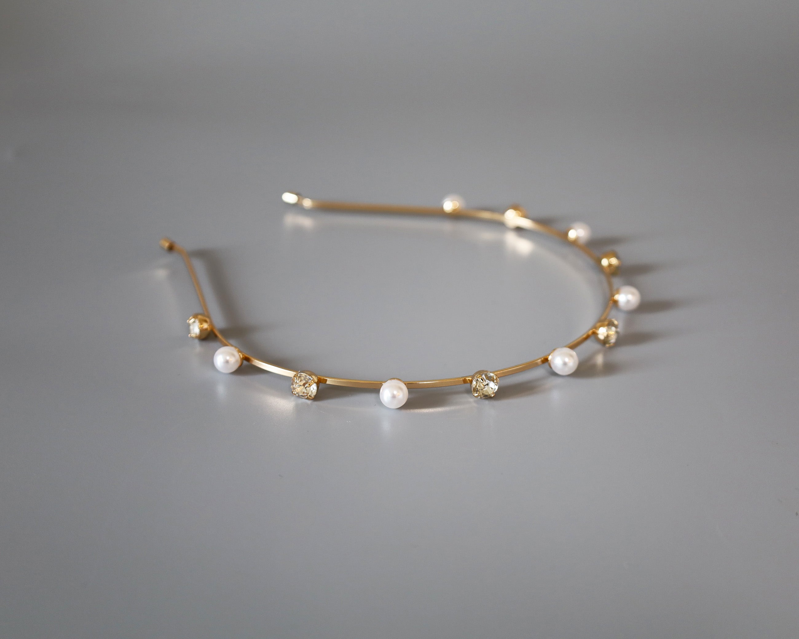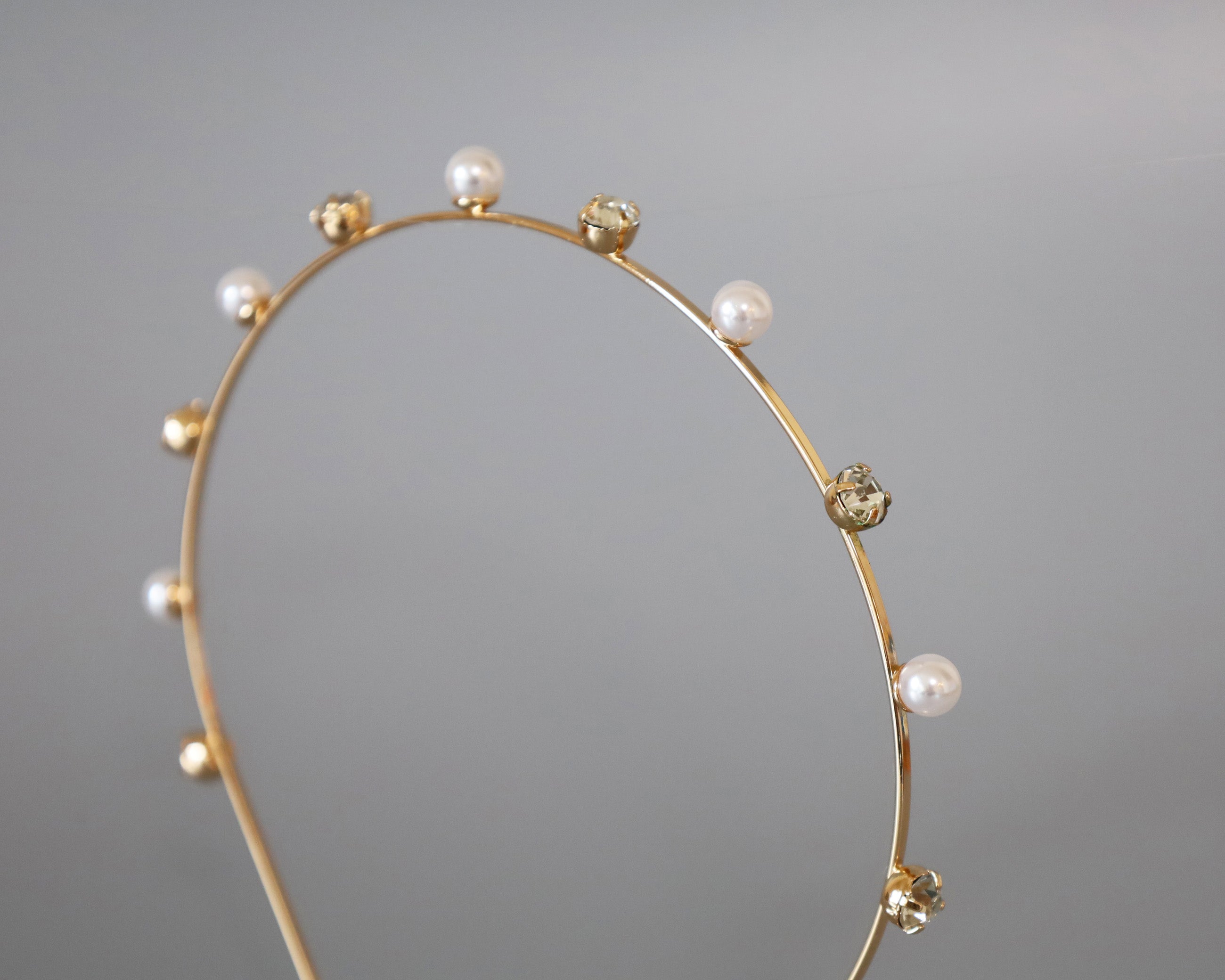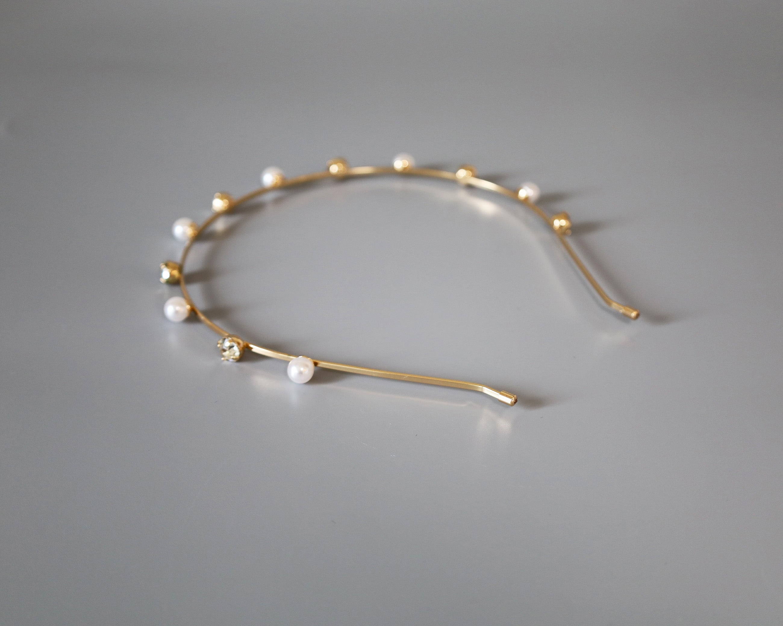 ゴールドをベースにした細身のカチューシャに、大粒のビジューとパールを交互にオン。