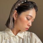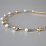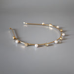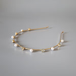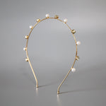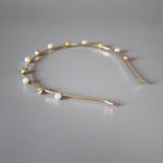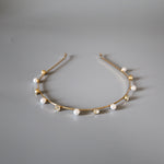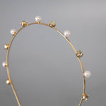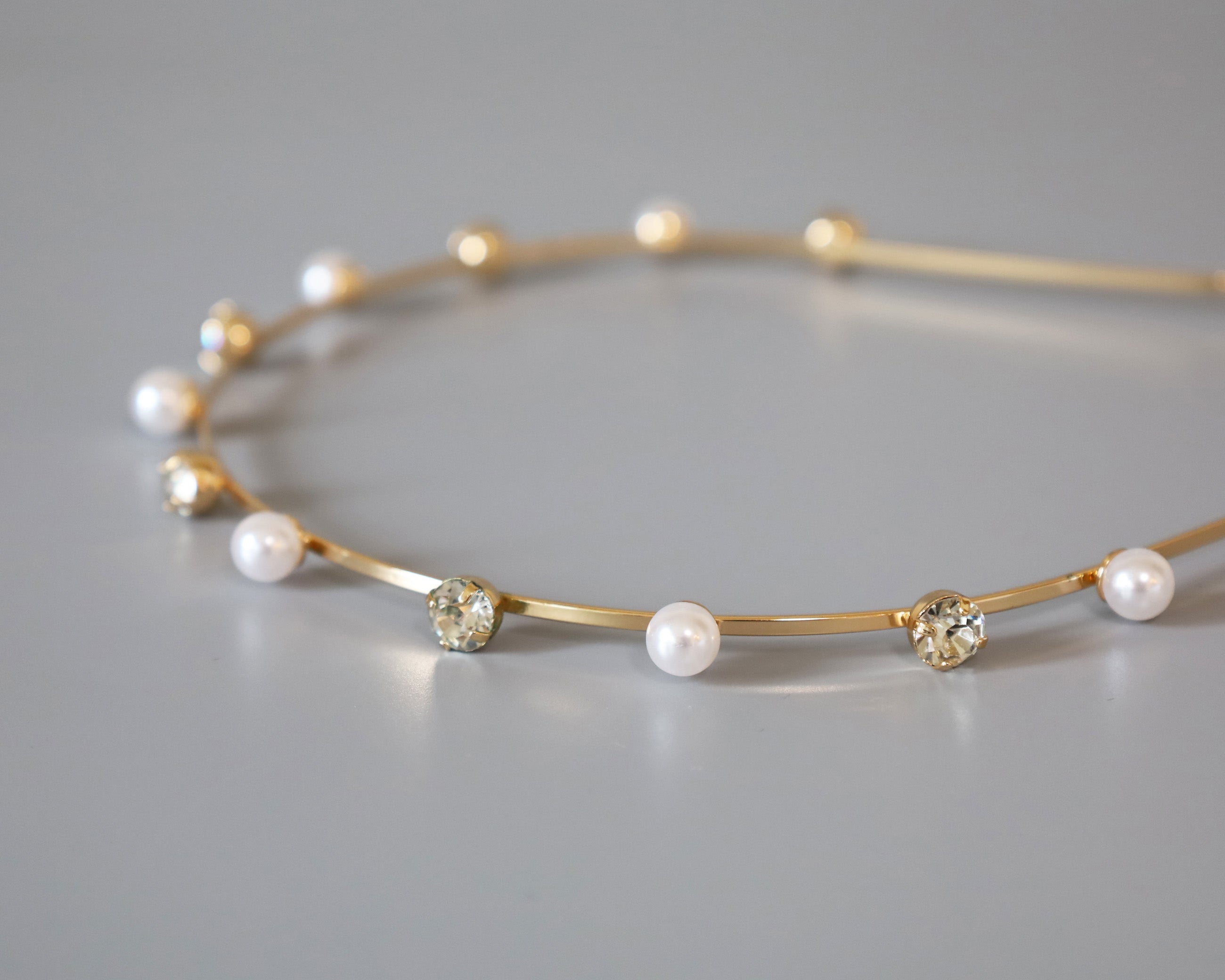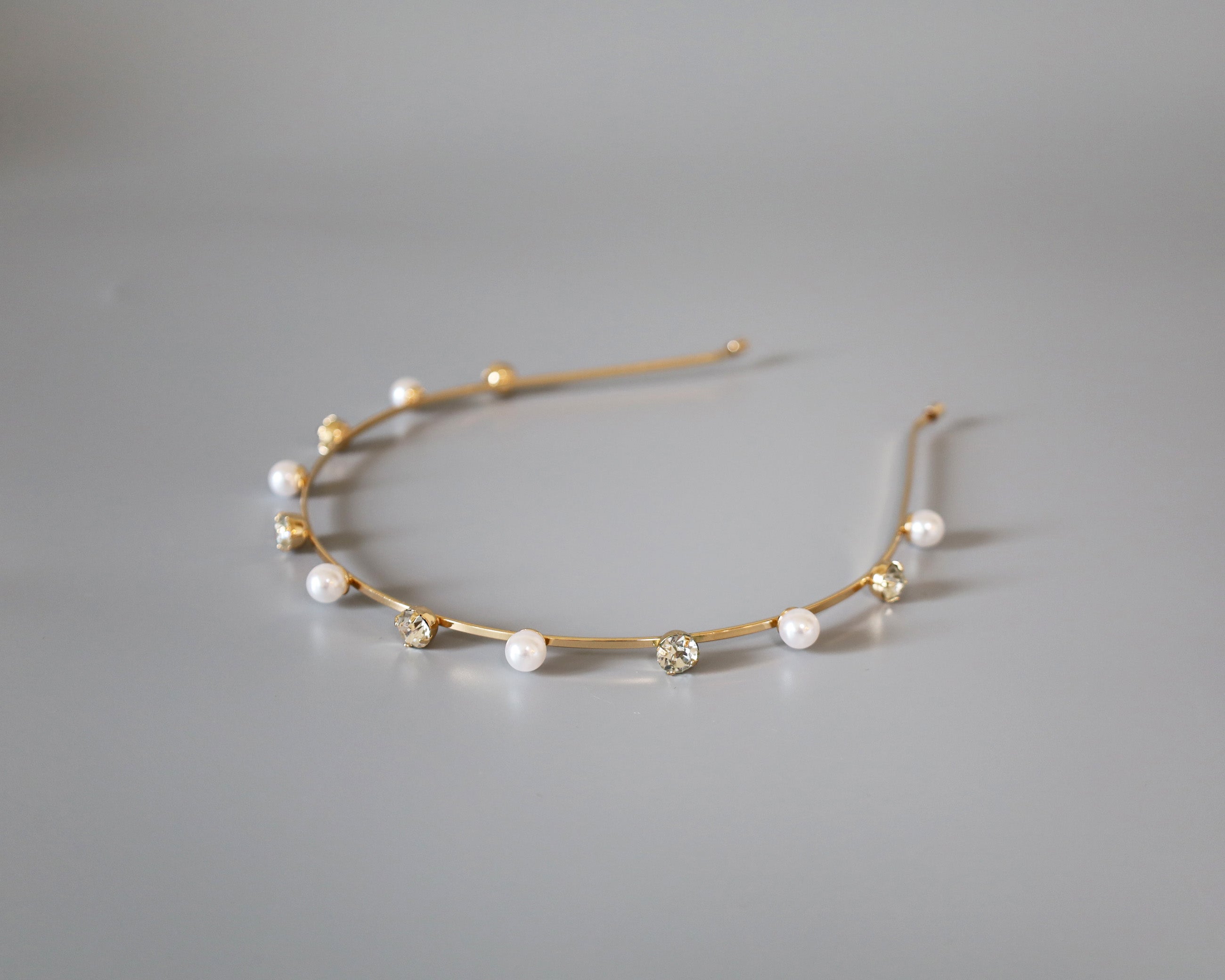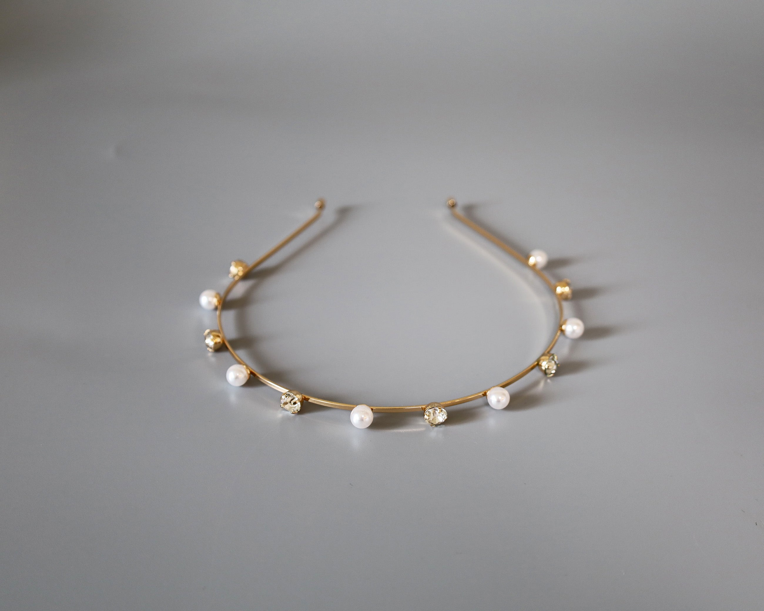 ゴールドをベースにした細身のカチューシャに、大粒のビジューとパールを交互にオン。