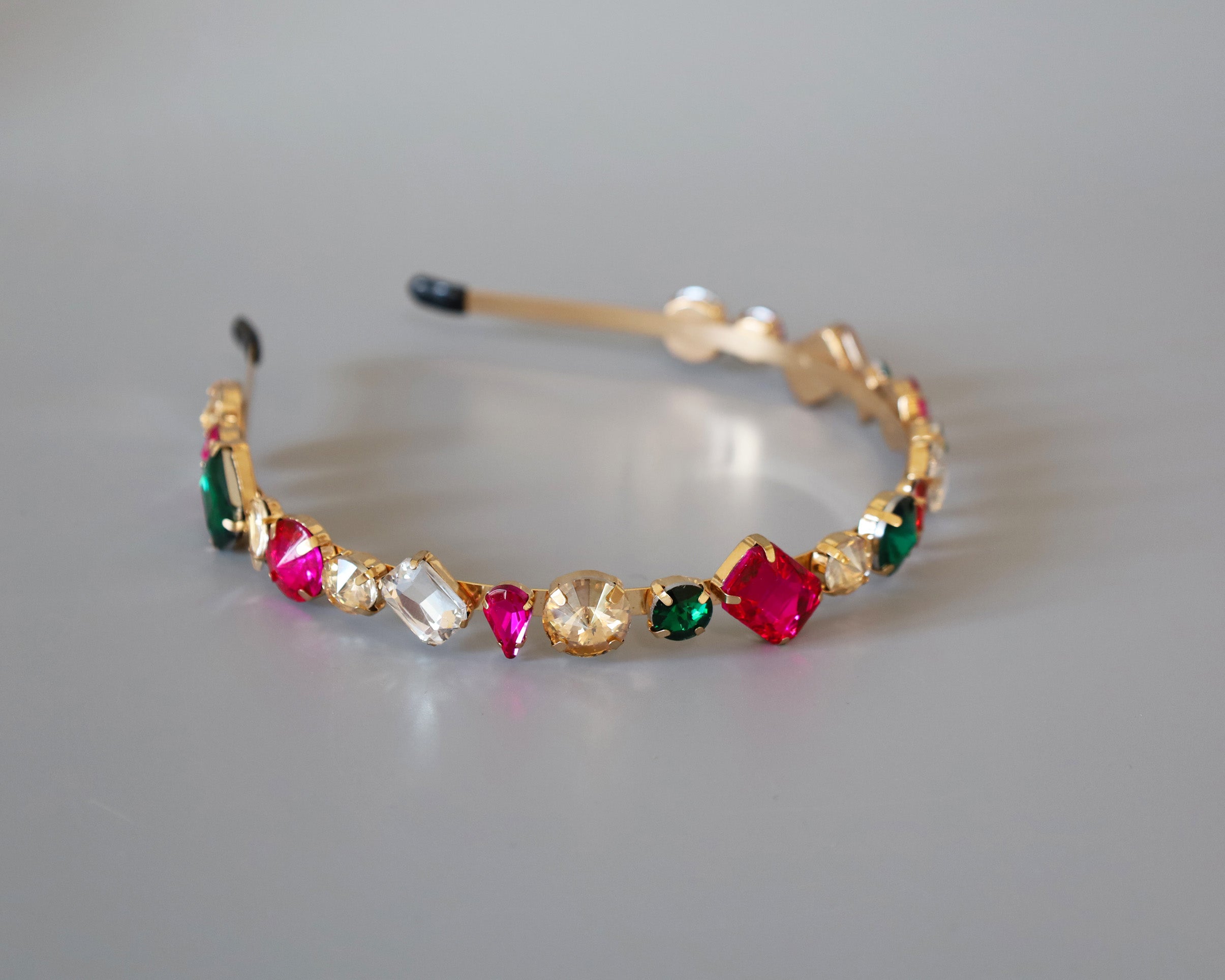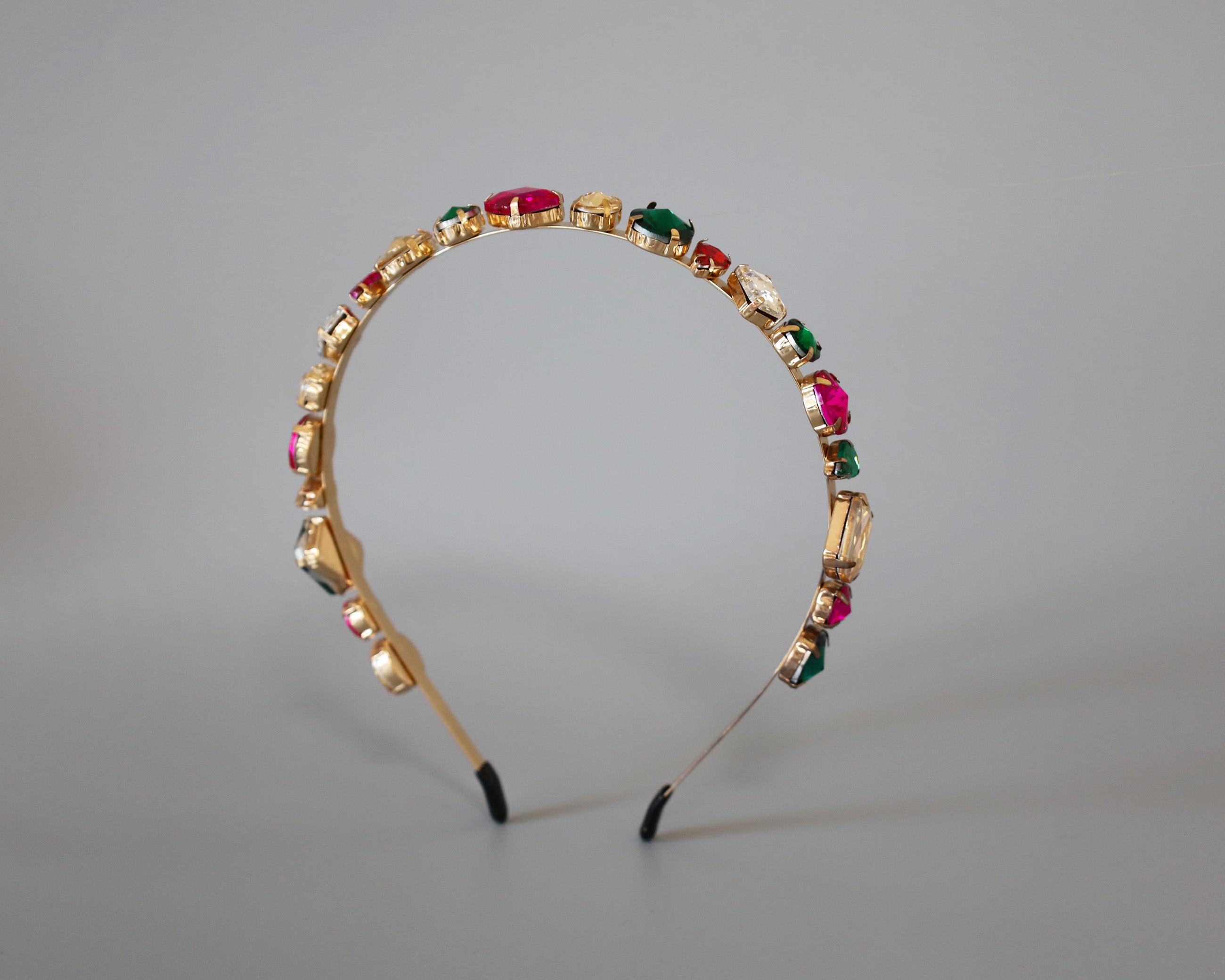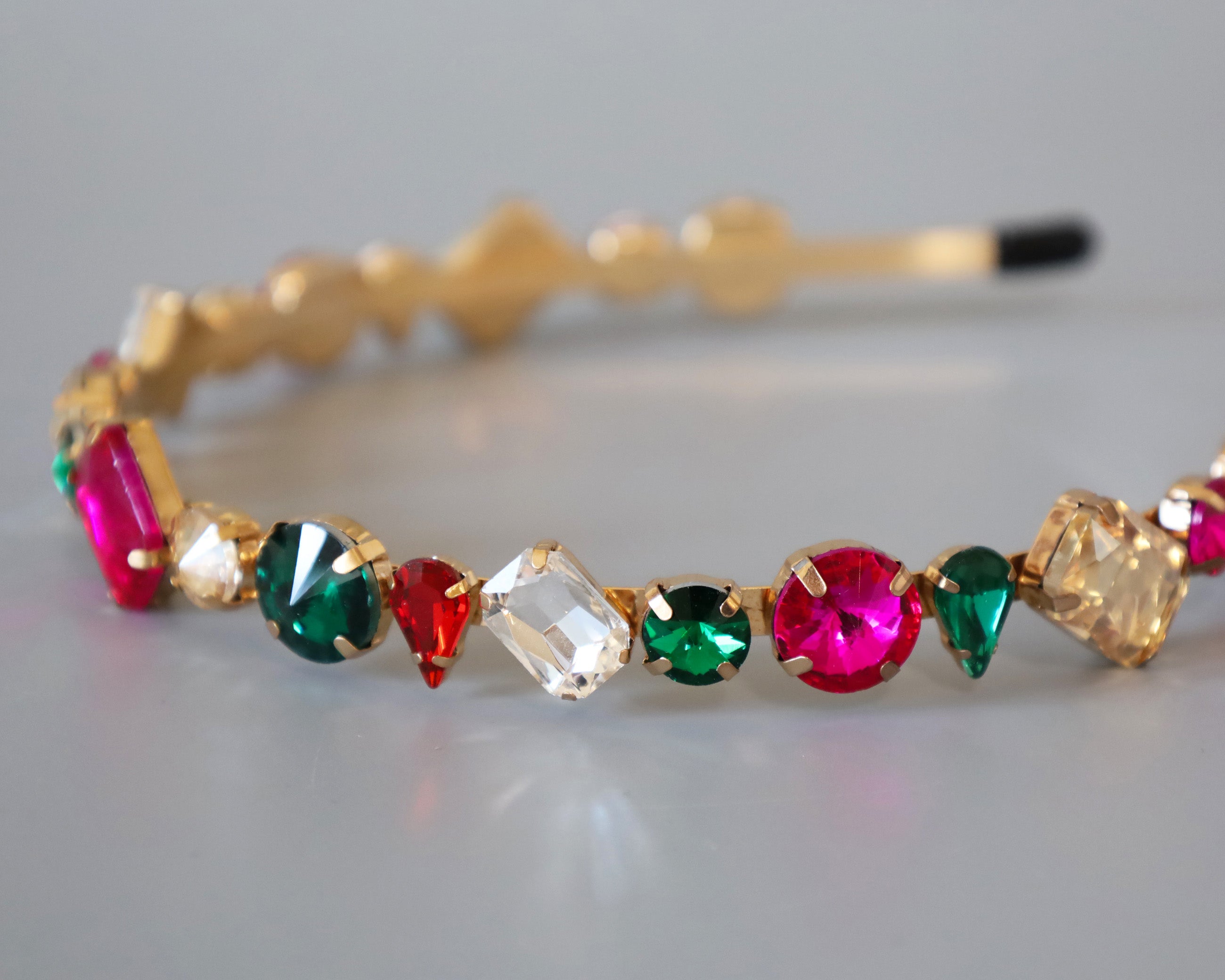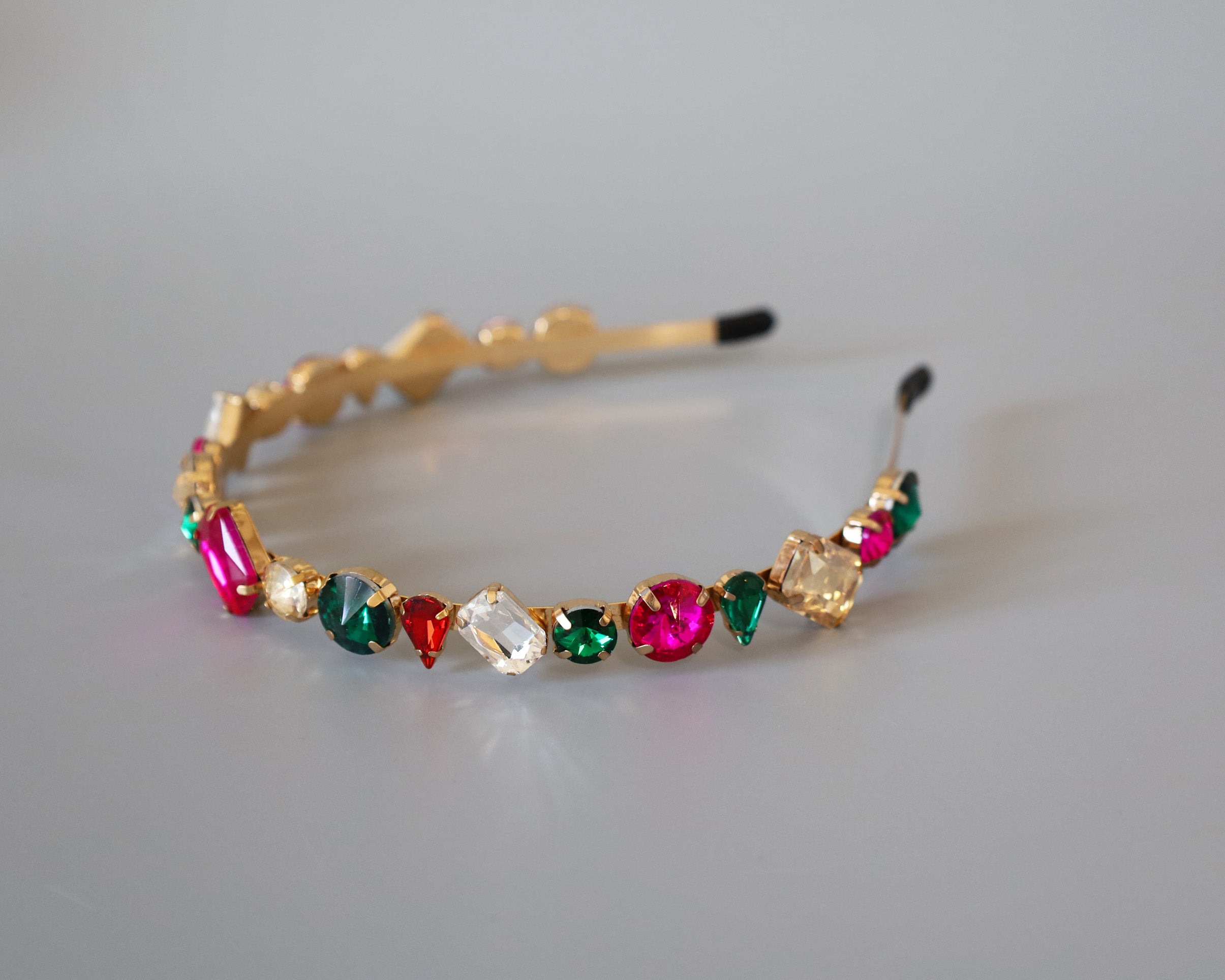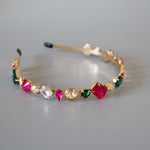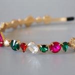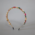ピンクやグリーンの大粒ビジューがきらめくカラフルカチューシャ。