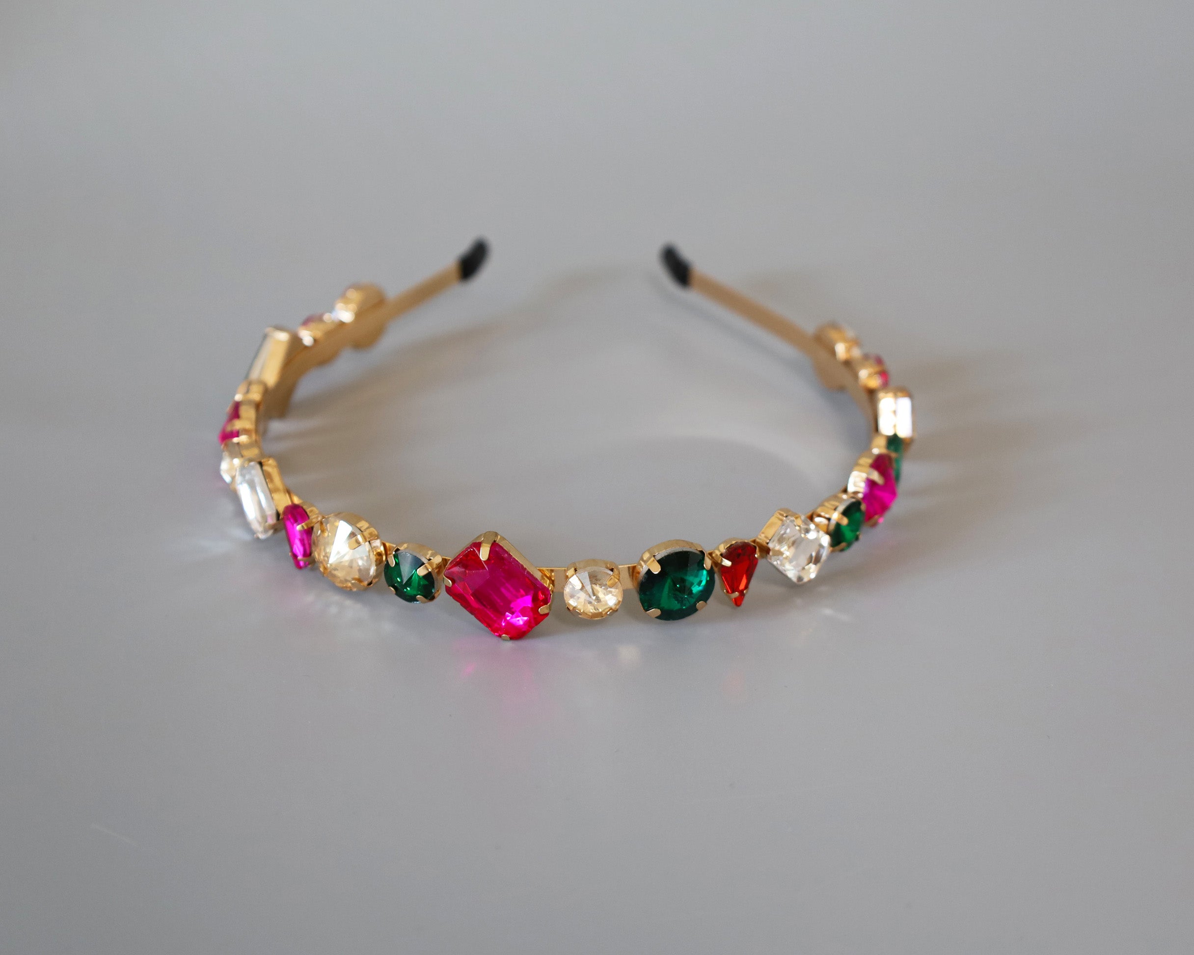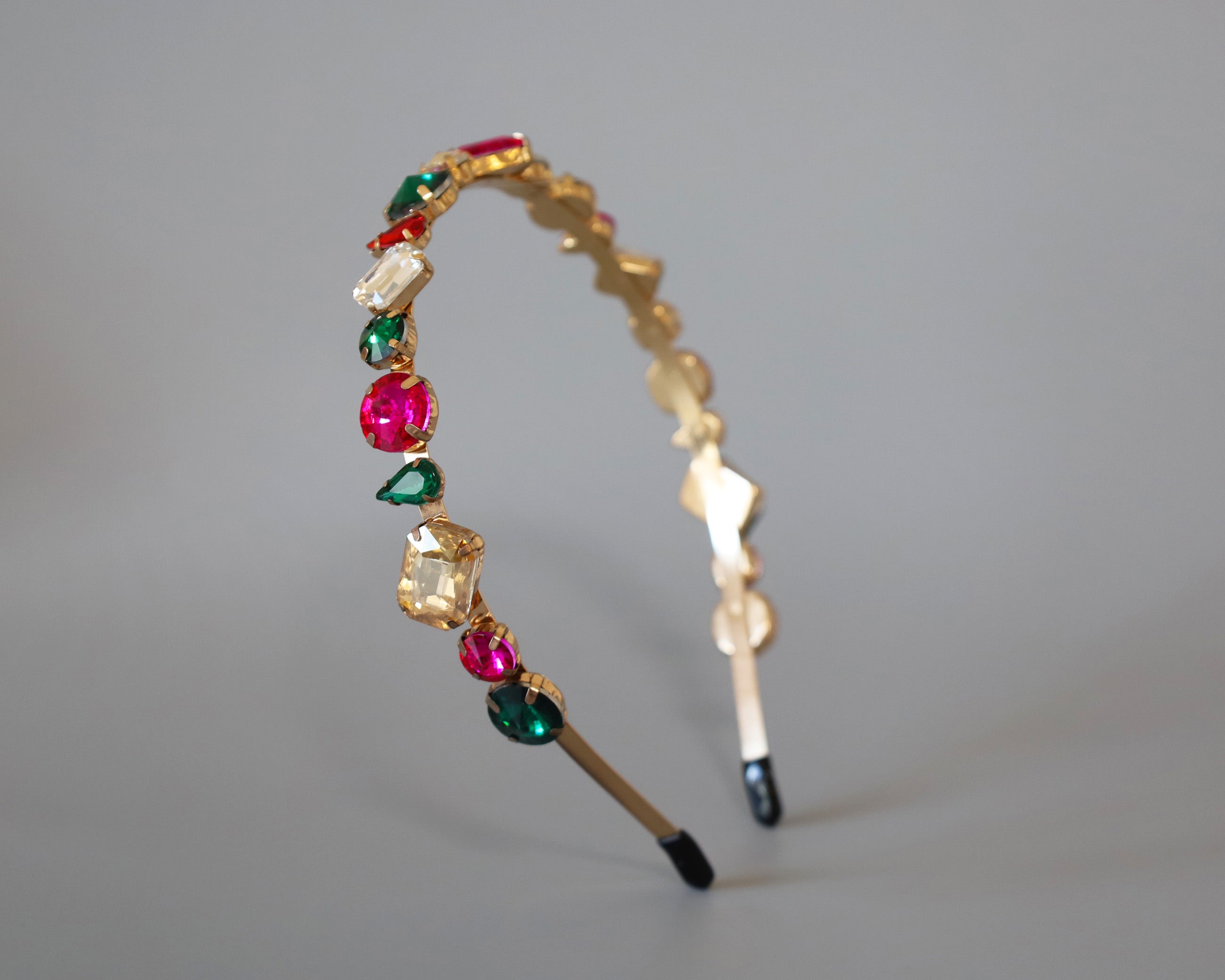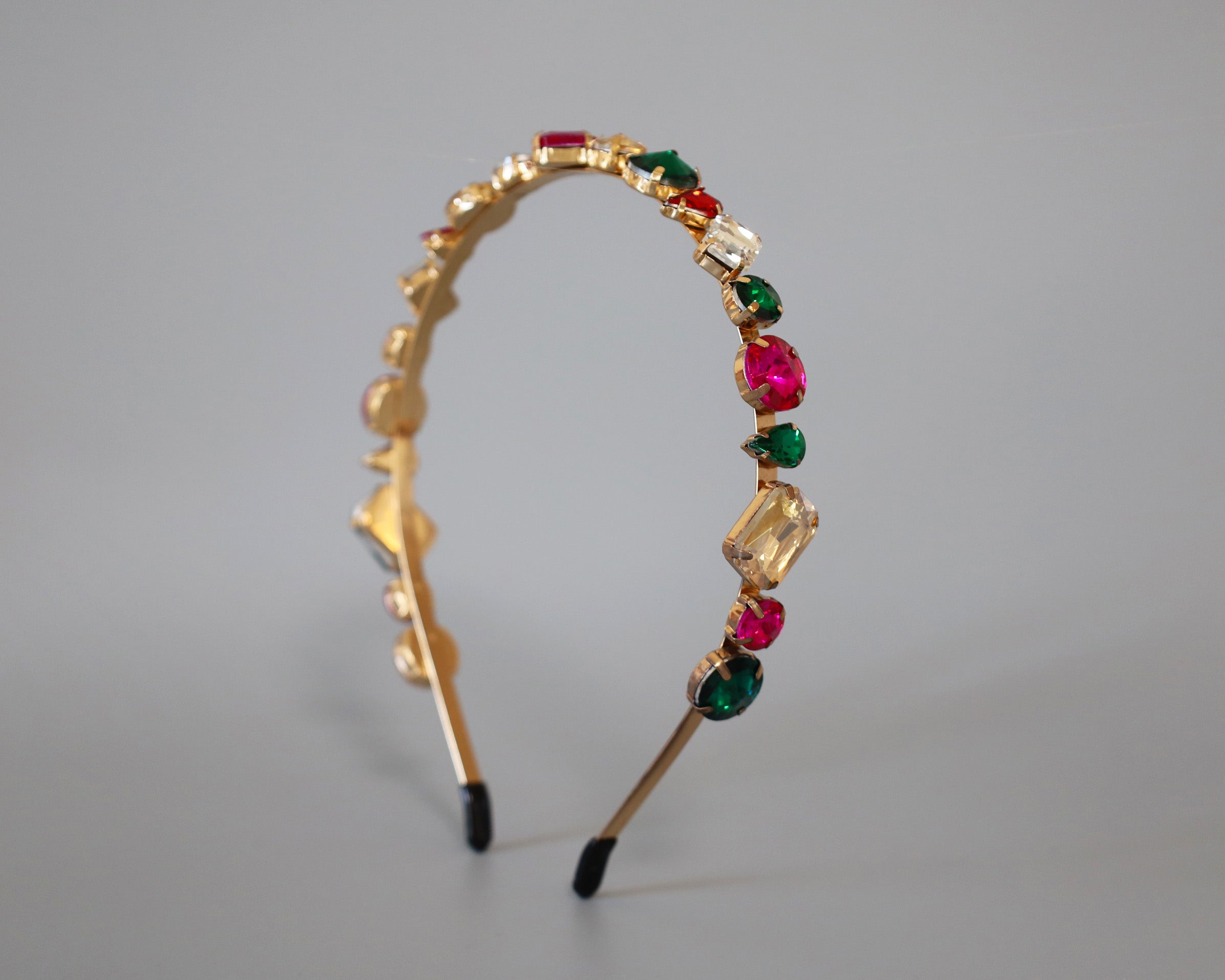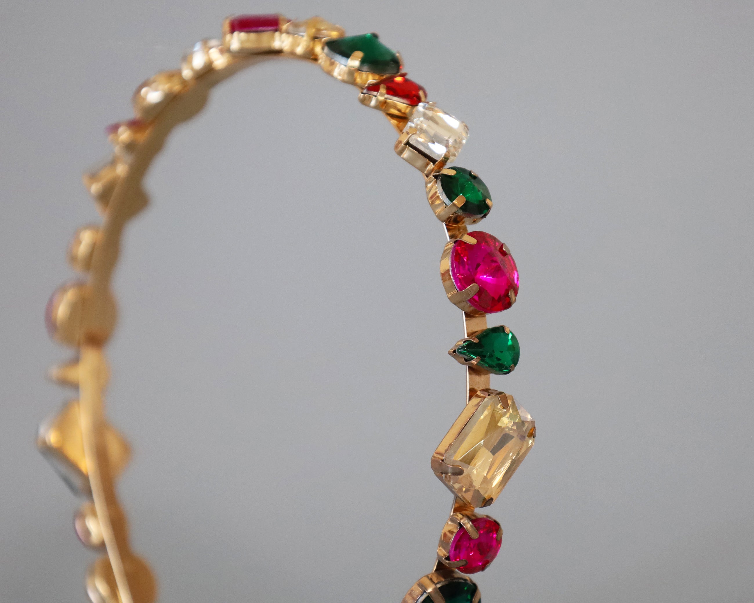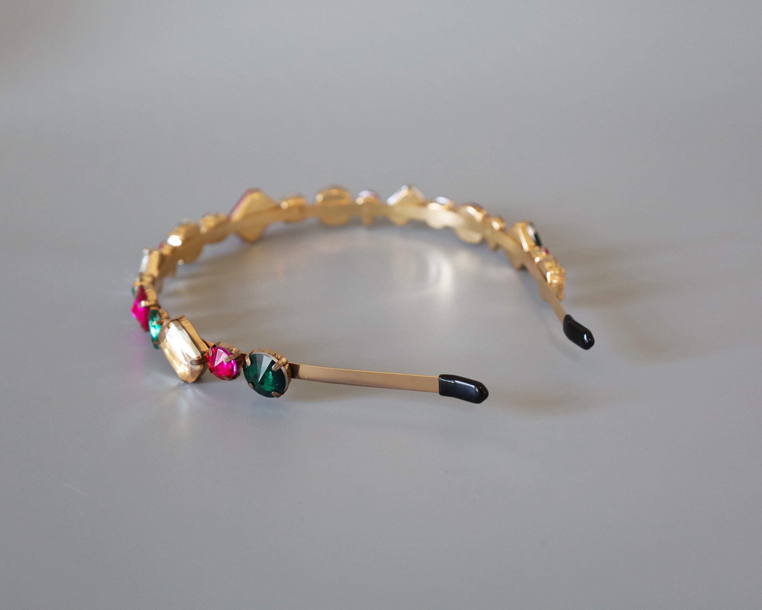 ピンクやグリーンの大粒ビジューがきらめくカラフルカチューシャ。